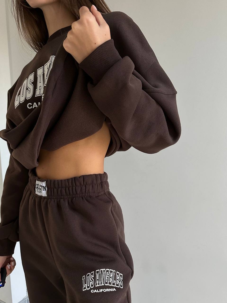 Подовжений об’ємний світшот, джогери високої посадки, на манжетах резиночки.