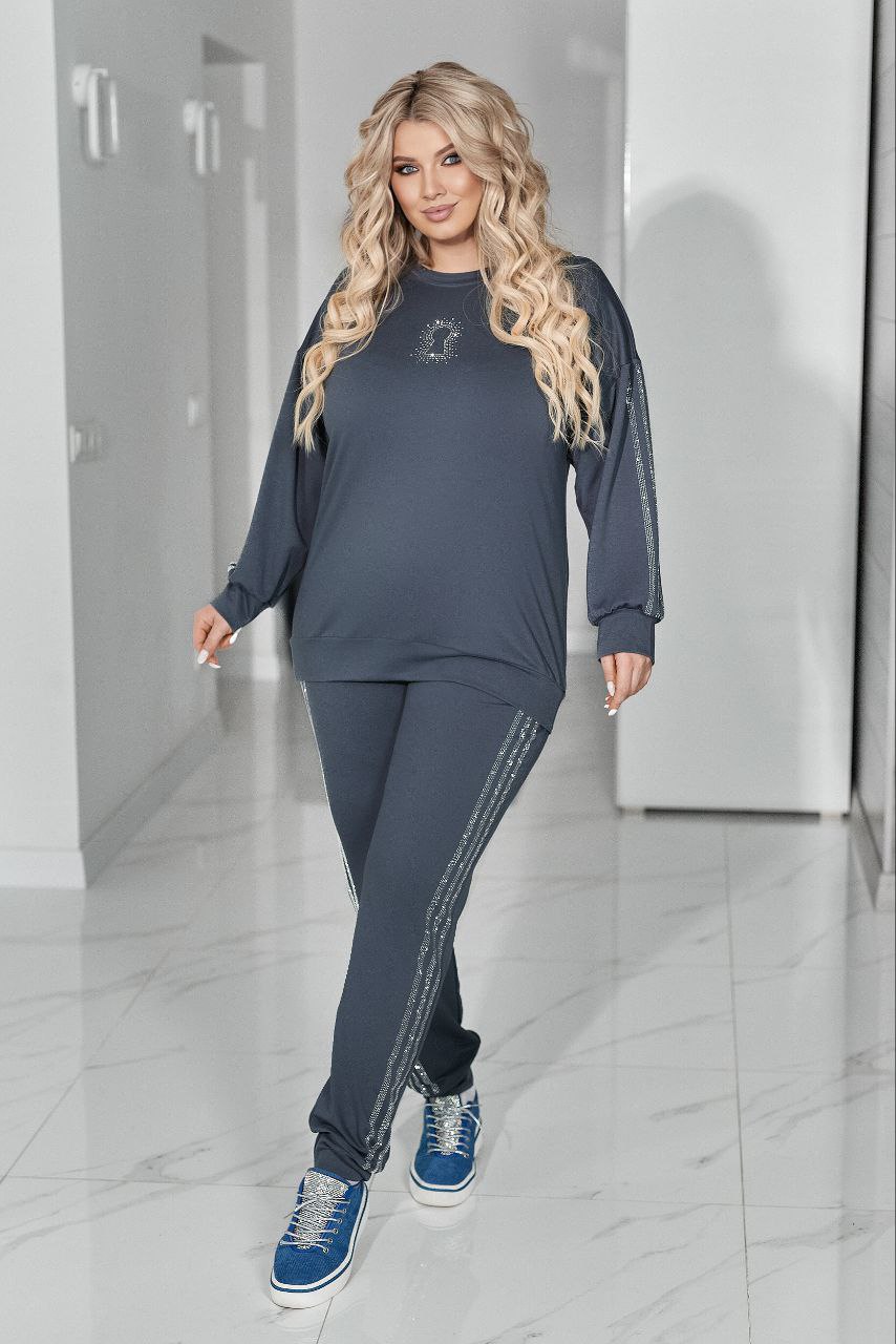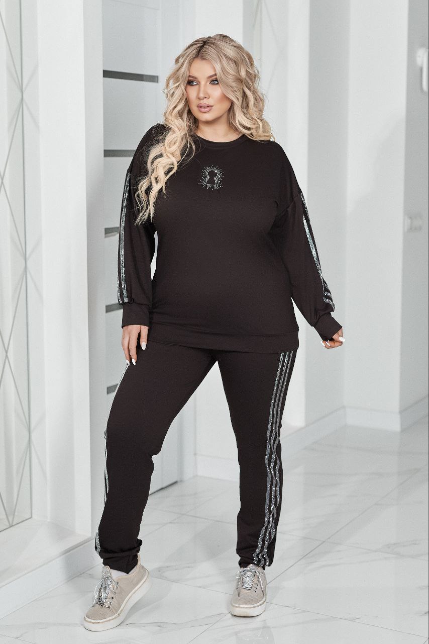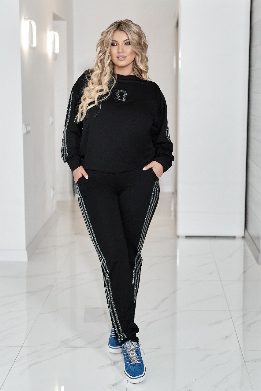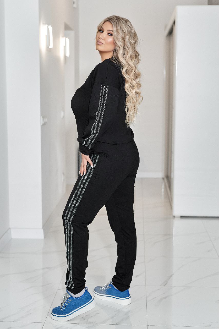 Комфортний та ефектний костюм із двухнитки чудової якості, прикрашений лампасами та візерунком ” замок” зі страз.