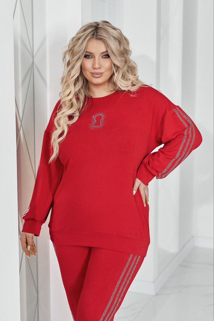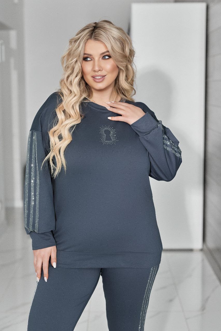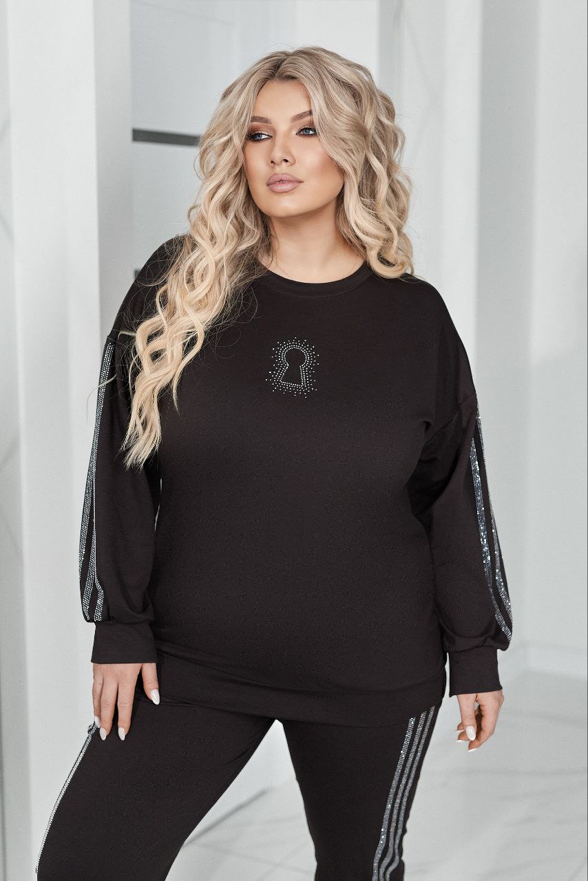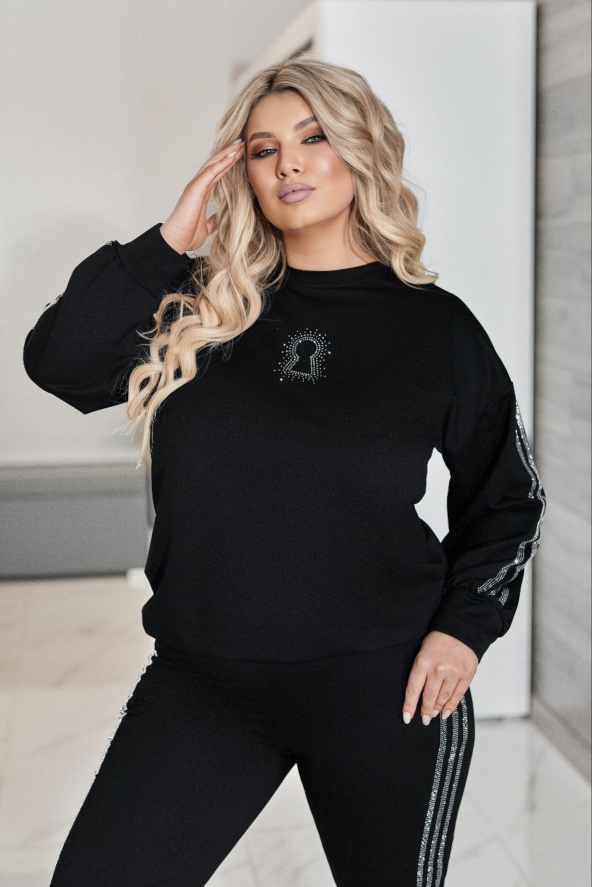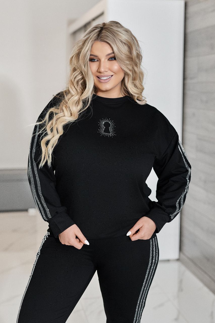 Комфортний та ефектний костюм із двухнитки чудової якості, прикрашений лампасами та візерунком ” замок” зі страз.