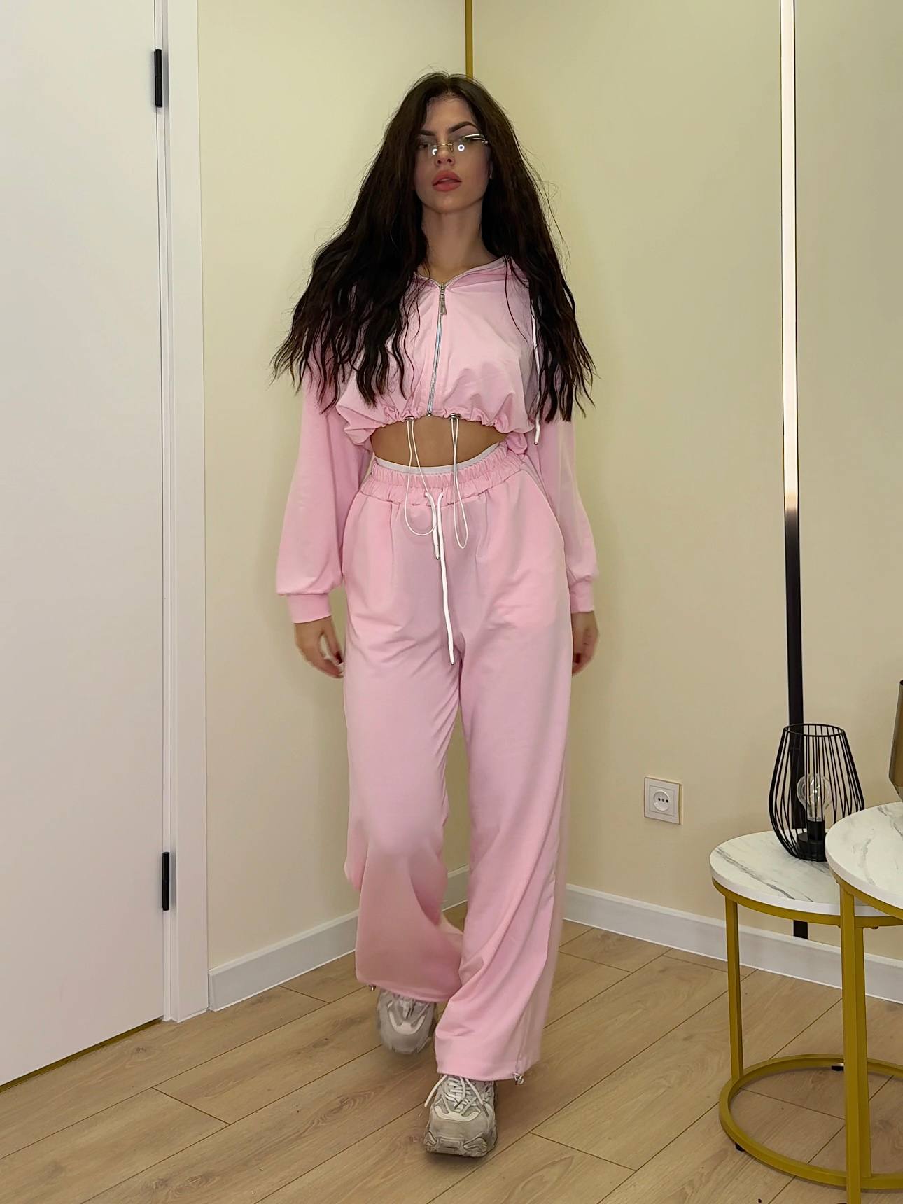 Худі на замку з капюшоном та вільним кроєм підкреслює сучасний oversize-стиль. Штани прямого фасону з високою посадкою та еластичним поясом забезпечують комфорт і свободу рухів