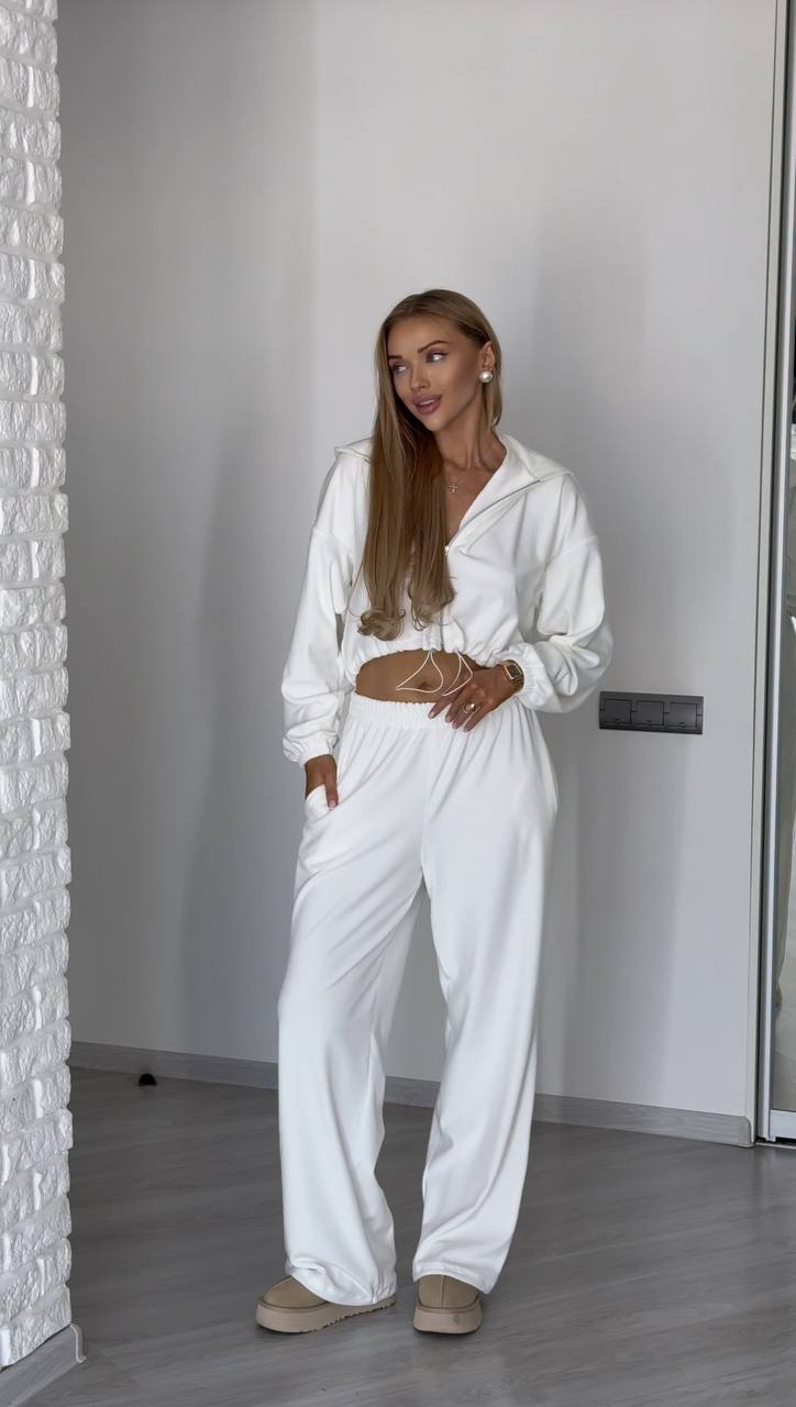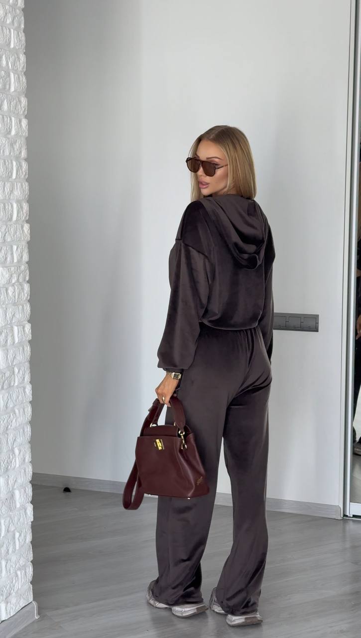 Велюровий костюм, у якому хочеться проводити цілий день – м’яка кофта знизу на затяжках, огортає комфортом, а штани на затяжках , підкреслюють легкість рухів.