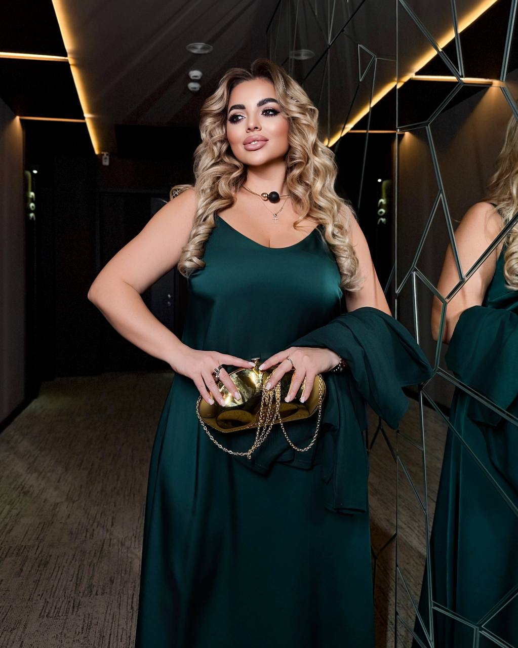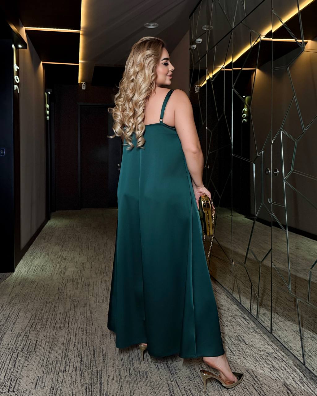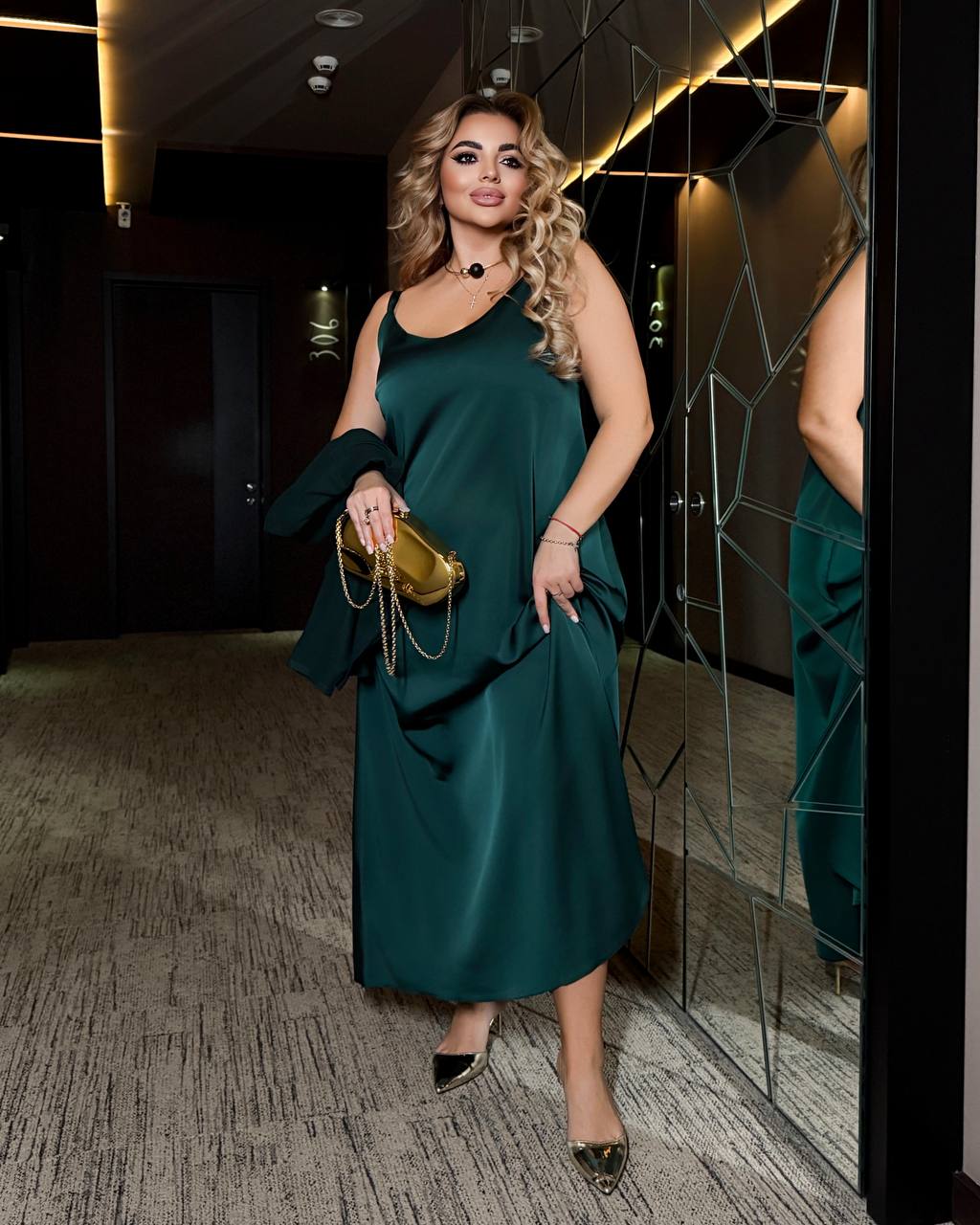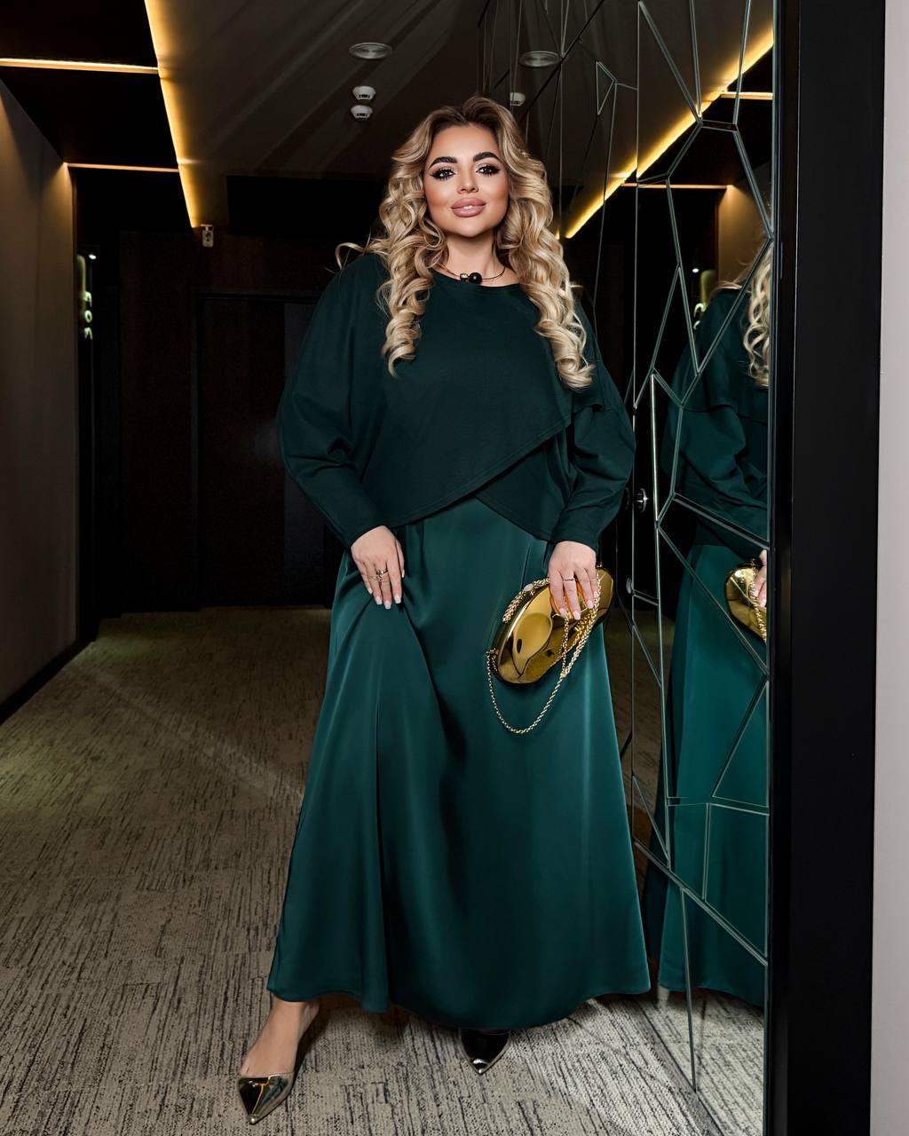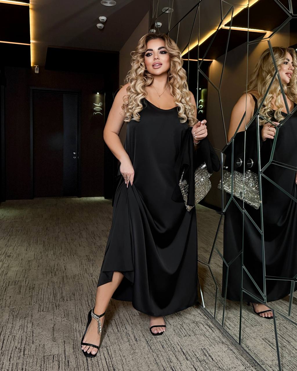 Сукня виконана з ніжного дабл шовку преміальної якості — струмка, легка, красиво сідає по фігурі та створює ефект святкового блиску.