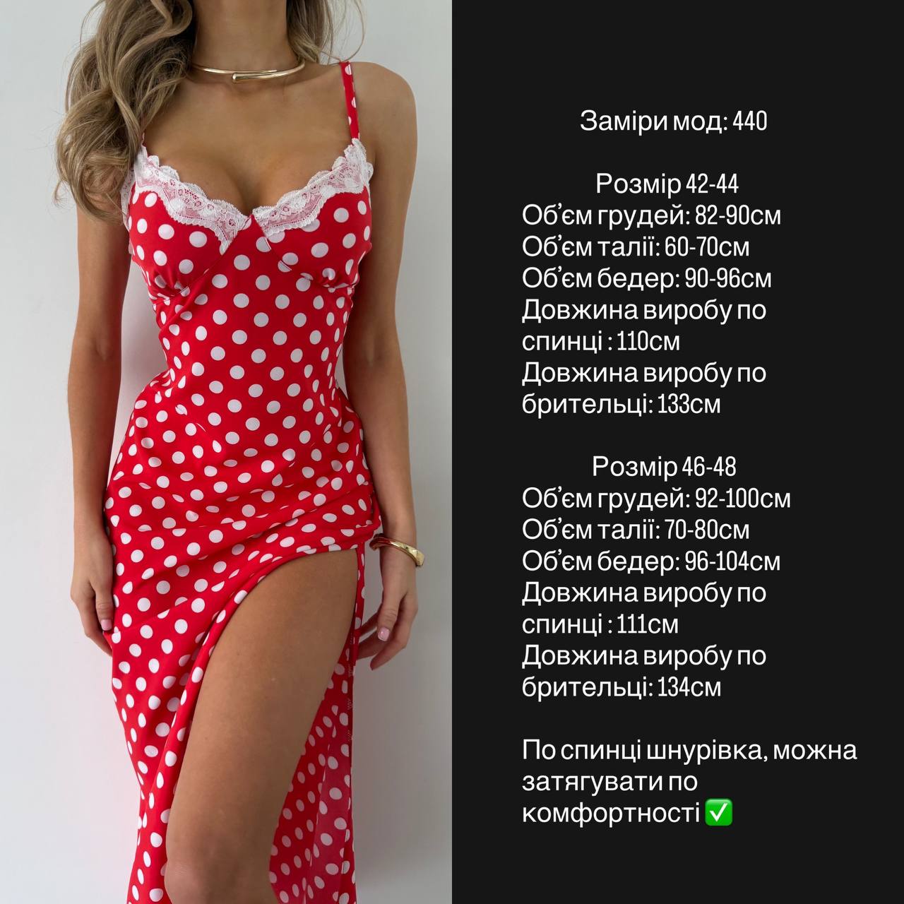 Якщо ви яскрава особистість, вам подобається змінюватися, приміряти нові образи та стилі, значить сукня в горошок зі шнурівкою на спинці створена саме для вас.