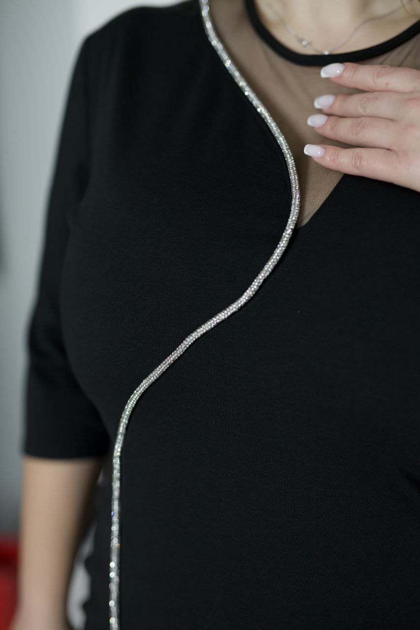 ■ Головний акцент — оздоблення блискучим шнурком зі стразами 3D, який м’яко окреслює лінію вирізу й візуально подовжує силует ✨