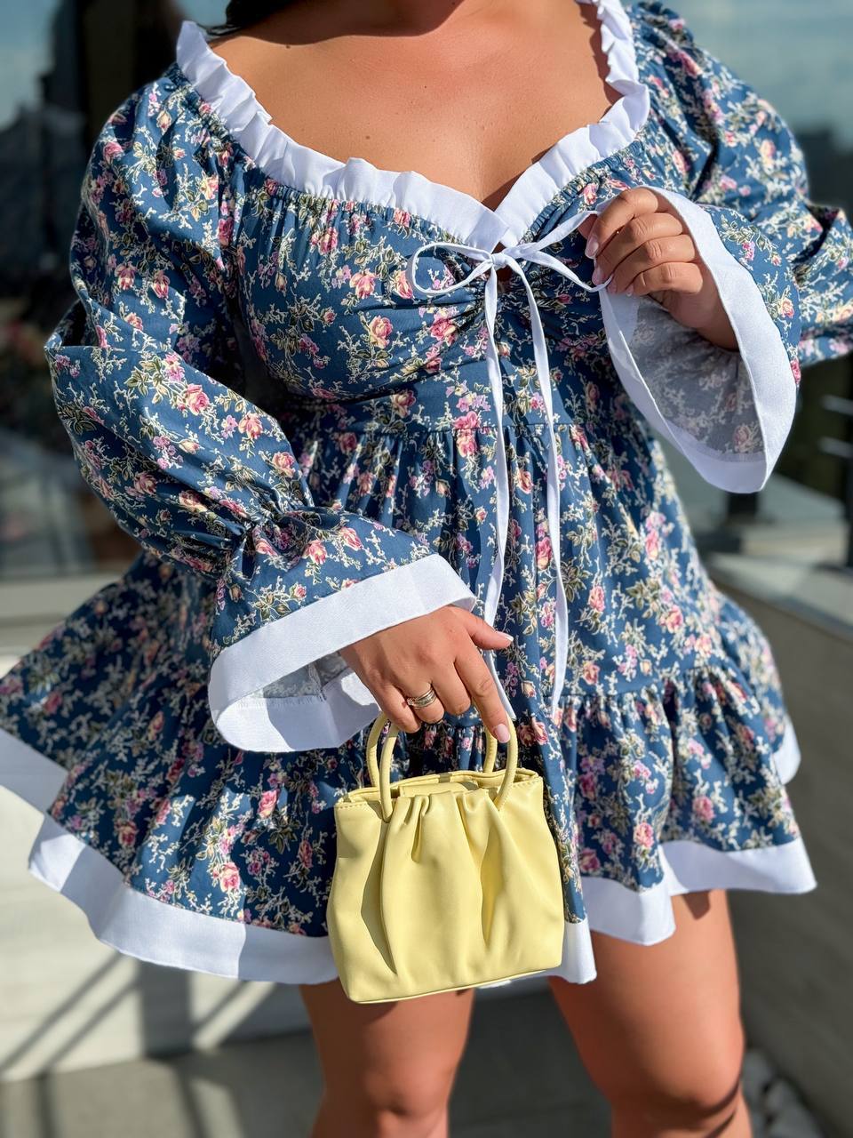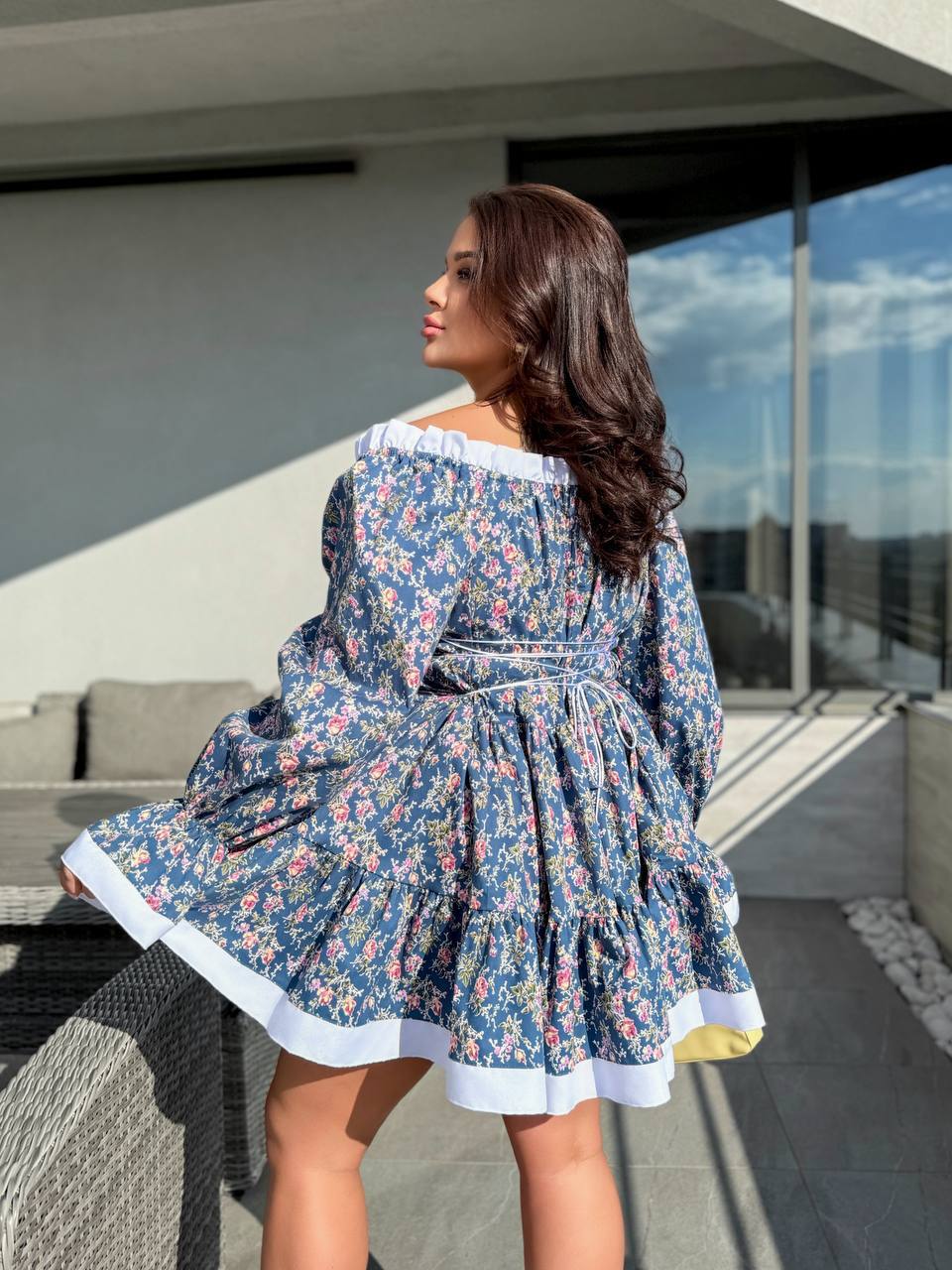 Матеріал: коттон, дуже гарна натуральна, приятна на дотик тканина. Сукню можна моделювати: мотузочки, розташовані в районі грудей, можна зав’язати бантиком або завʼязати на шию . Позаду є шнурівка , яка регулює приталеність. По плечах – гумка, завдяки якій можна закрити або обнажити плечі. Довжина від талії. 47 см – в 1 р. В 2,3,4 р – 50 см
