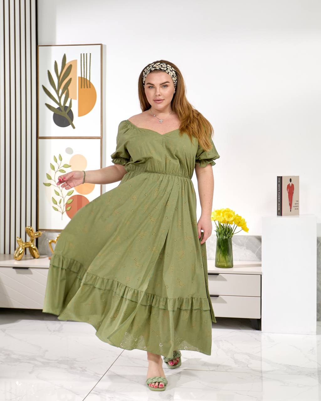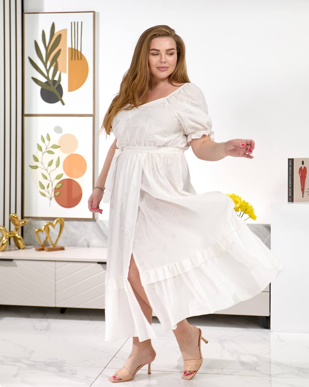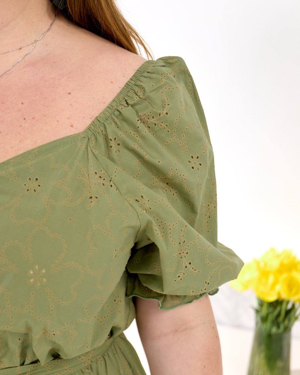 Легка та зручна міді сукня з поясом, рукава і талія на легкій резинці. Попереду глибокий запах та розріз.