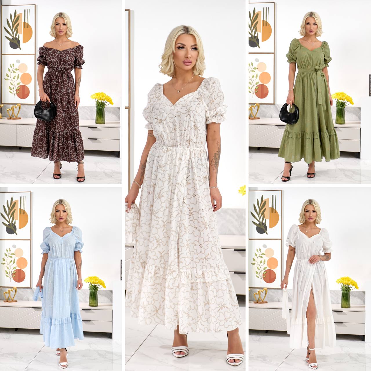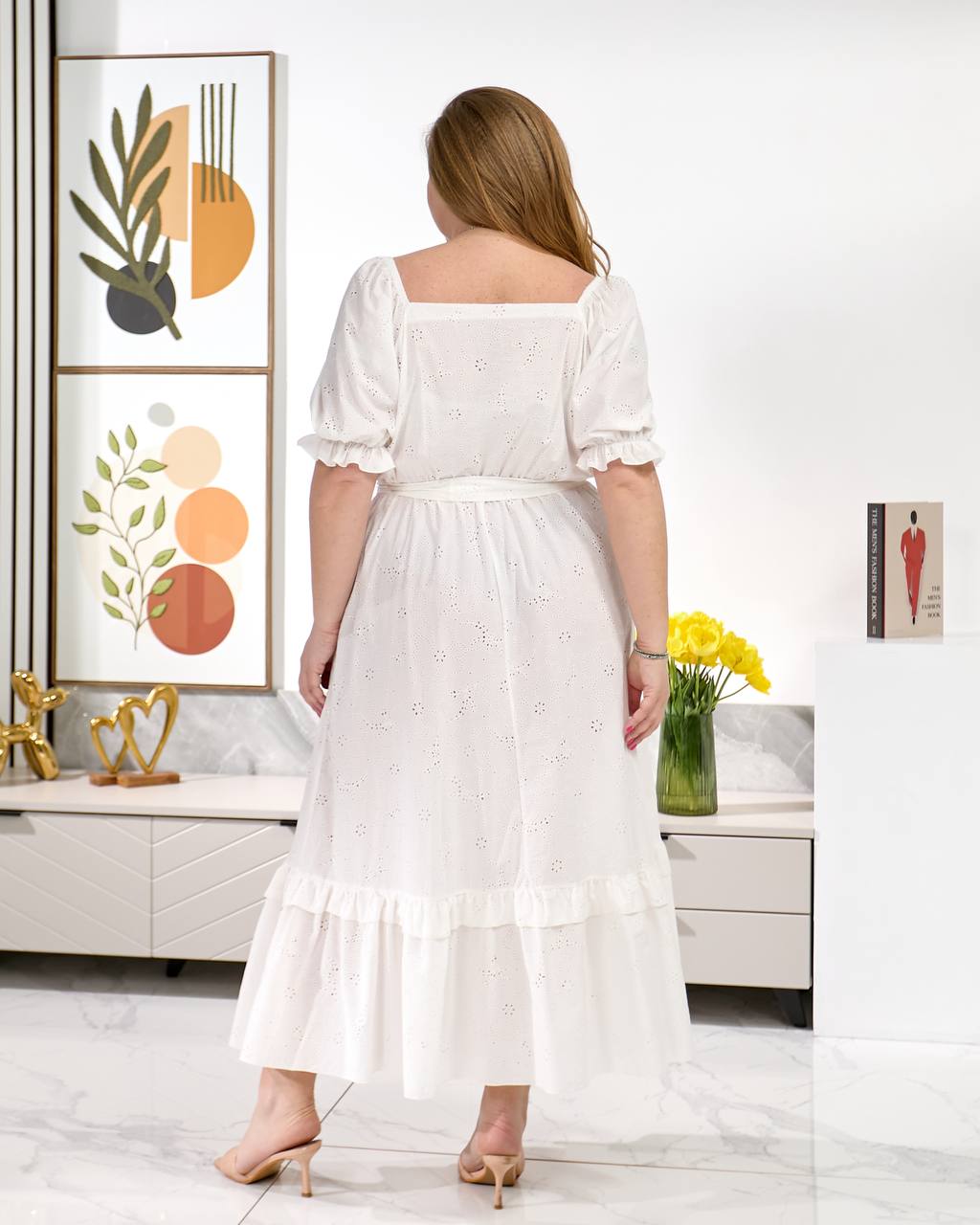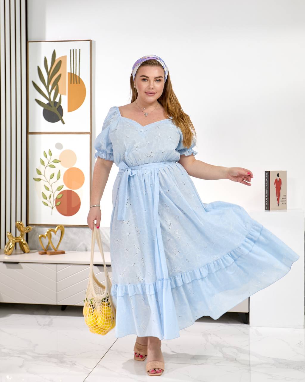 Легка та зручна міді сукня з поясом, рукава і талія на легкій резинці. Попереду глибокий запах та розріз.