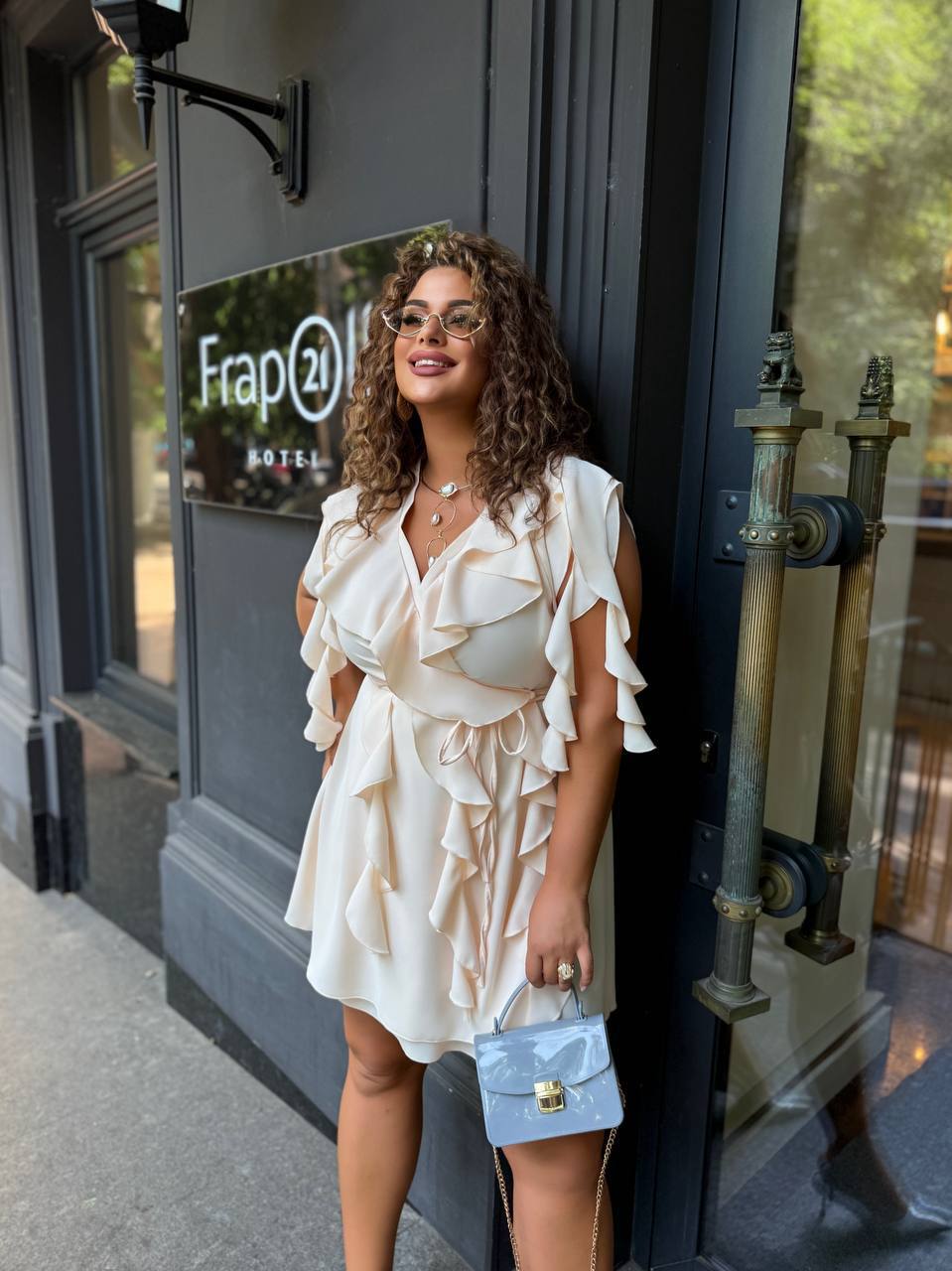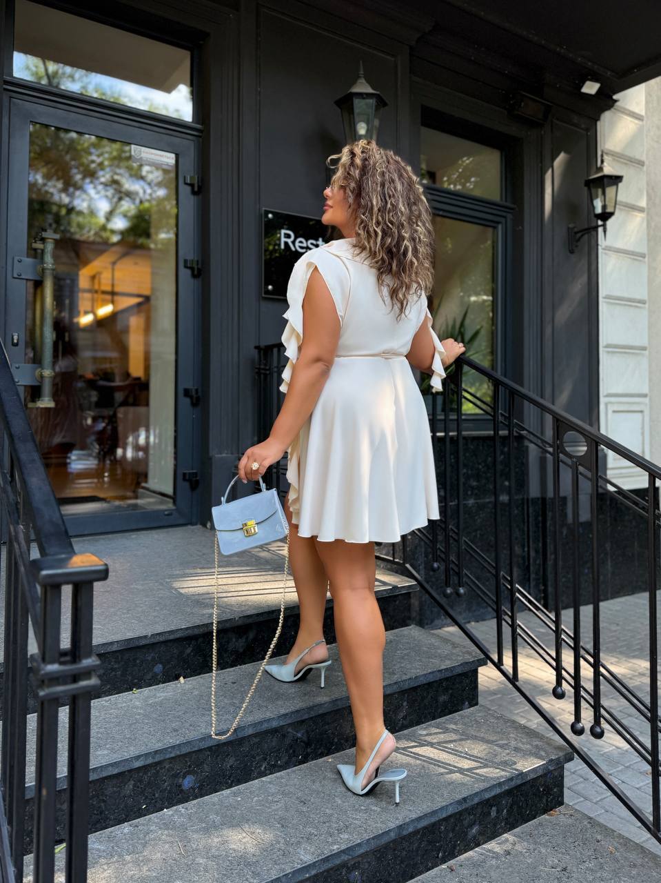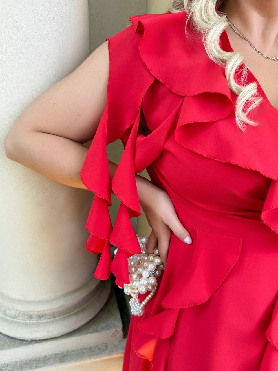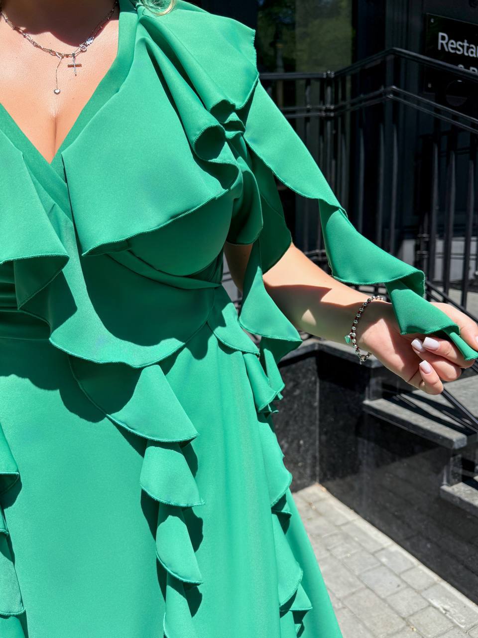 Матеріал: Прада (шовковиста, скользяща, приятна тканина) , довжина від талії 51 см, одягається на запах. Ідеальна посадка. Спідниця-напівсонце – не повнить. Легке, приємне до тіла. Прикрашення – паси – Тренд цього сезону. Вони роблять сукню воздушной, придають шарм.