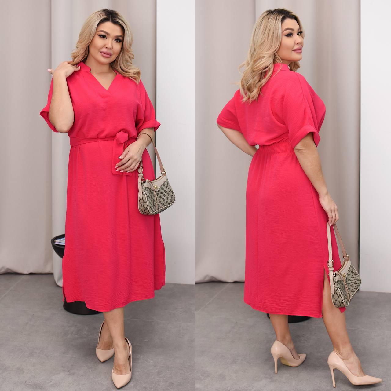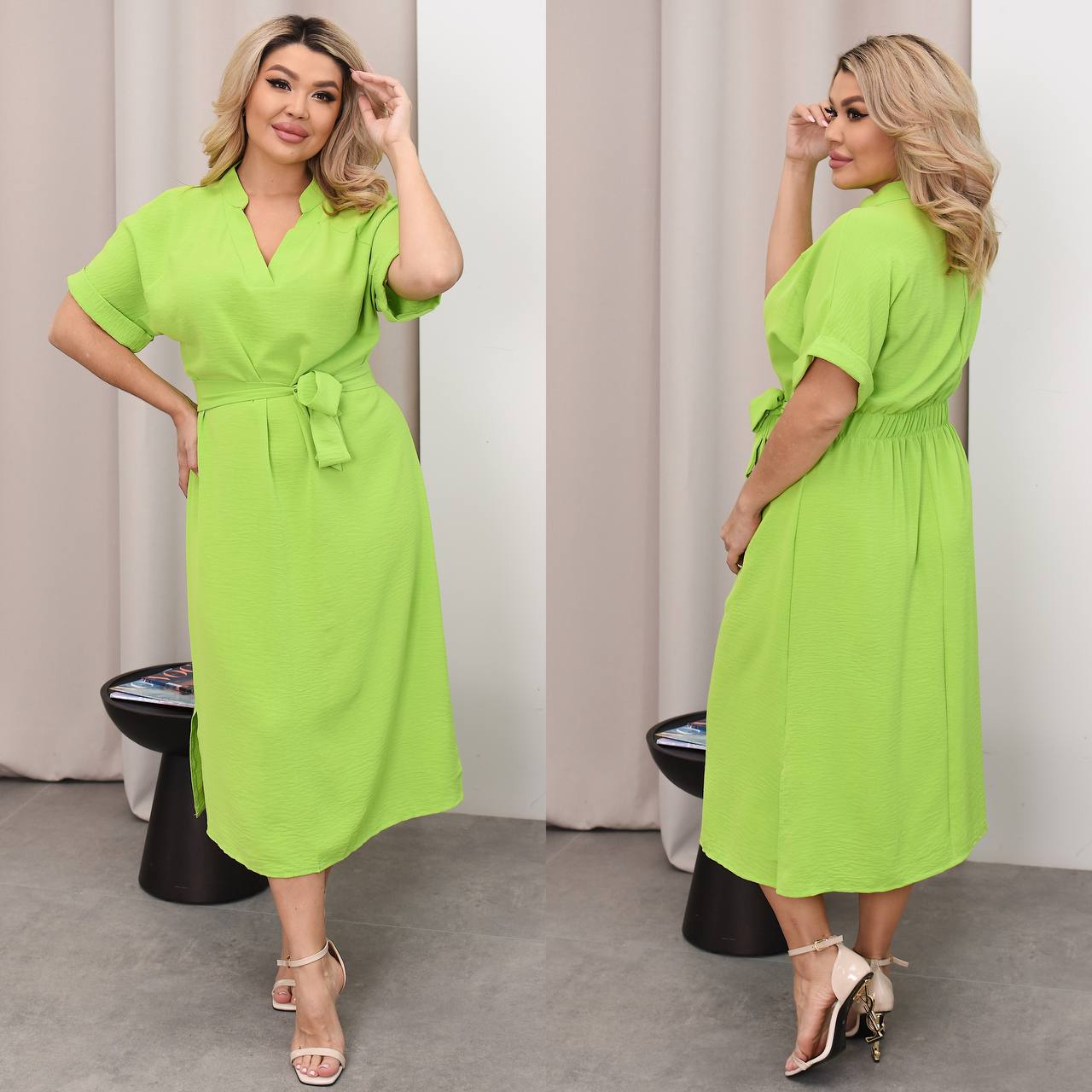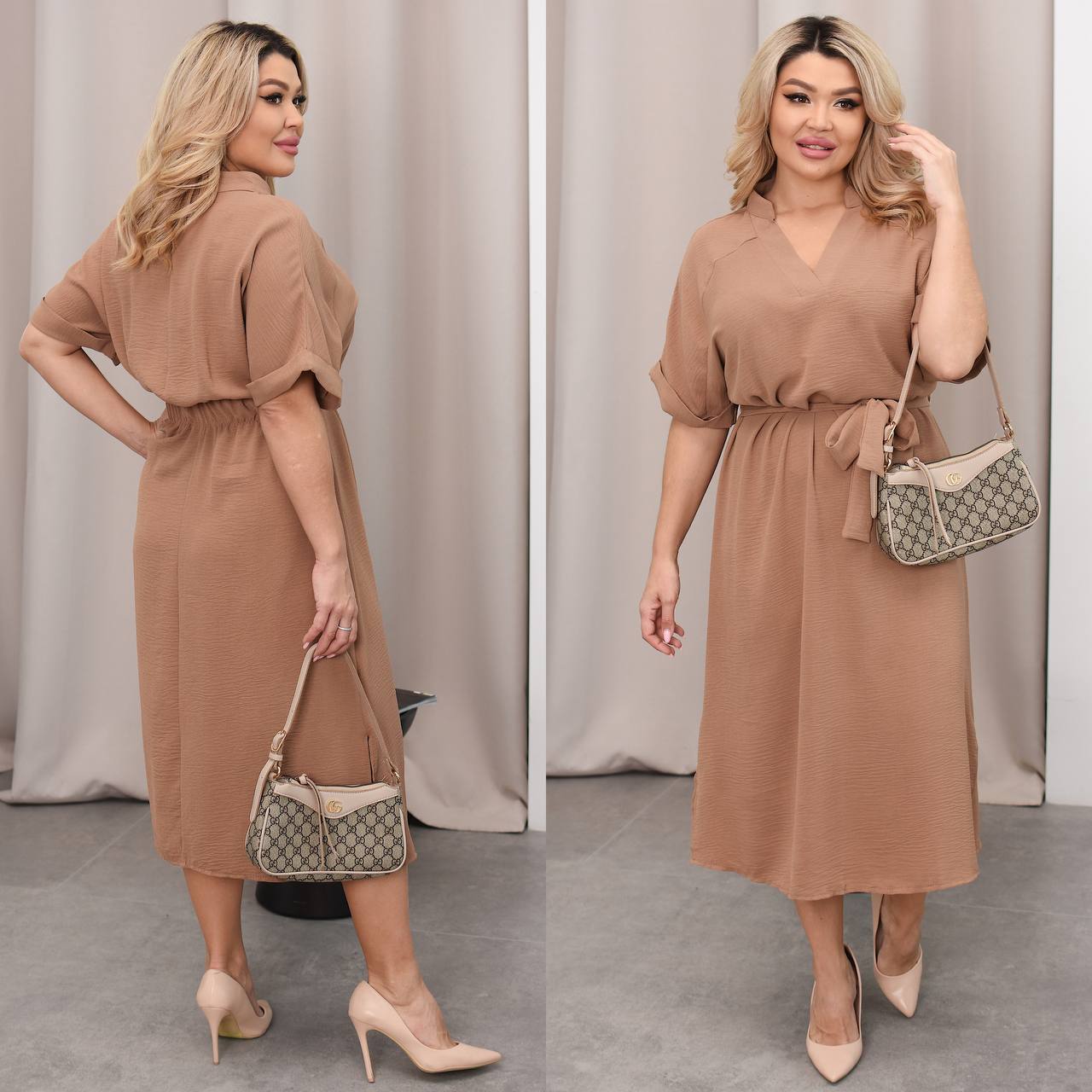 Тканина має гарну розтяжність, напів вільний крій та резинка на талії с заду робить фігуру більш жіночною. Сукня має також вшитий пасок на талії.