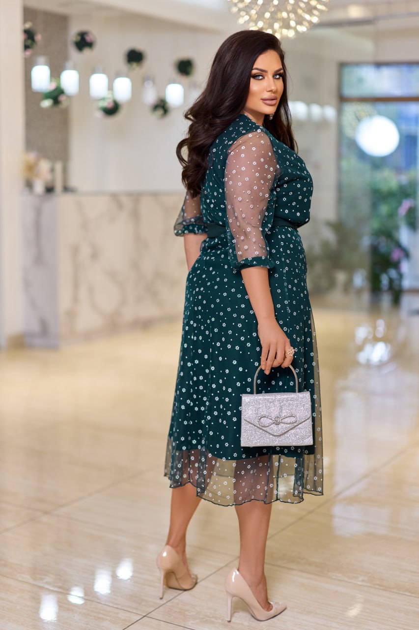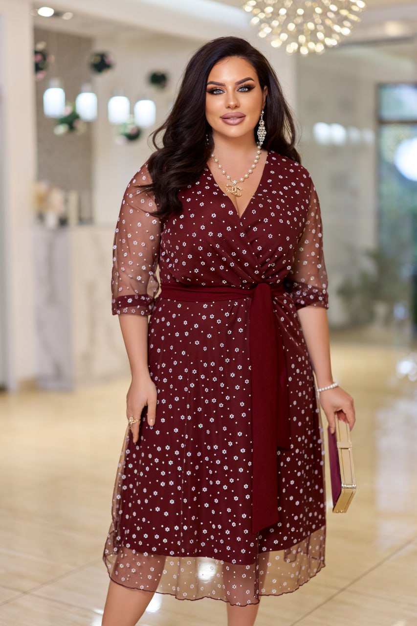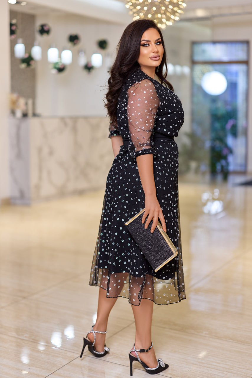 Елегантне жіноче плаття, виконане з кріп дайвінгу (тягнеться) і сітки з блиском. Перед сукні з імітацією запаху. До сукні додається знімний пояс із основної тканини. У такій сукні будь-яка жінка зможе відчути себе справжньої леді та королевою вечора, ця сукня здатна надати жінці ніжності, легкості та елегантності.