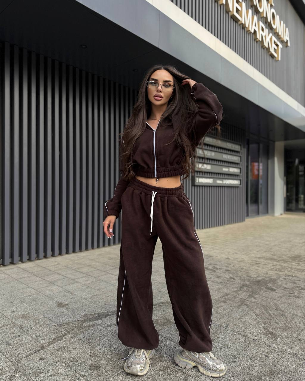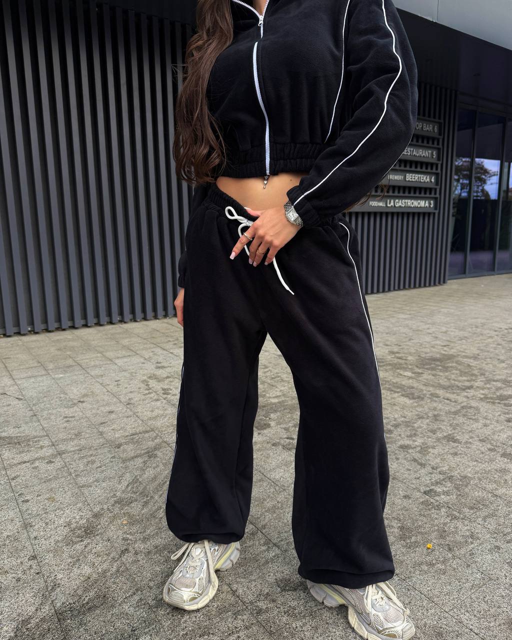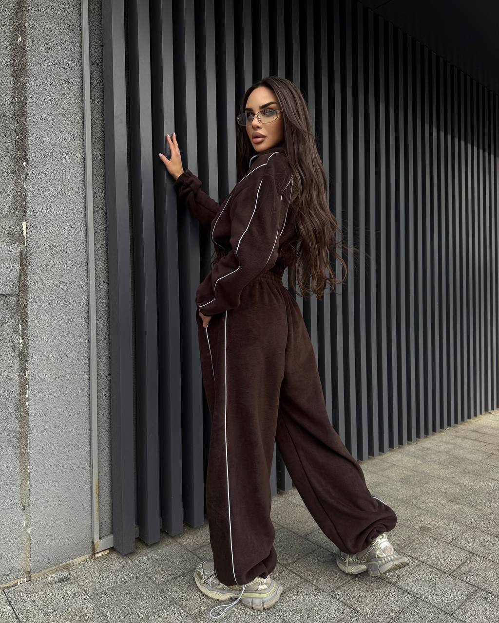 Тепленький прогулянковий костюм по сезону з кофти на змійці та обʼємних штанів. Мʼяка приємна щільна тканина. Штани на резинці, мають кишені, знизу йдуть на фіксаторах.