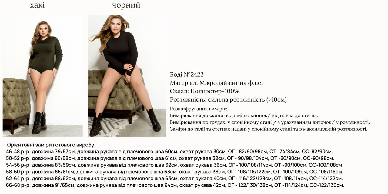 Ми піклуємося про Ваше тепло та комфорт, саме тому ми виготовили зручне, а також неймовірно стильне боді із приємної на дотик тканини. Боді універсальна річ в гардеробі, адже його можна носити як окремо, так і створювати багатошарові образи з м’якими кардиганами або светрами. А ще він легко комбінується з різноманітними штанами та джинсами завдяки універсальним та базовим кольорам. Модель з довгими рукавами та з делікатним окантовуванням горловини. Застібка у вигляді трьох тендітних кнопок. Виріб складається з декількох частин які прошиті між собою та утворюють плавну лінію від грудей до стегон, завдяки чому силует візуально стає більш видовженим та тендітним.