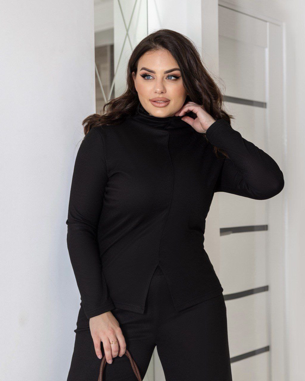 Кофта з високою горловиною,на груді декоративні складки,перед з відстрочкою по середині,а також розрізом.
