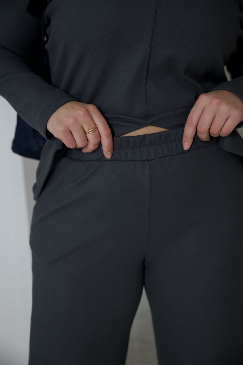 Брюки,пояс яких на резинці,прямого крою,по бокам кишені.