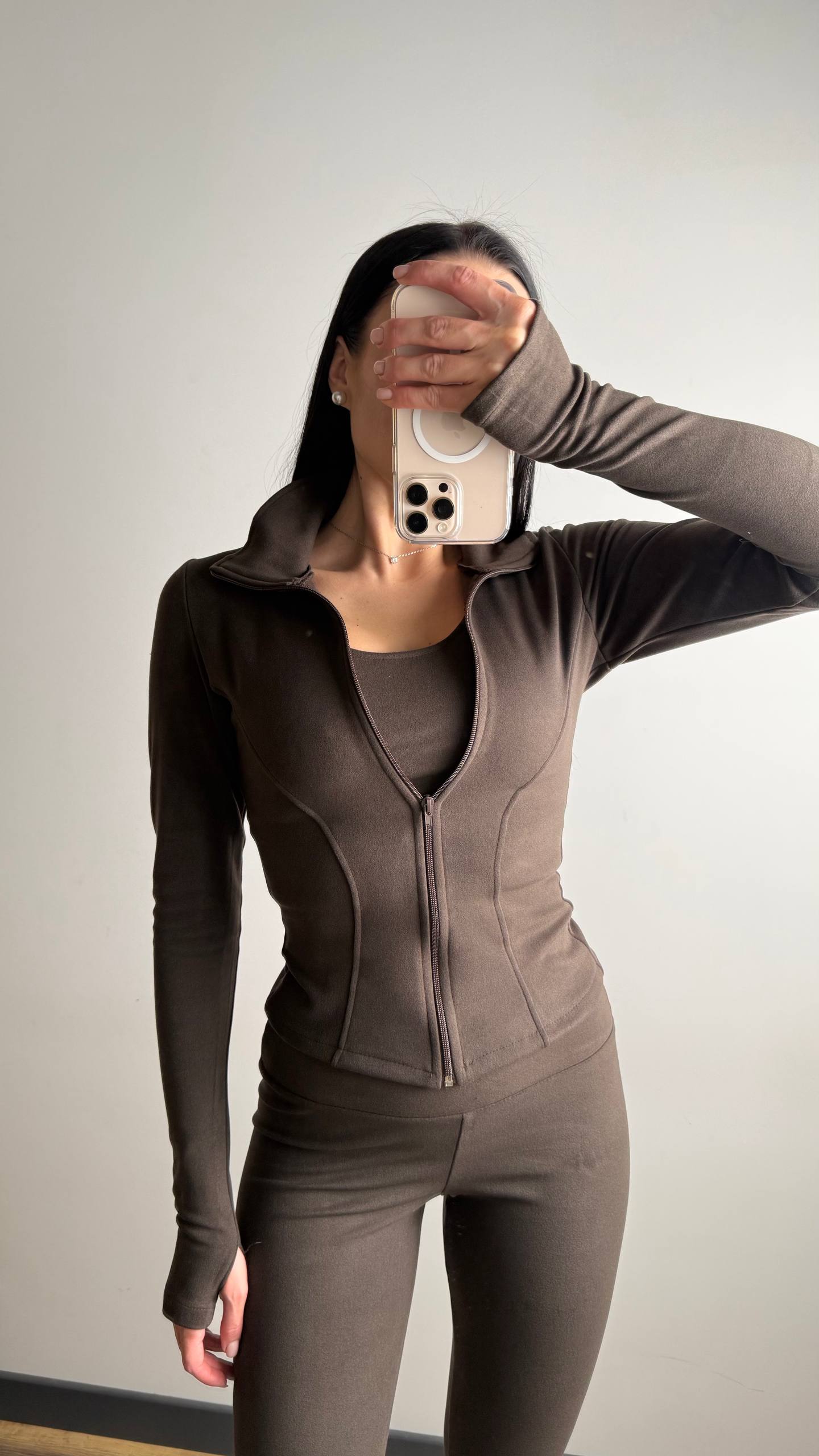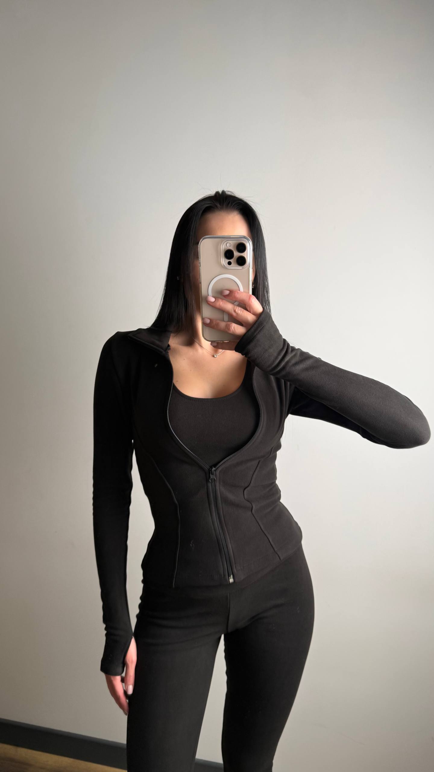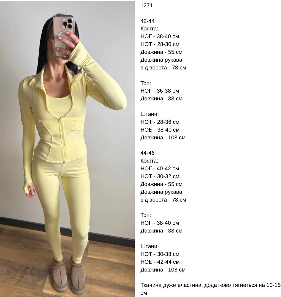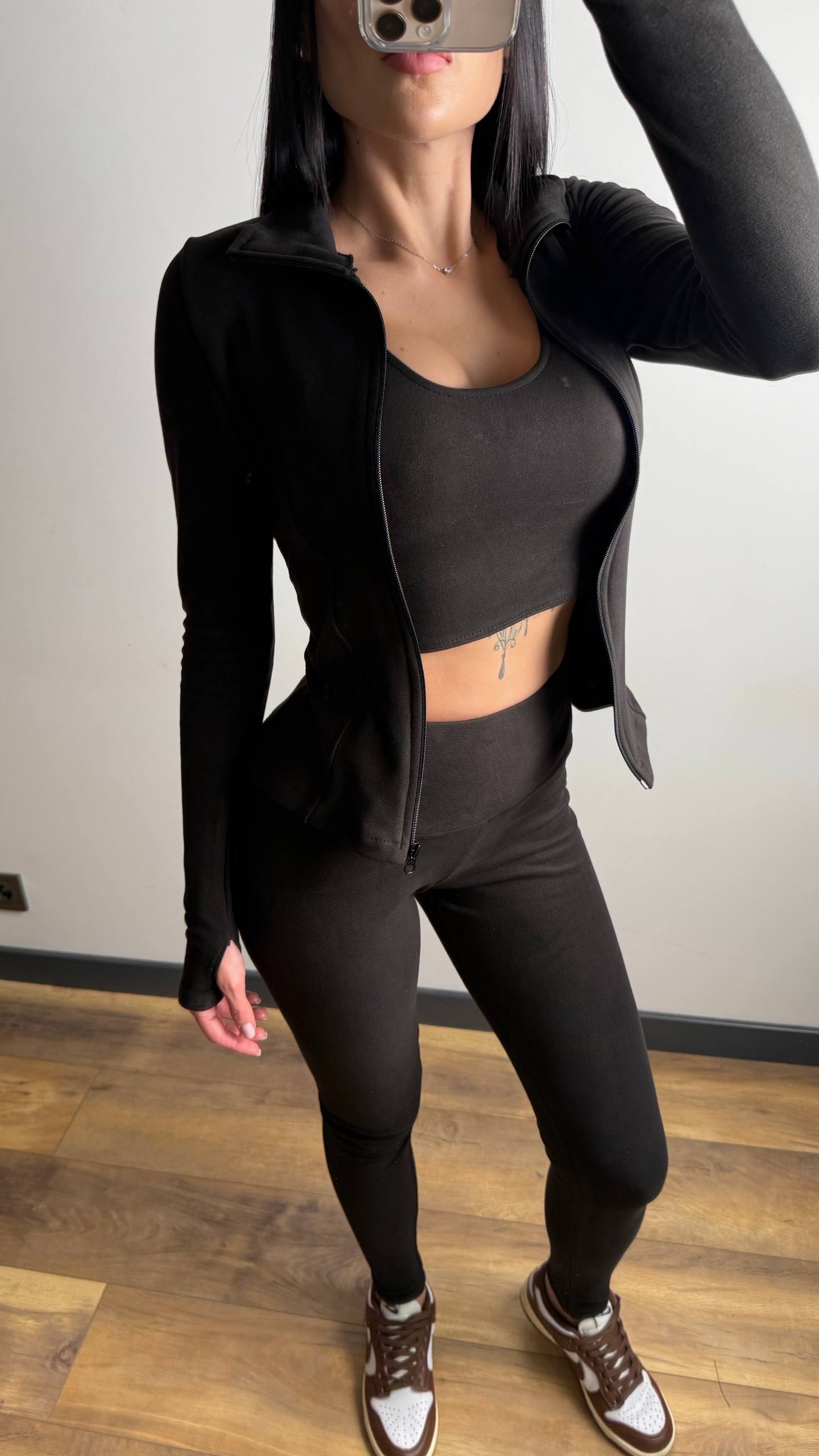 У комплект входить топ, лонгслів на блискавці та легінси — ідеально сідають по фігурі, підкреслюючи лінії тіла.