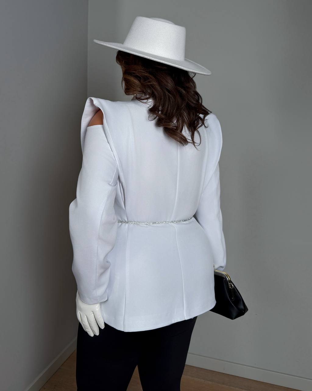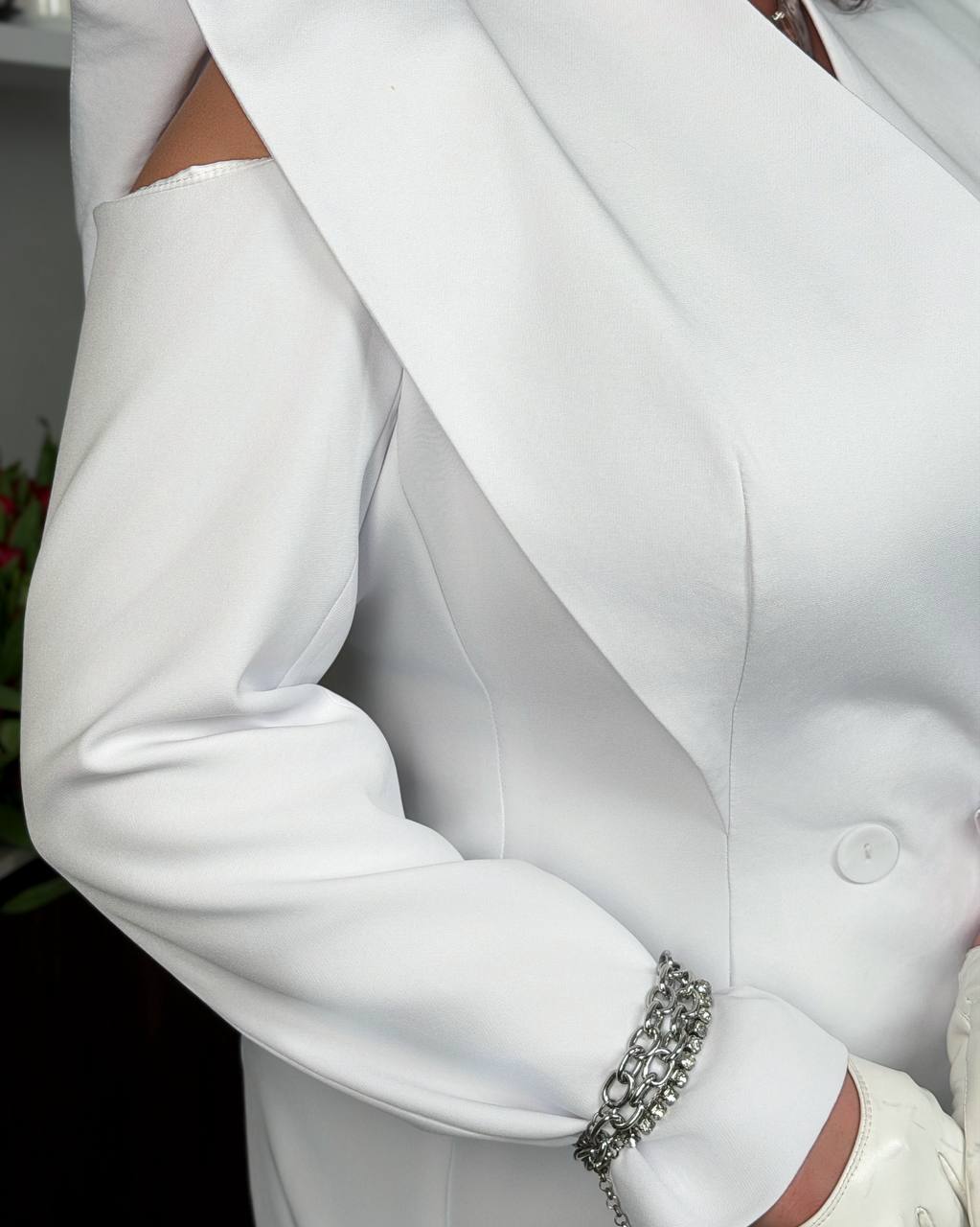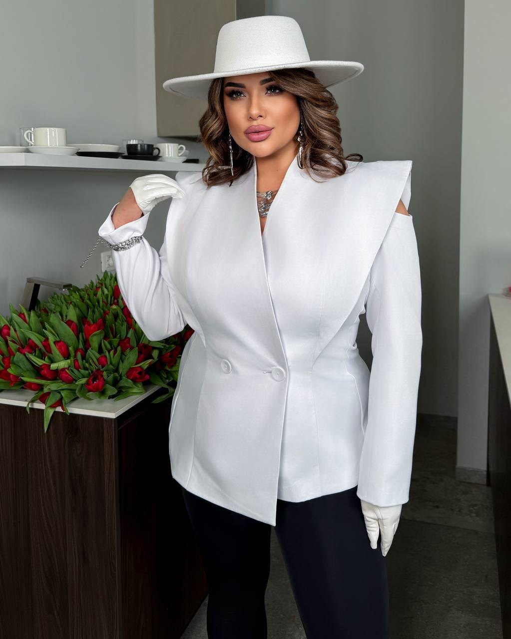 Матеріал: костюмний креп, Підкладка. Одягається на запах, застібається на ґудзики. Гарний приталений сілует. Має форму , перед ущилен.