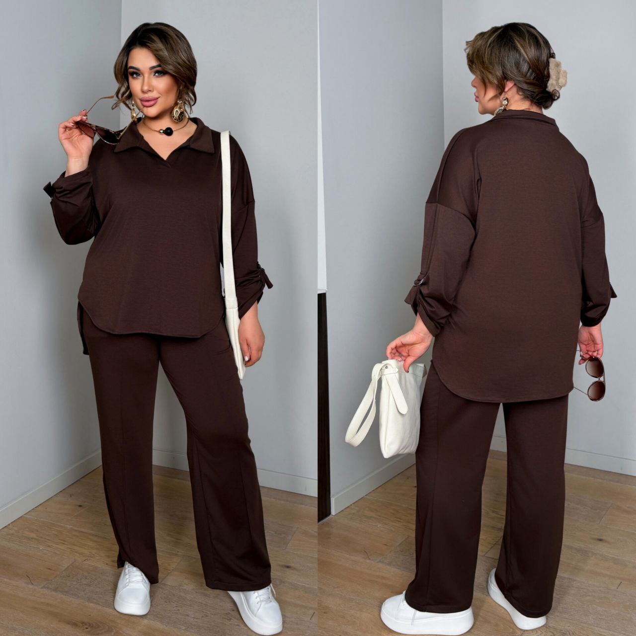 Стильний костюм на щодень. Вільна сорочка з V-вирізом та прямі брюки візуально витягують силует.
