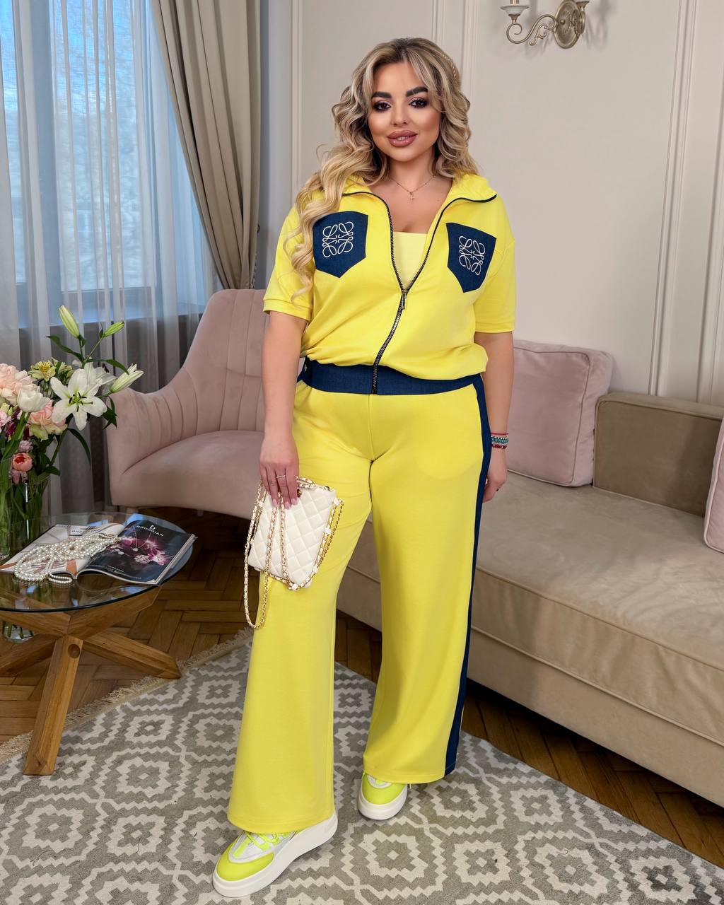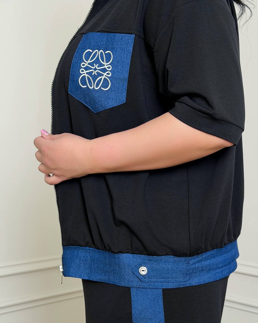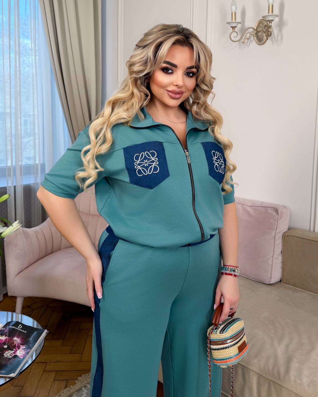 Кофта вільного силуету на блискавці прикрашена стильними декоративними кишенями з вишивкою, що додають образу елегантності .Короткий рукав зі спущеною лінією плеча, комір стійка. Широкі штани в поясі на гумці, високої посадки, збоків кишені, та контрастними лампасами створюють витончений силует і забезпечують свободу рухів.
