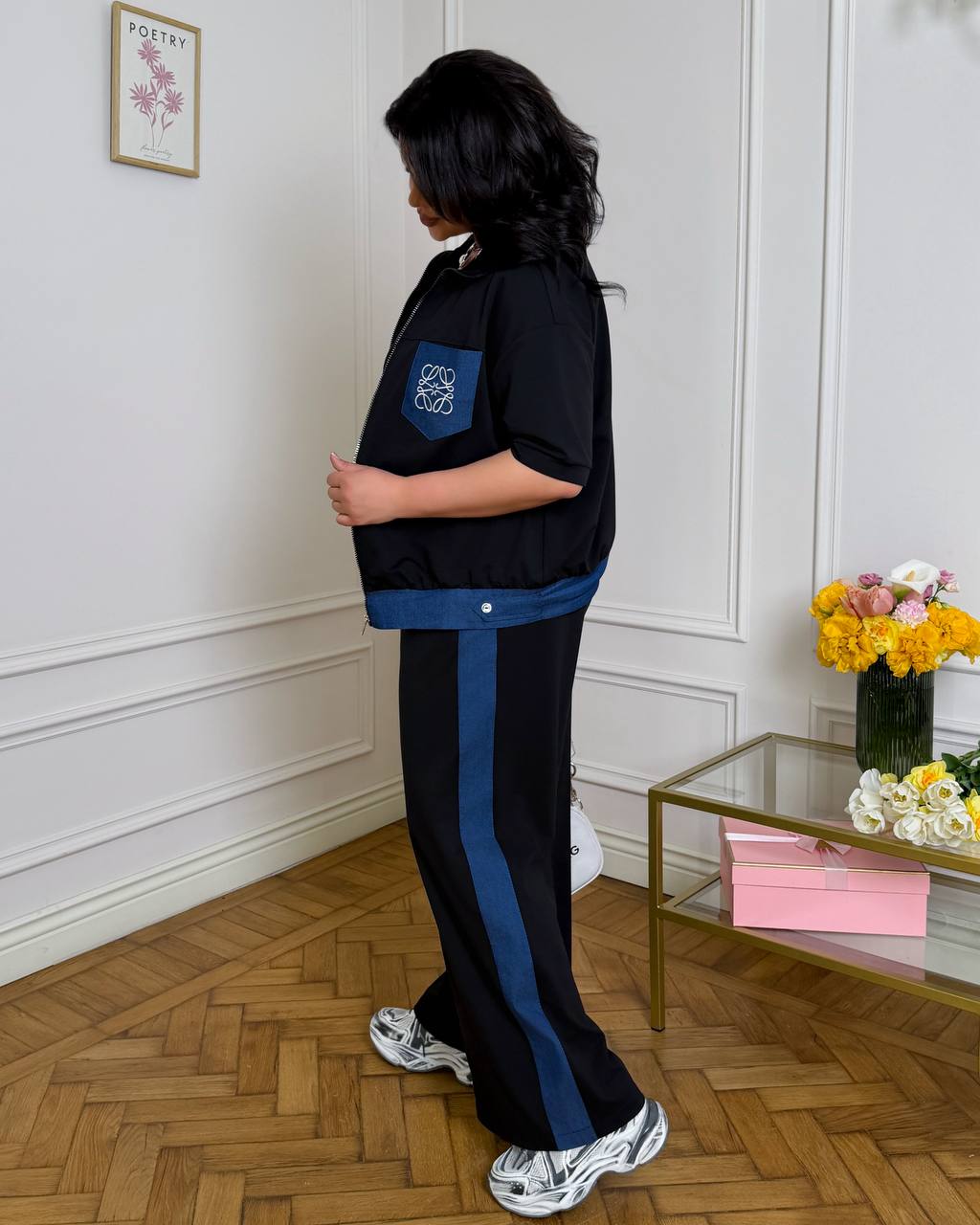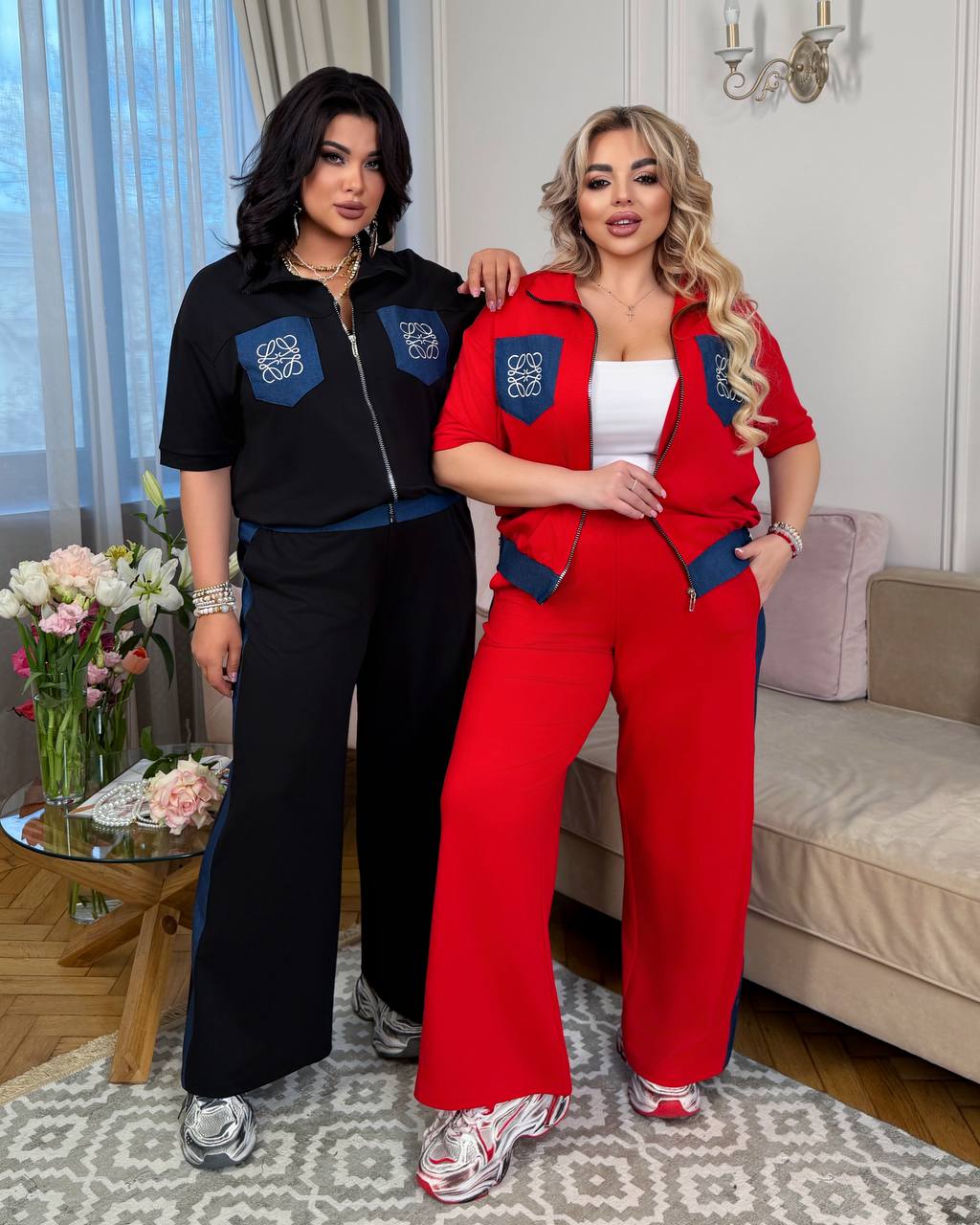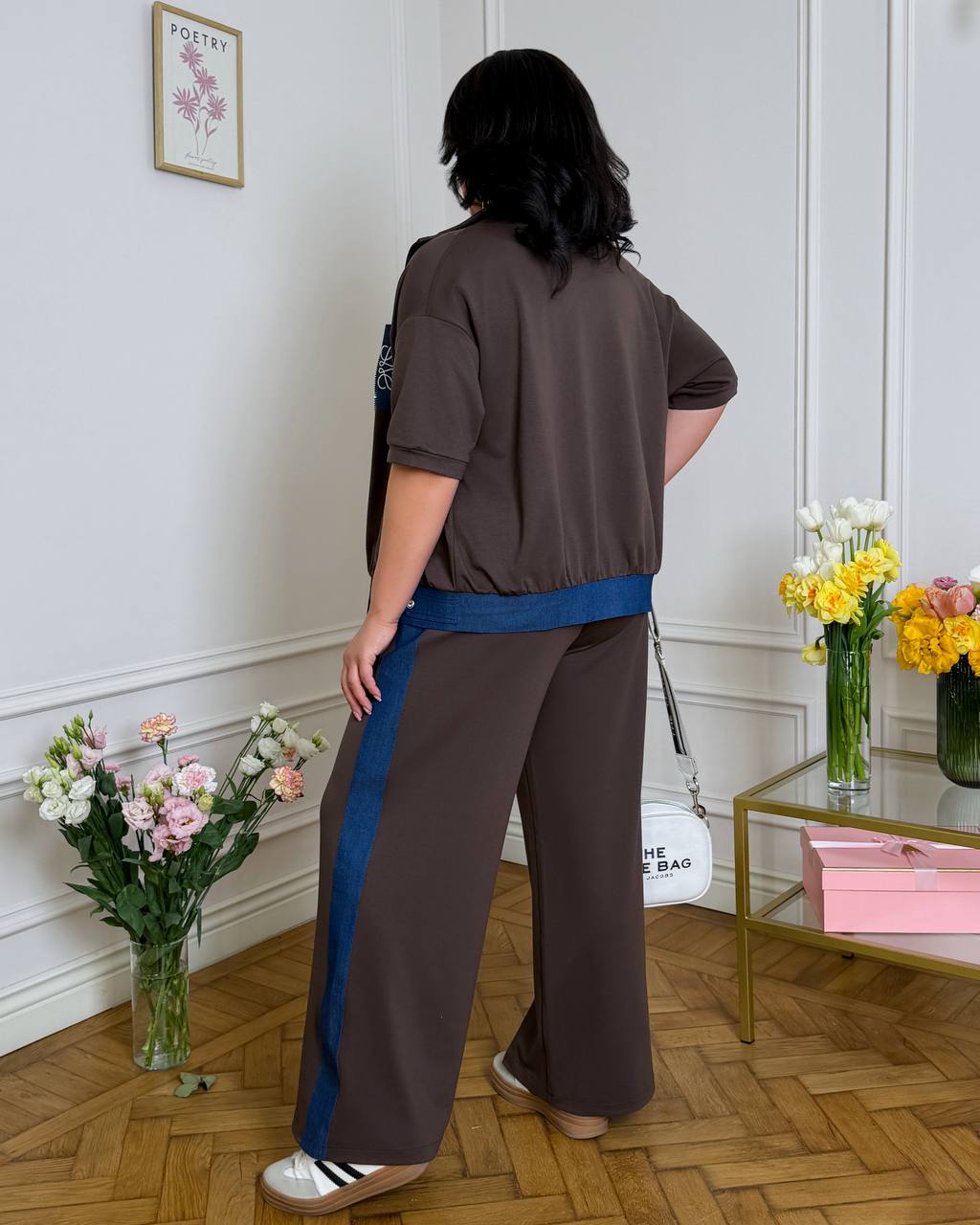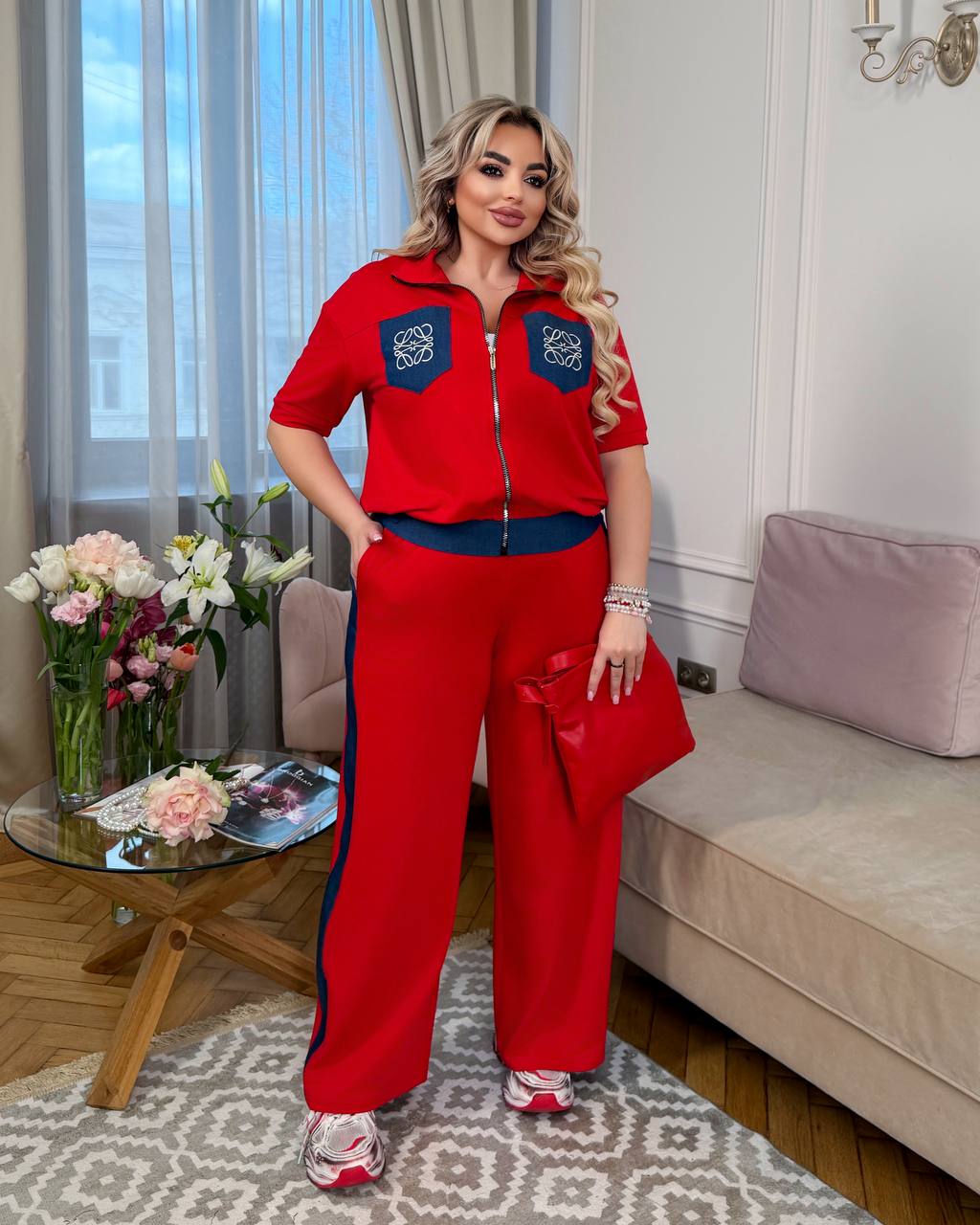 Кофта вільного силуету на блискавці прикрашена стильними декоративними кишенями з вишивкою, що додають образу елегантності .Короткий рукав зі спущеною лінією плеча, комір стійка. Широкі штани в поясі на гумці, високої посадки, збоків кишені, та контрастними лампасами створюють витончений силует і забезпечують свободу рухів.