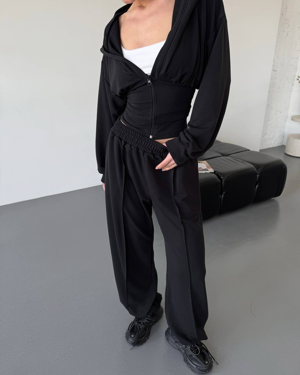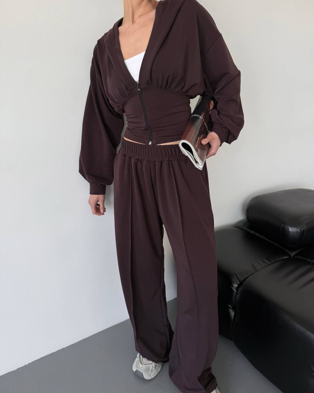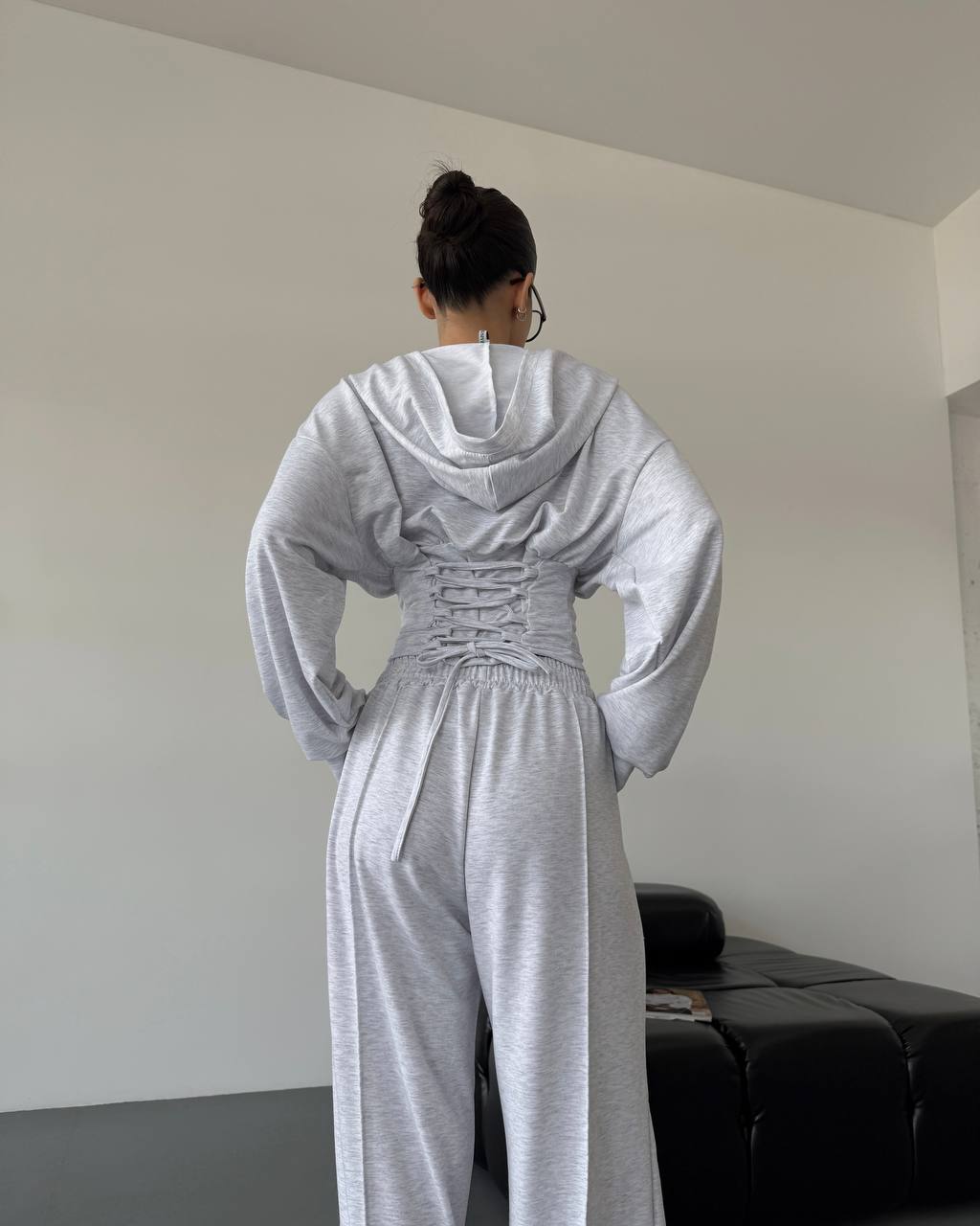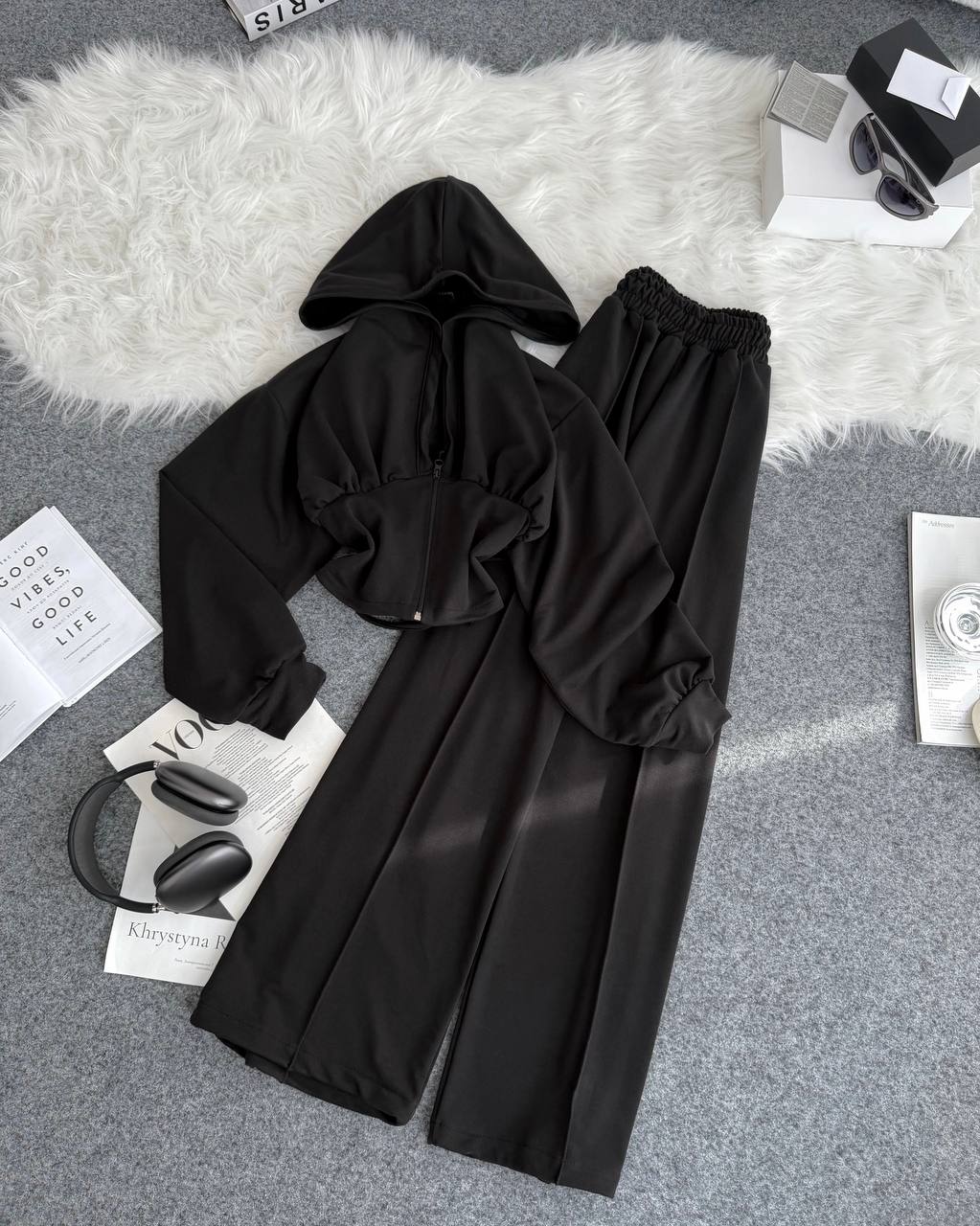 Ідеальний прогулянковий костюм до весни в стилі оверсайз. Йде зі шнурівкою на спинці, яка регулює талію. Легка приємна тканина. Штани мають фіксатори знизу для зручності.