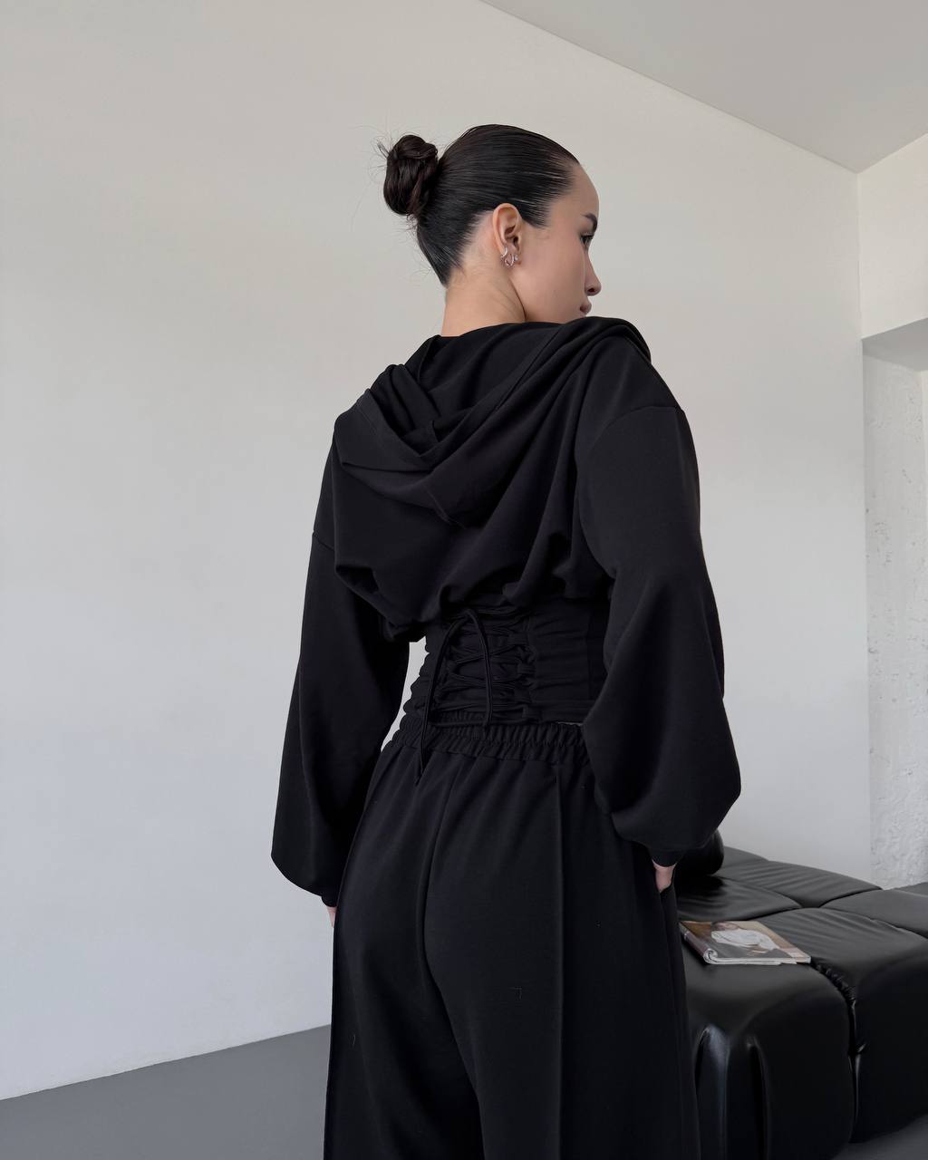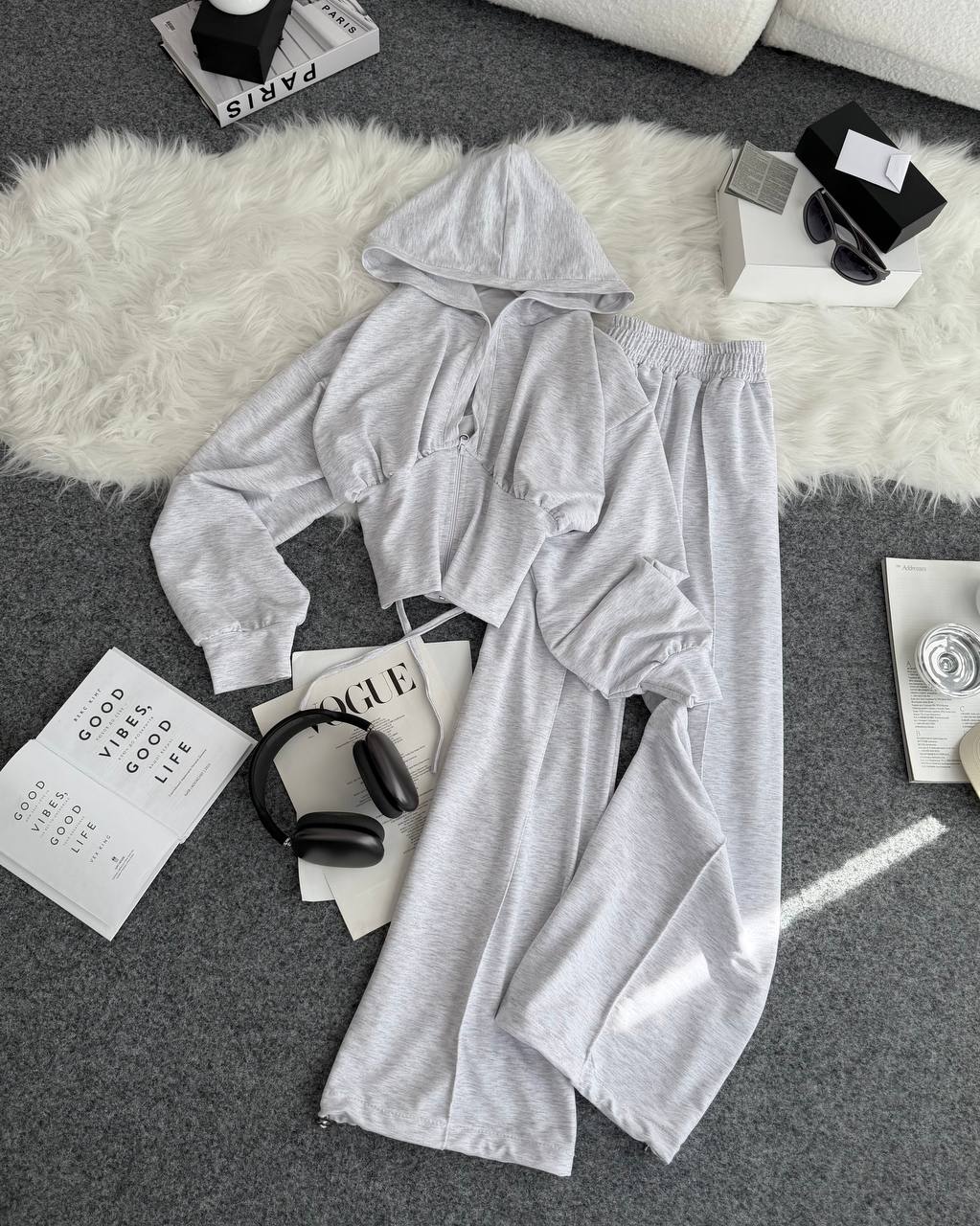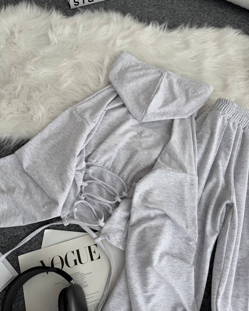 Ідеальний прогулянковий костюм до весни в стилі оверсайз. Йде зі шнурівкою на спинці, яка регулює талію. Легка приємна тканина. Штани мають фіксатори знизу для зручності.