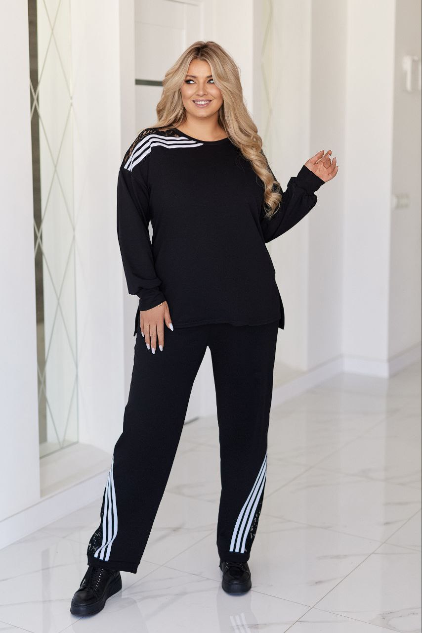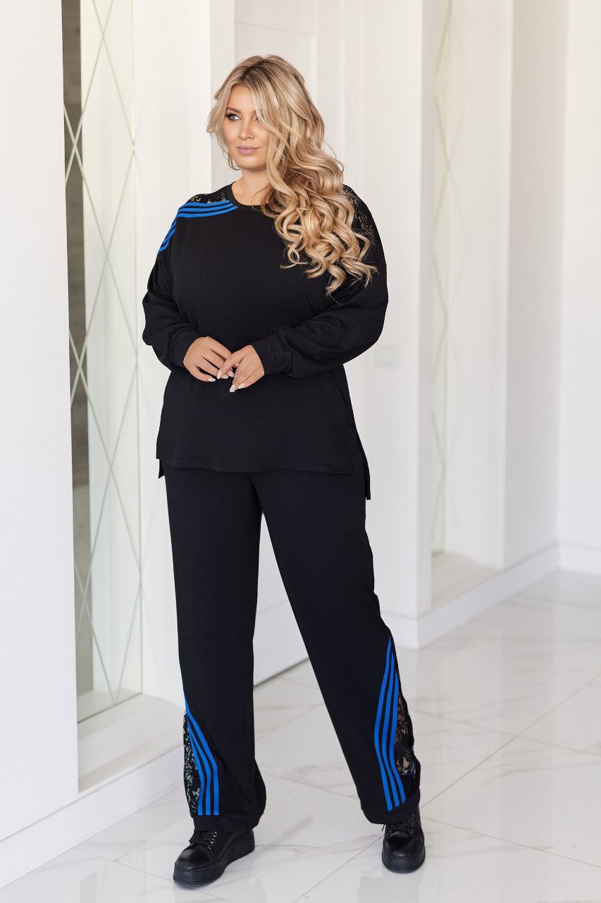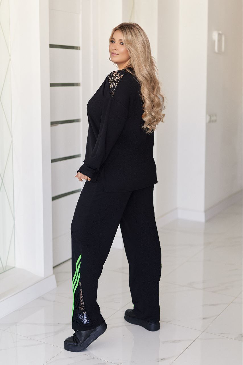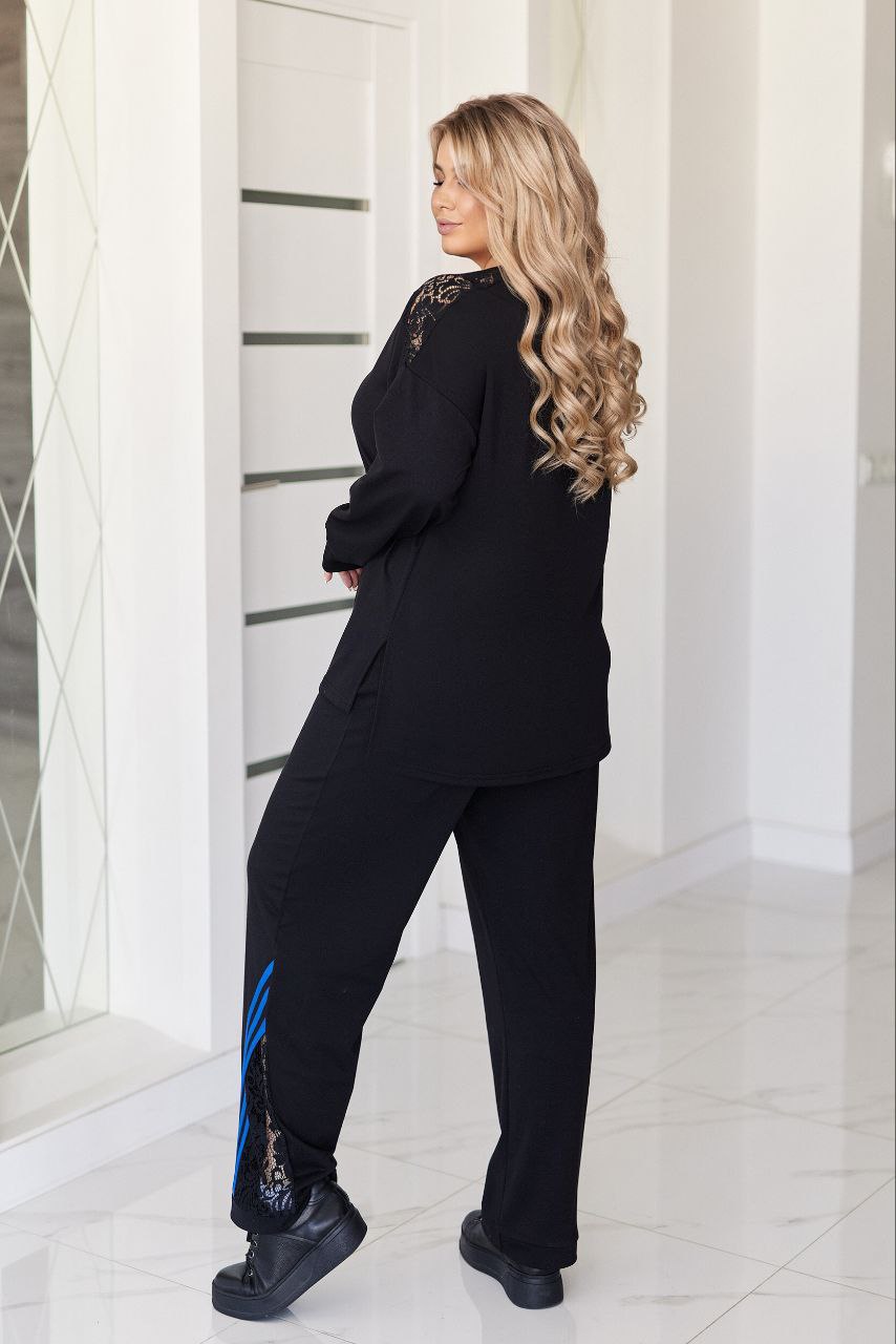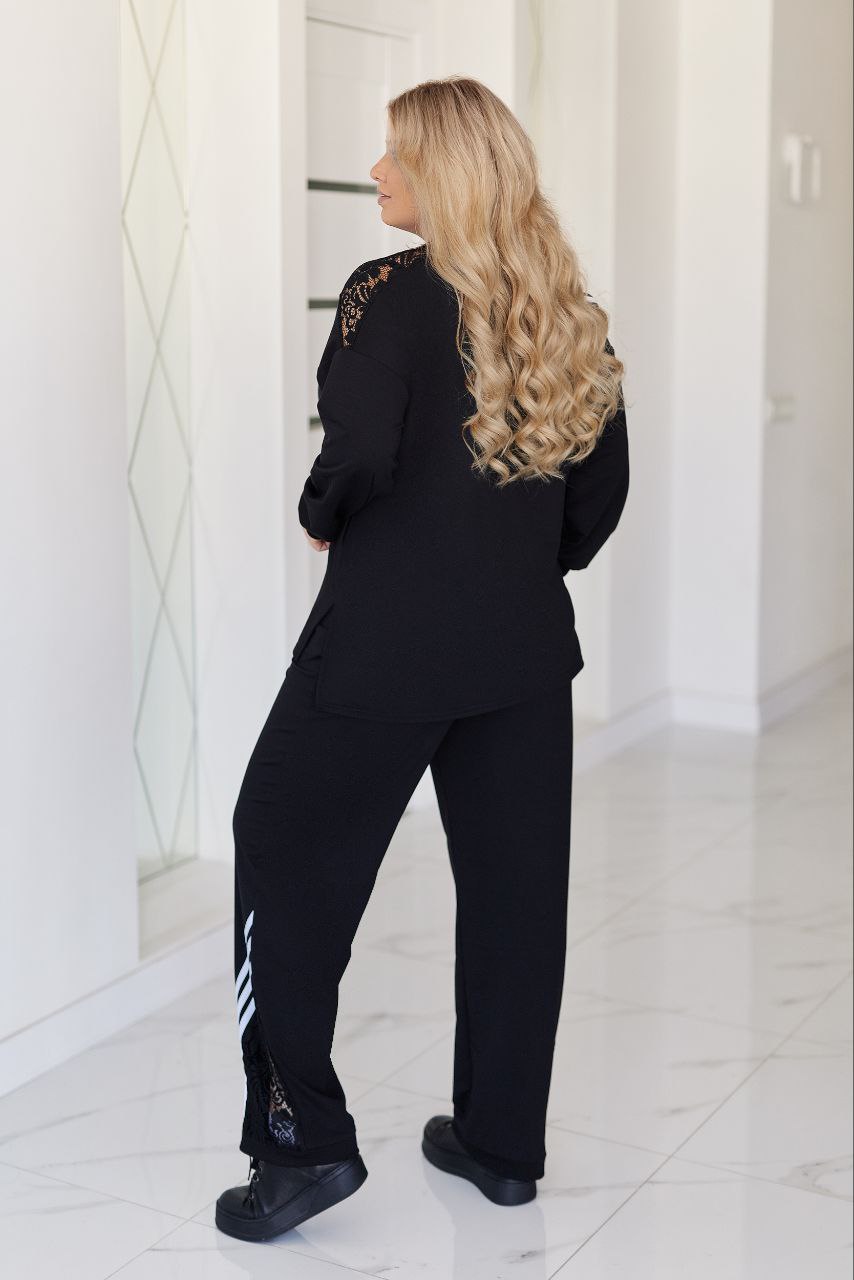 ●Штани прямого крою з високою посадкою, по боках лампаси та вставки з гіпюру, що створюють стильний акцент.