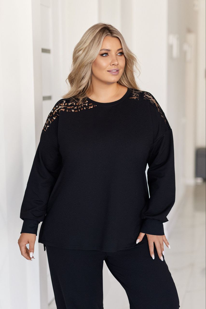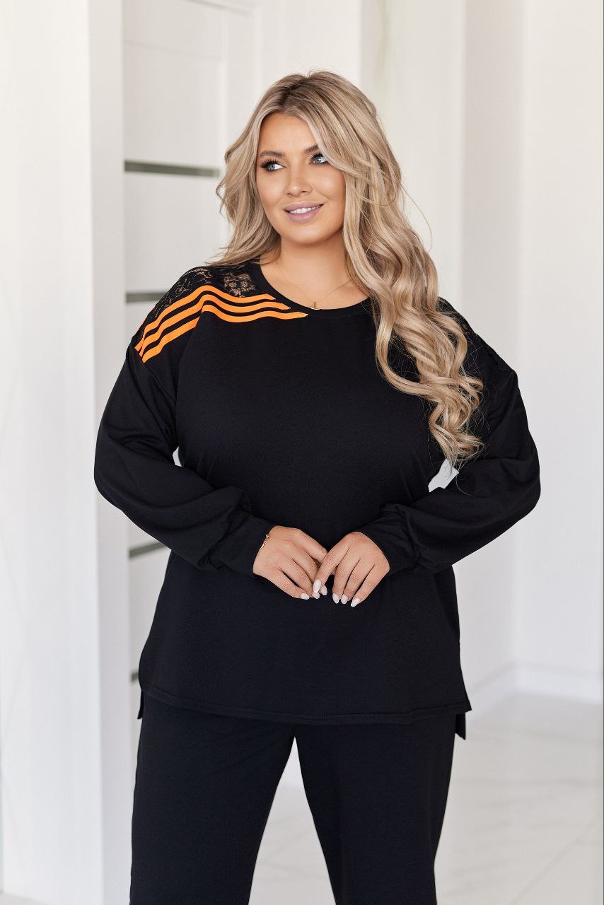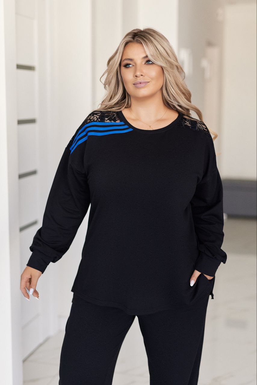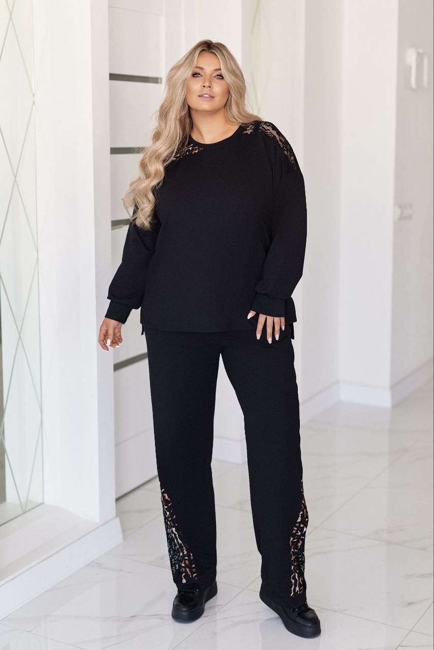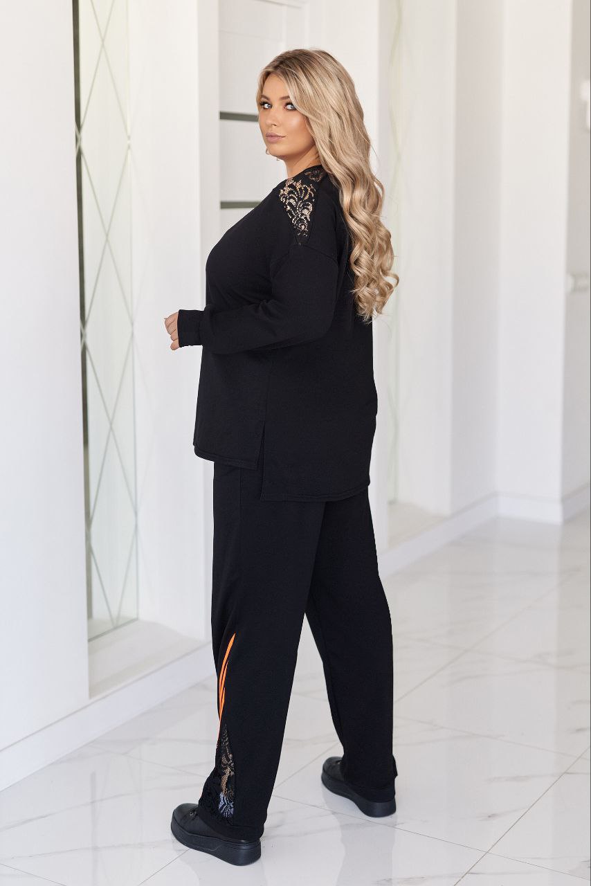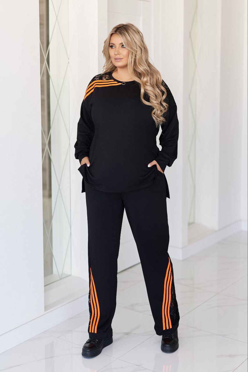 ●Штани прямого крою з високою посадкою, по боках лампаси та вставки з гіпюру, що створюють стильний акцент.