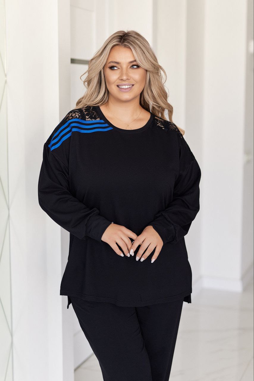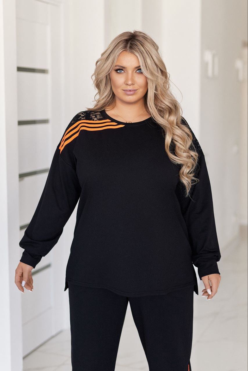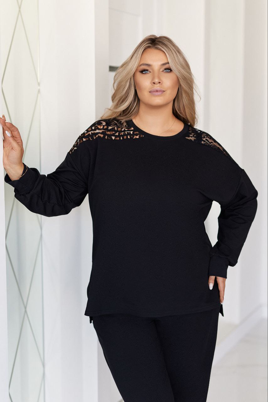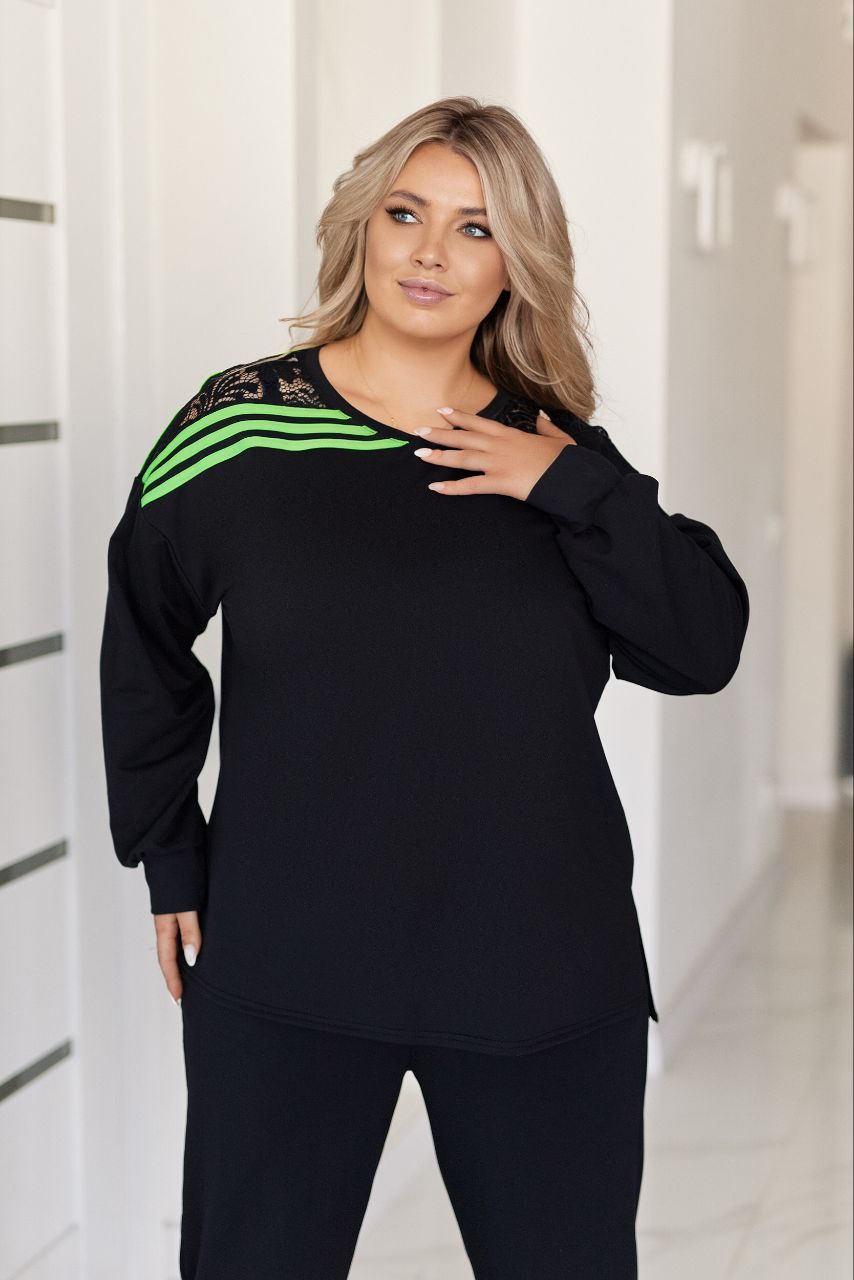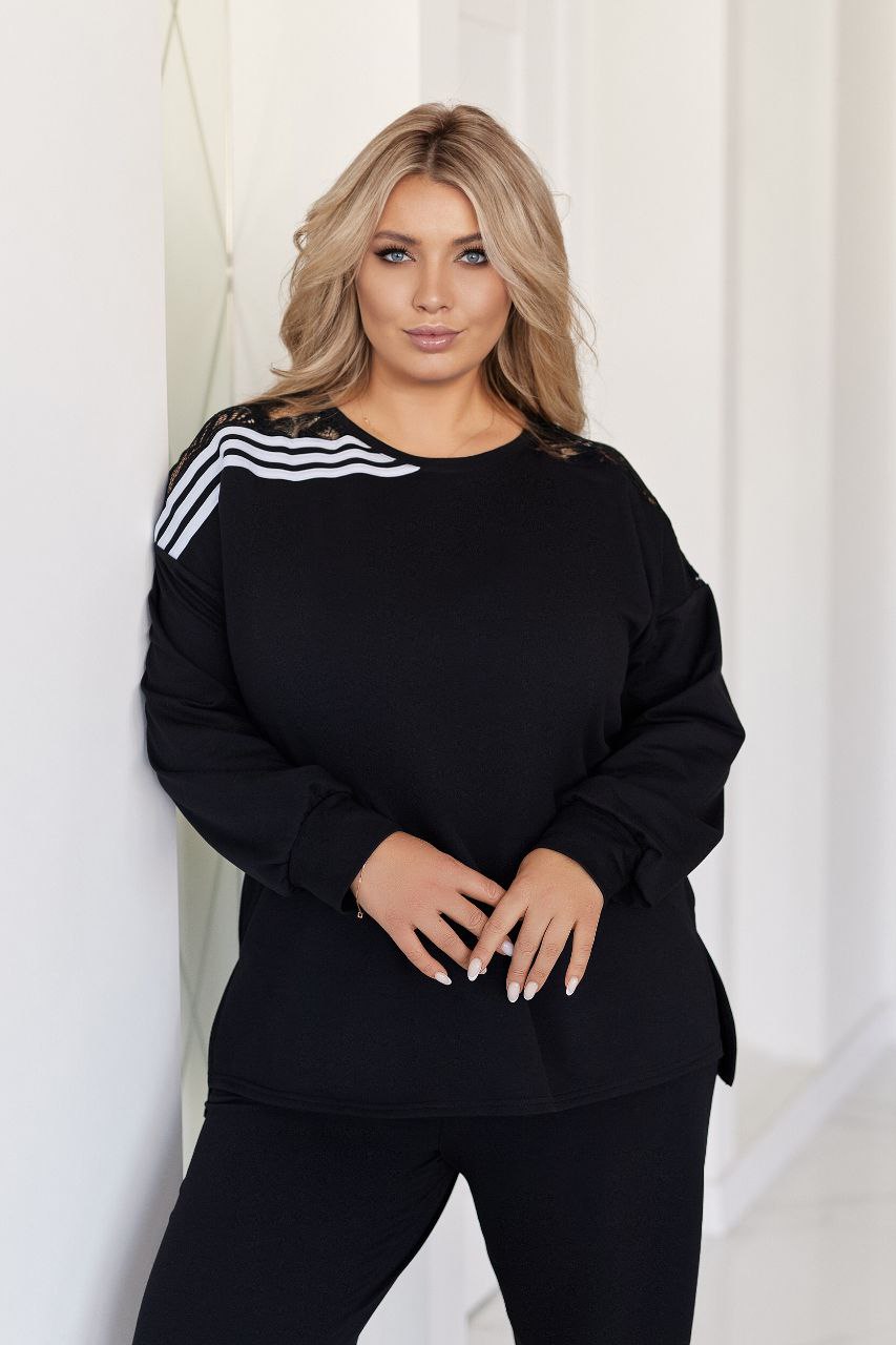 ●Штани прямого крою з високою посадкою, по боках лампаси та вставки з гіпюру, що створюють стильний акцент.