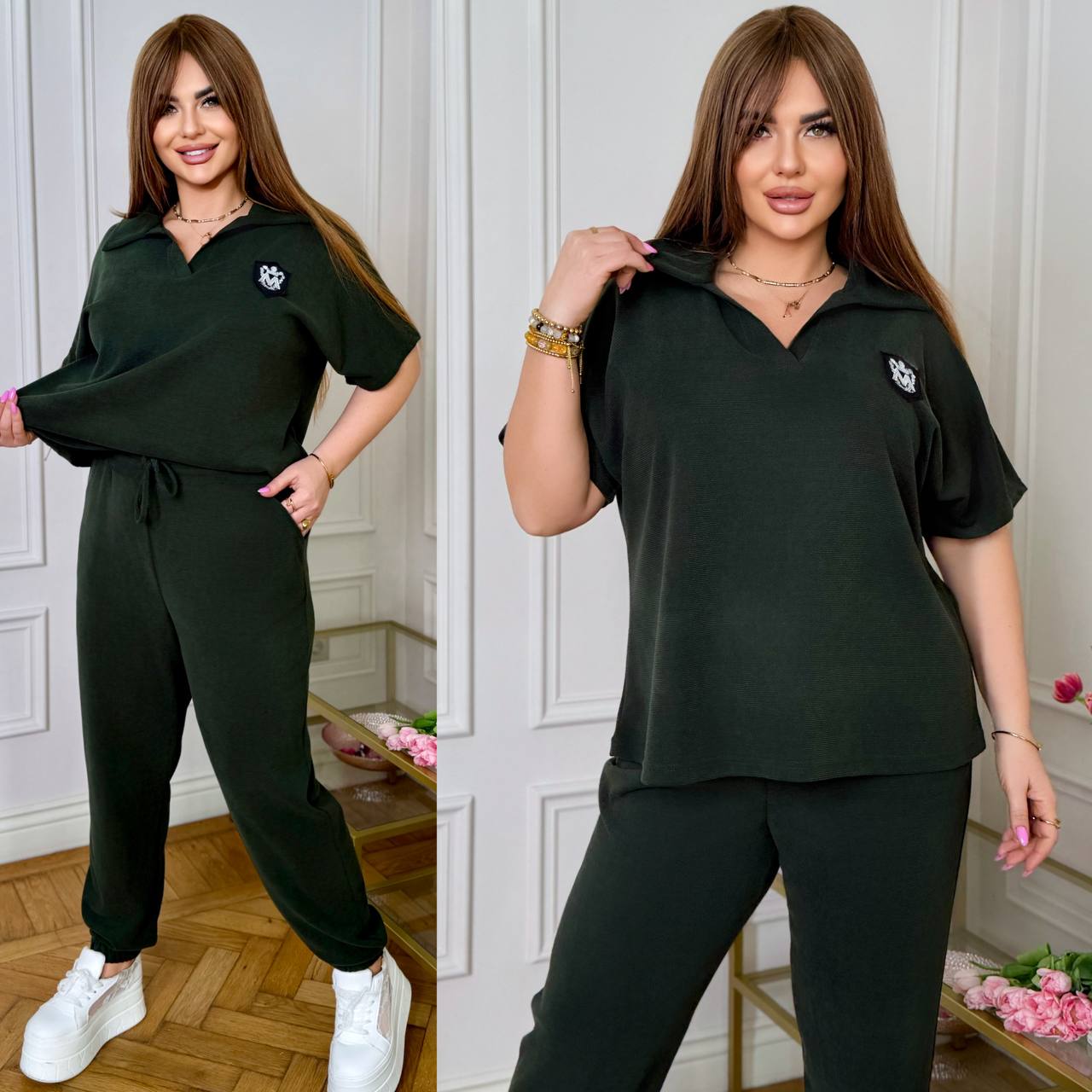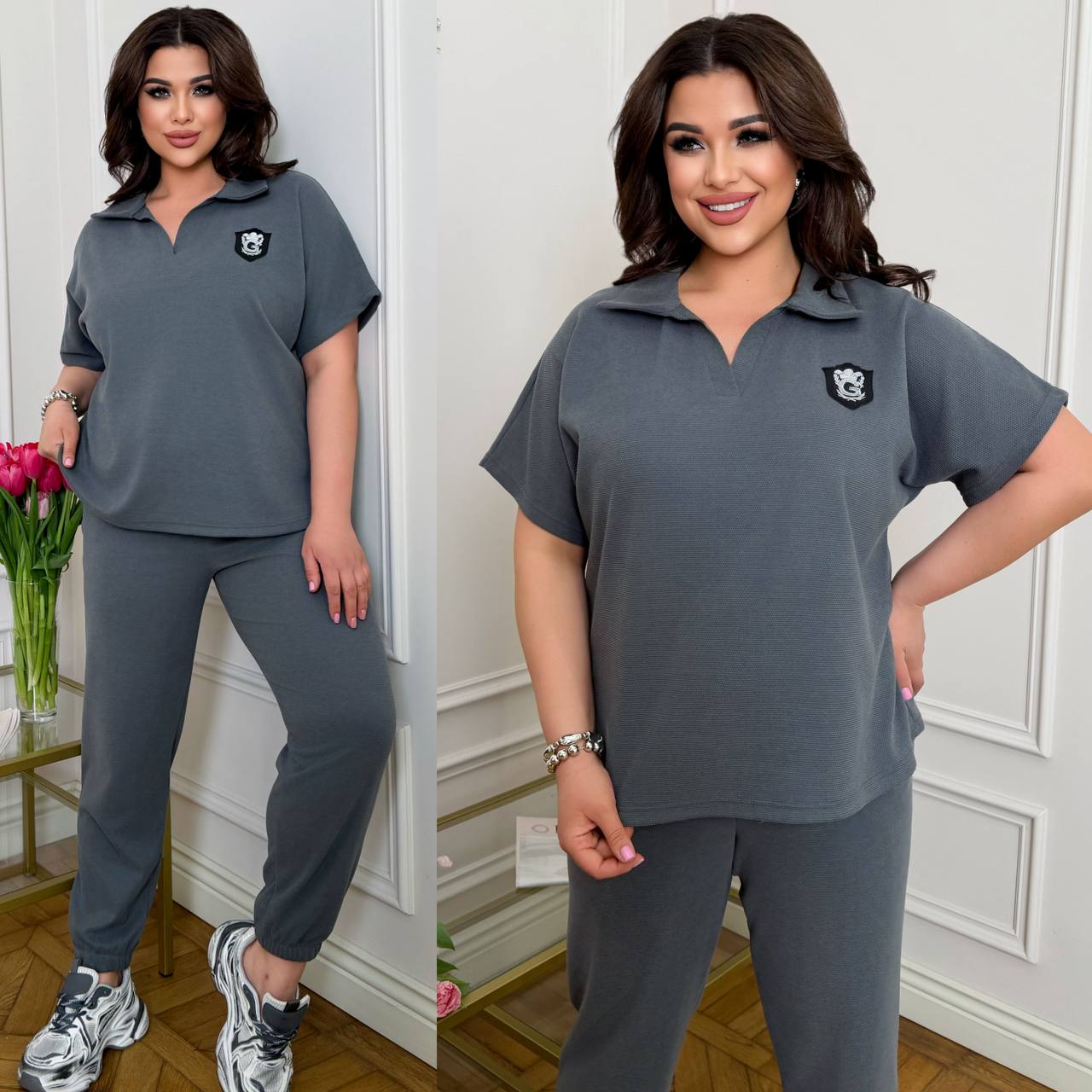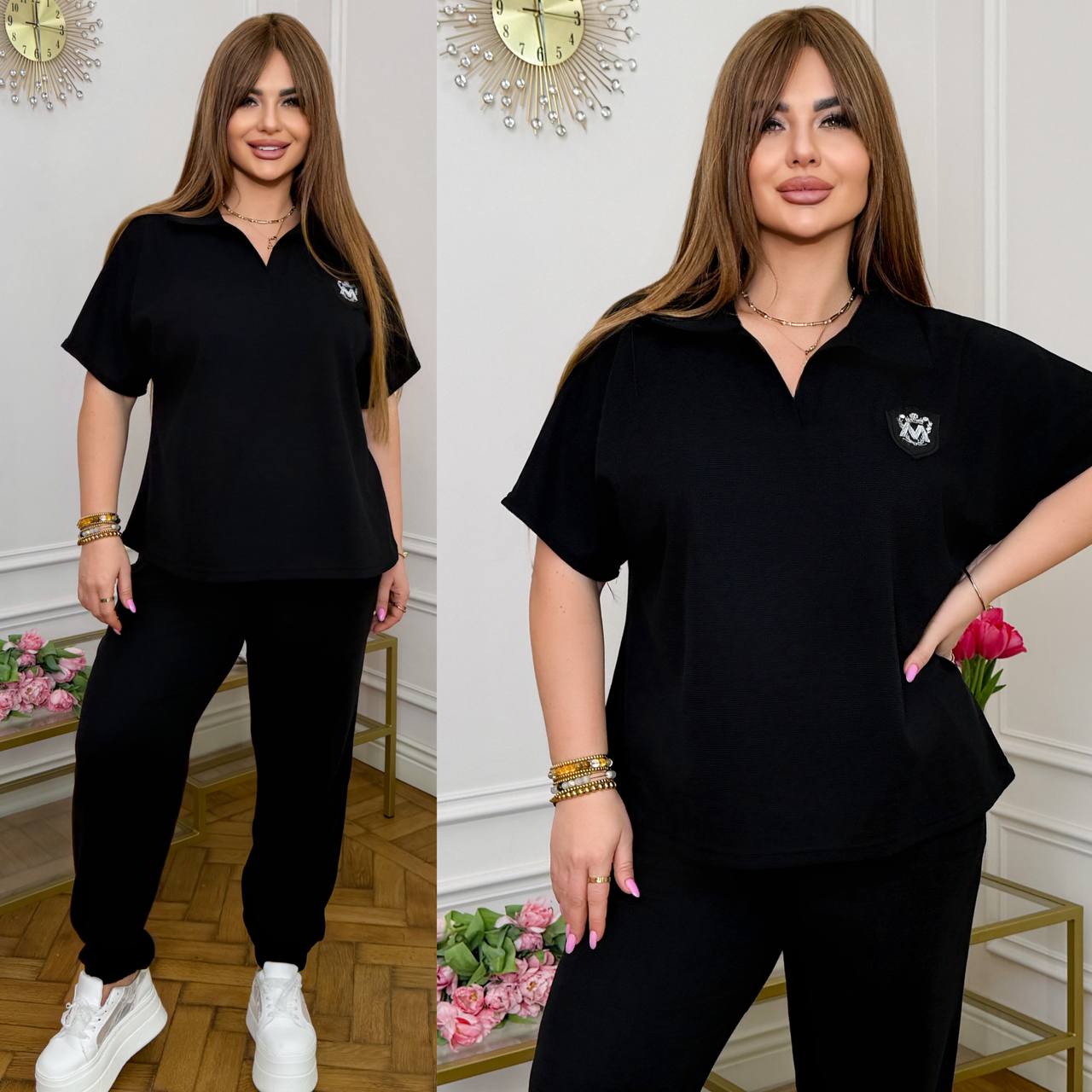 ( стильний та комфортний костюм з трикотажу еластан: футболка поло у стилі оверсайз з Акс + штани з високою посадкою на еластичній гумці, з кишенями в бічних швах, низ штанів на гумці.)