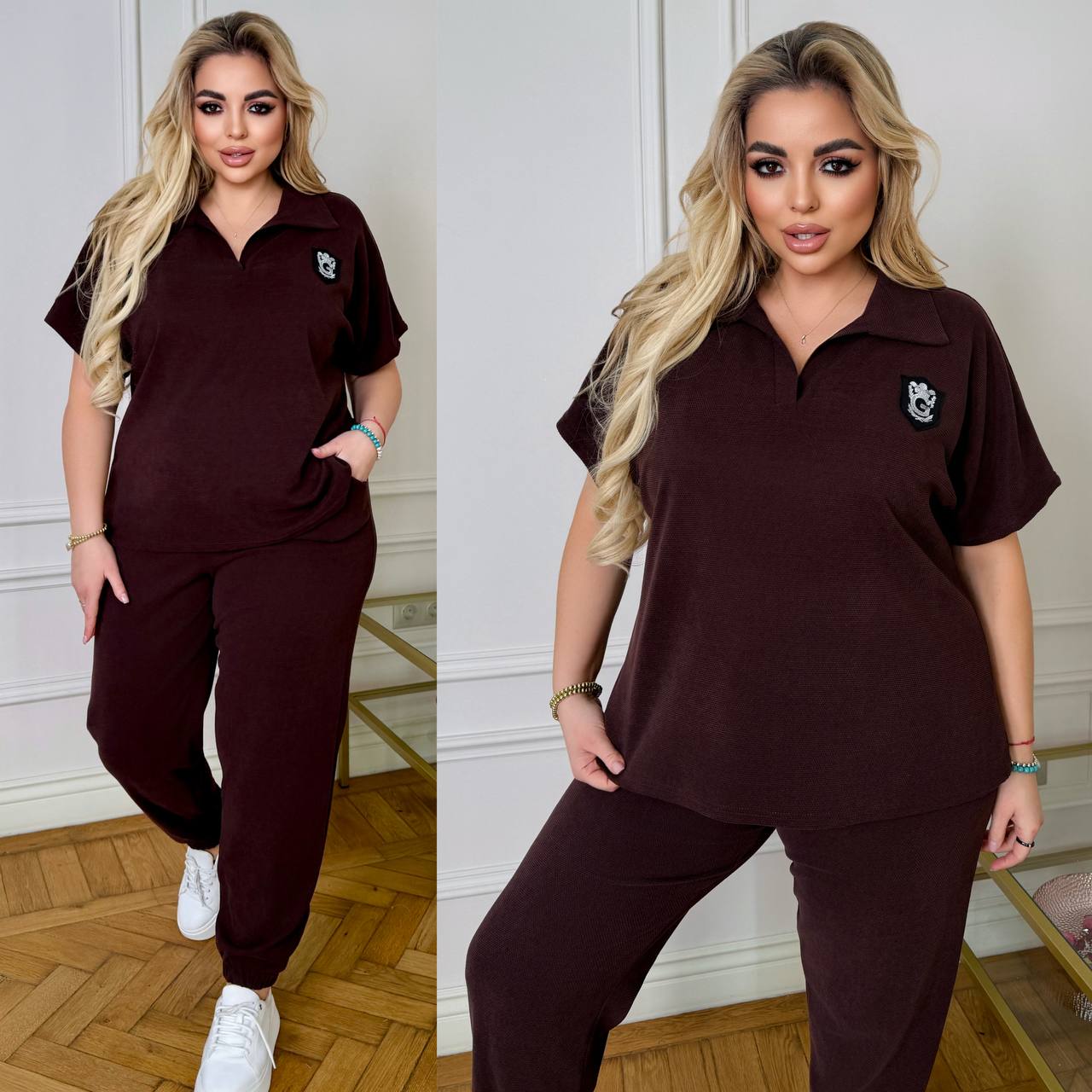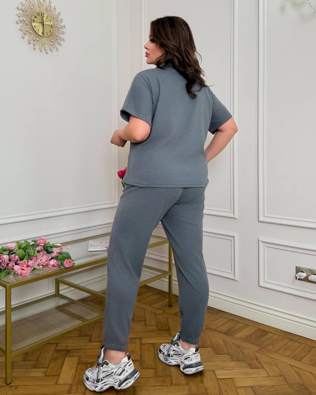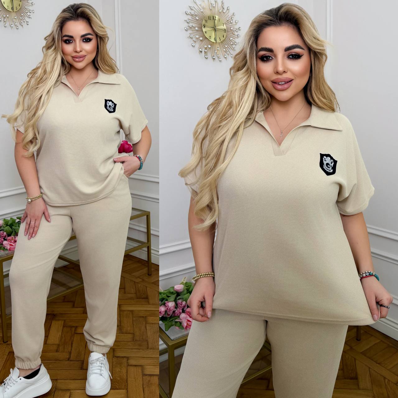( стильний та комфортний костюм з трикотажу еластан: футболка поло у стилі оверсайз з Акс + штани з високою посадкою на еластичній гумці, з кишенями в бічних швах, низ штанів на гумці.)