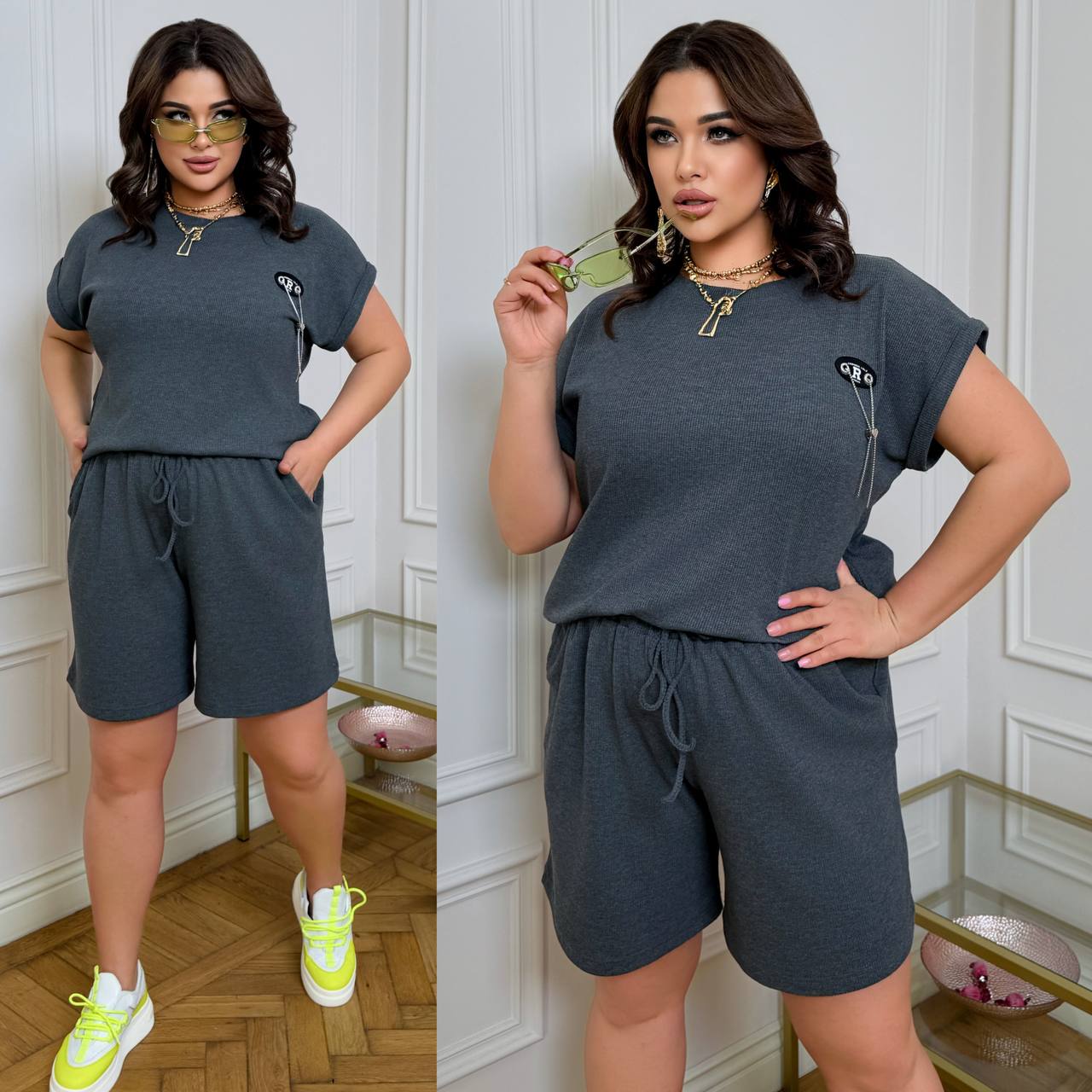 Код: 035 ( костюм з трикотажу стрейч «вафелька»: футболка з манжетами на рукавах та Акс + шорти з високою посадкою на гумці, з кішкнями у бічних швах та шнурком на поясі).