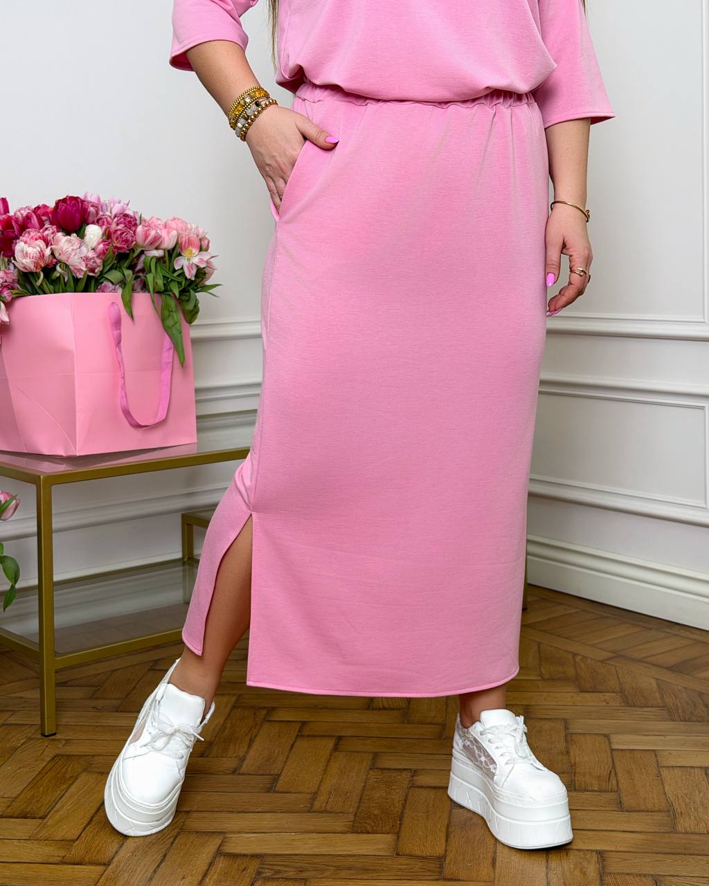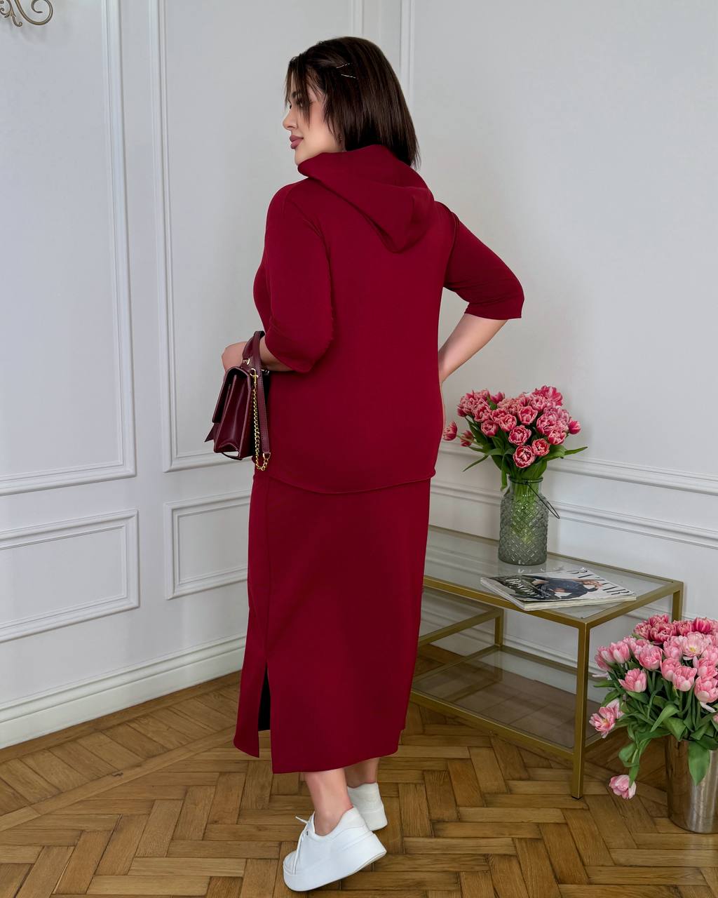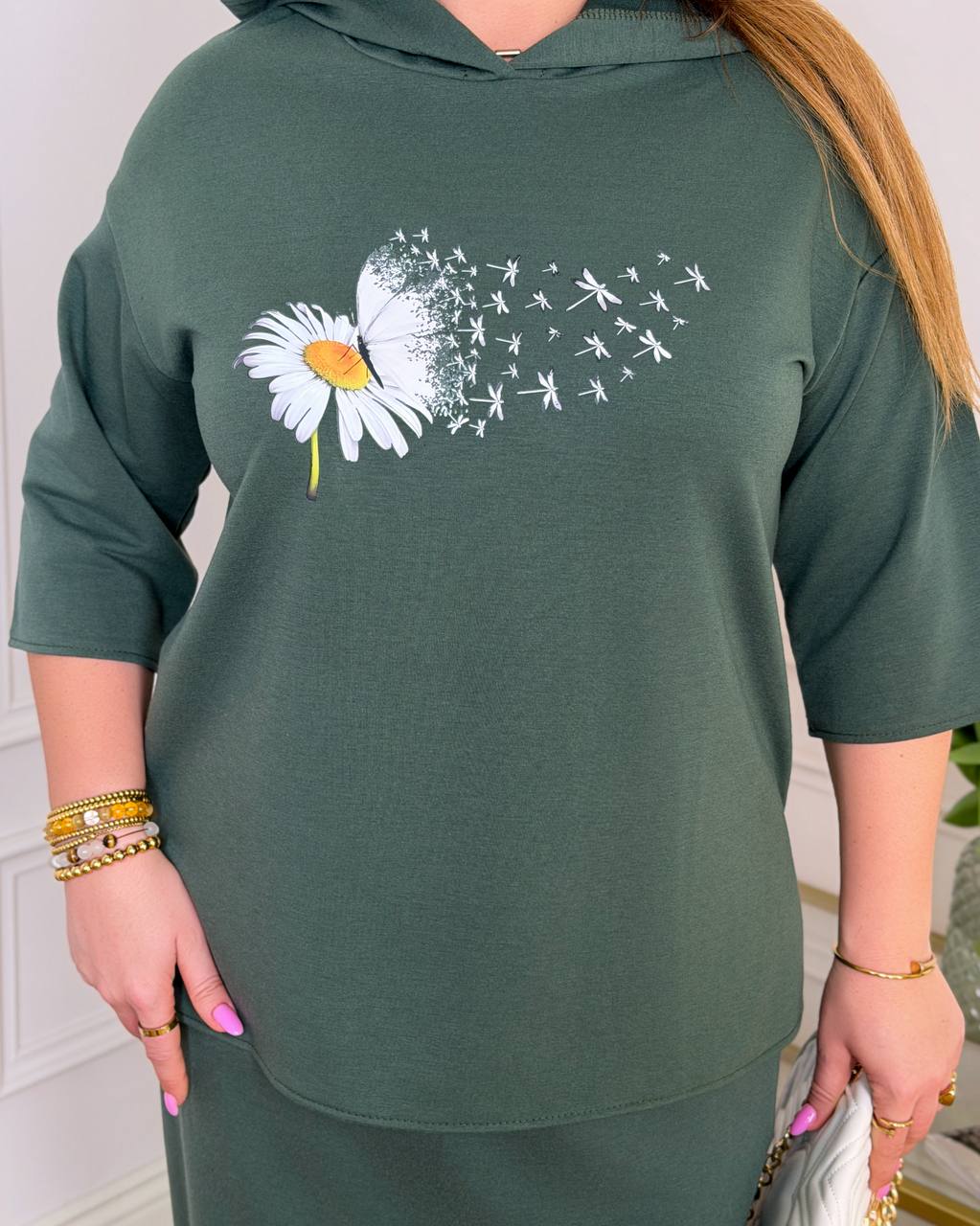 Кофта вільного крою забезпечує максимальний комфорт, має практичний капюшон та оригінальний принт, що додає образу легкості та жіночності. Спідниця прямого силуету з еластичним поясом гарно сідає по фігурі, не сковує рухів та підкреслює силует. Збоку передбачений розріз для зручності та додаткового шарму.