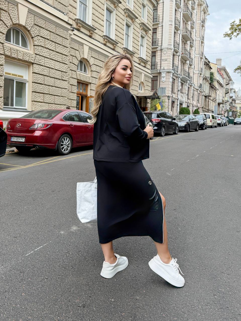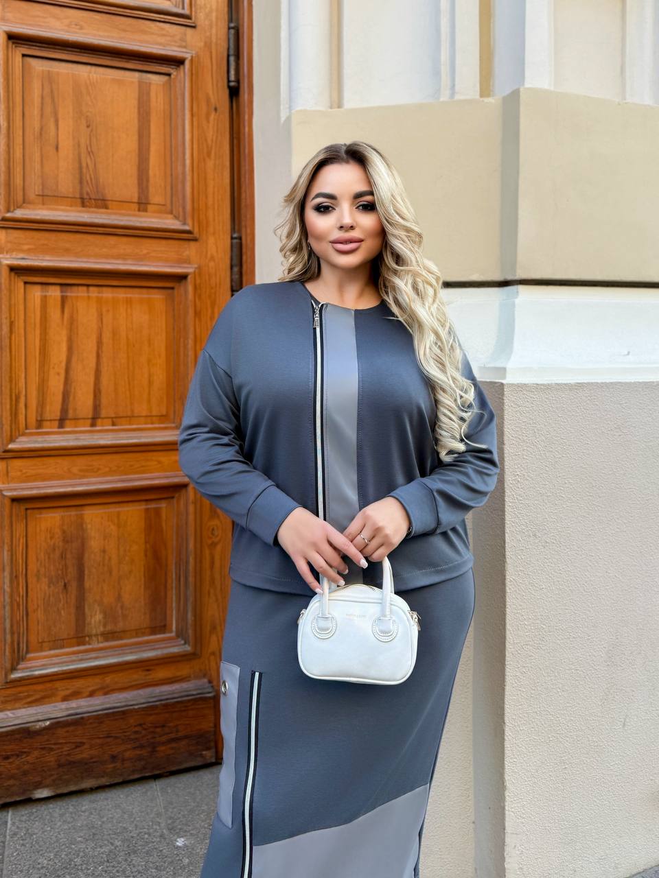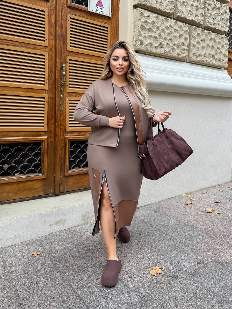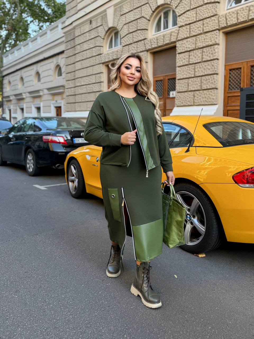 ▫️Костюм-двійка виконаний з якісної двонитки+екошкіри, яка не полиняє. Сукня має рукав 3/4, знизу молнія, яка візуально подовжує ніжку, біля неї гарна блочка. Кофта на молнії