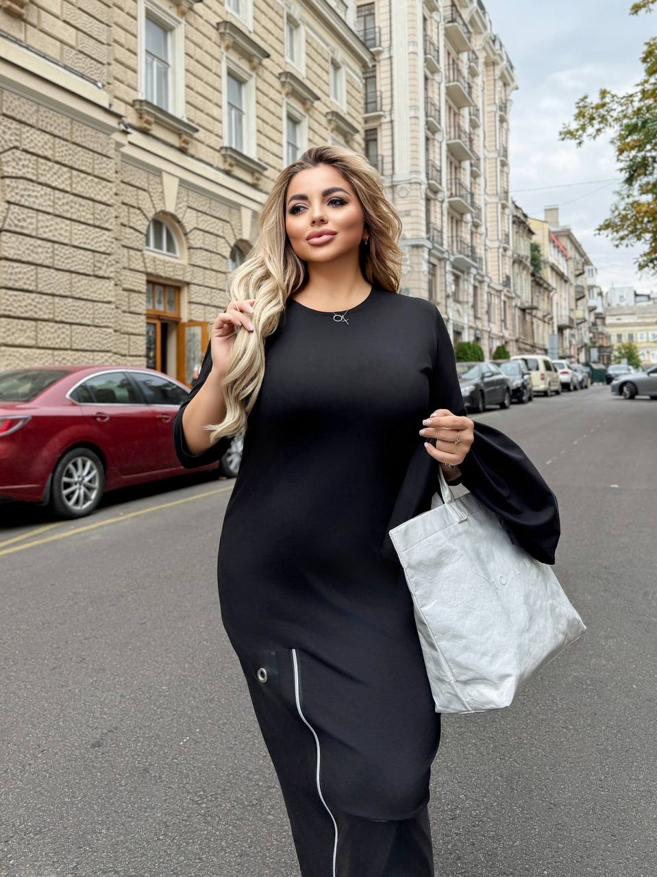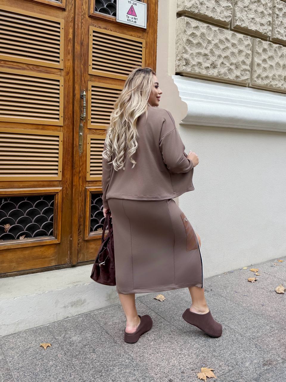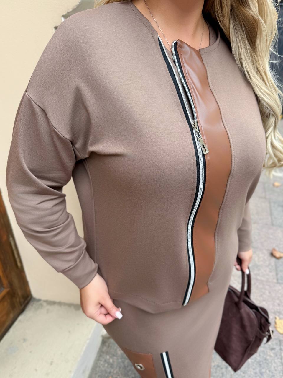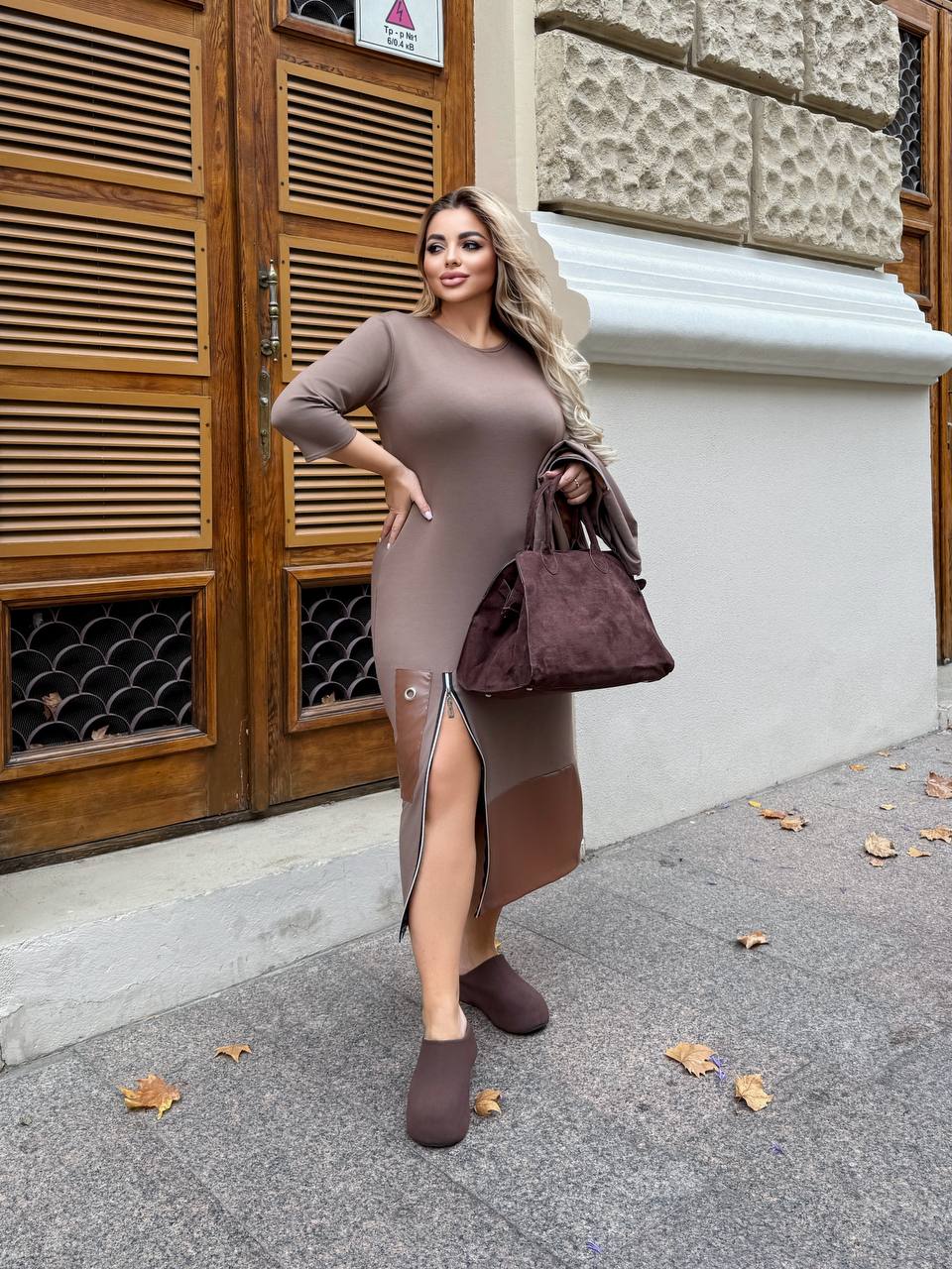 ▫️Костюм-двійка виконаний з якісної двонитки+екошкіри, яка не полиняє. Сукня має рукав 3/4, знизу молнія, яка візуально подовжує ніжку, біля неї гарна блочка. Кофта на молнії