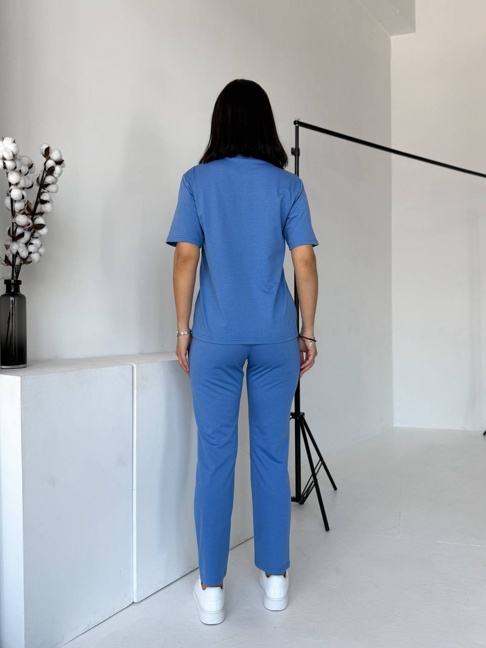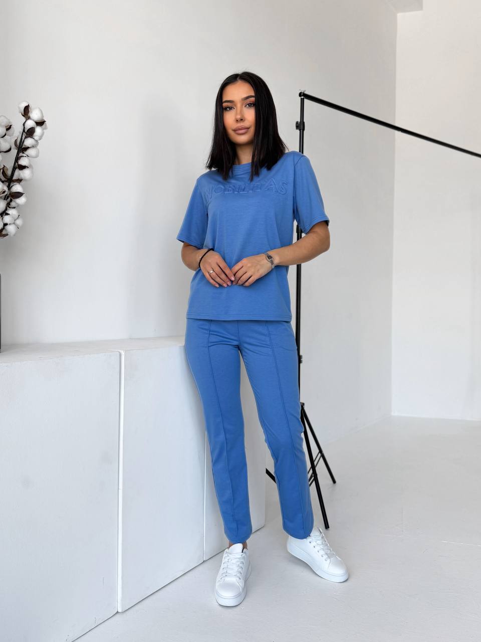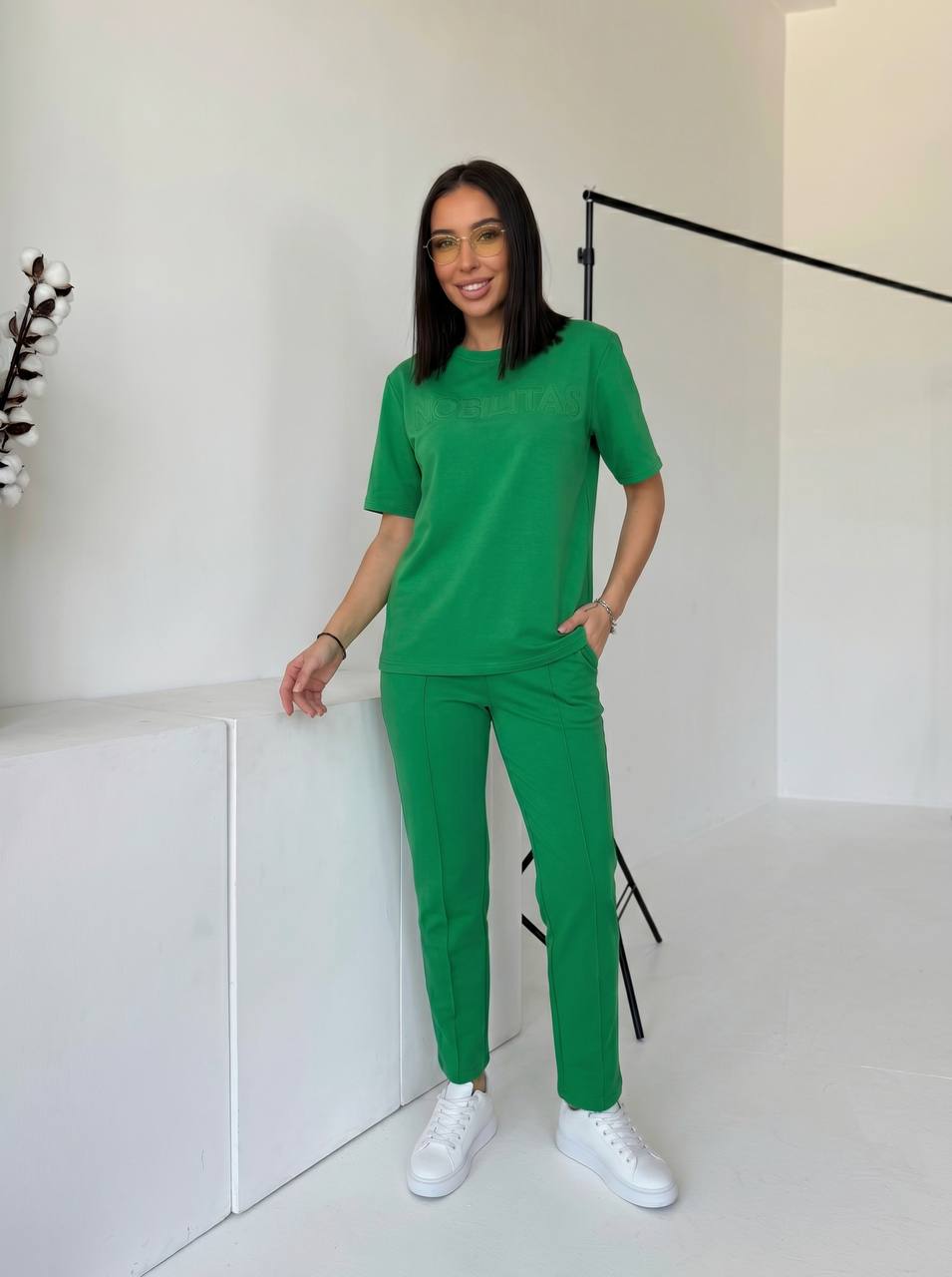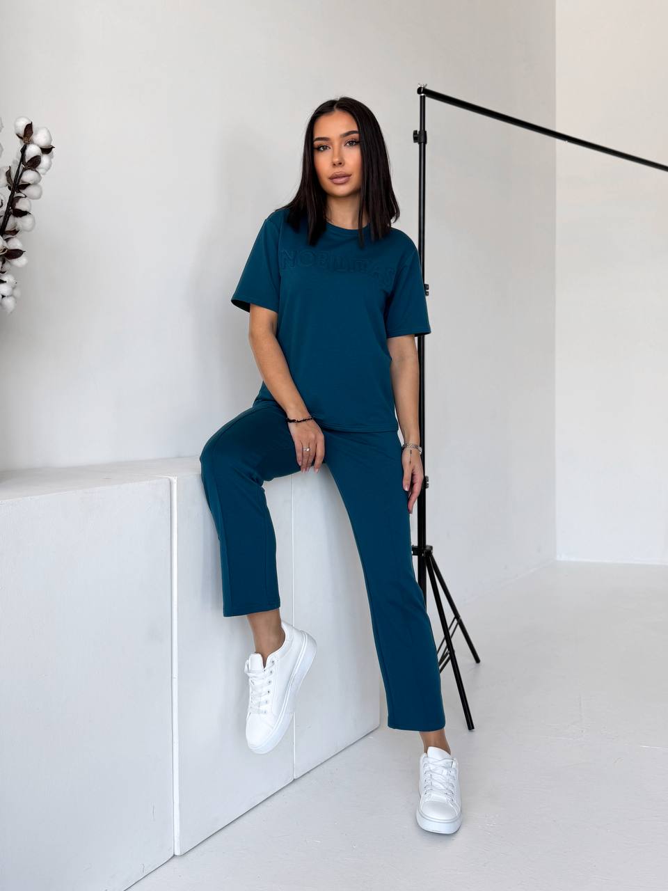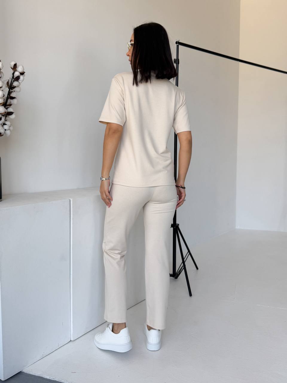 Футболка прямого силуету м’яко сідає по фігурі. Брюки зручно лягають по стегнах, мають комфортну посадку та кишені. Двонитка щільна, еластична, не просвічується й добре тримає форму.