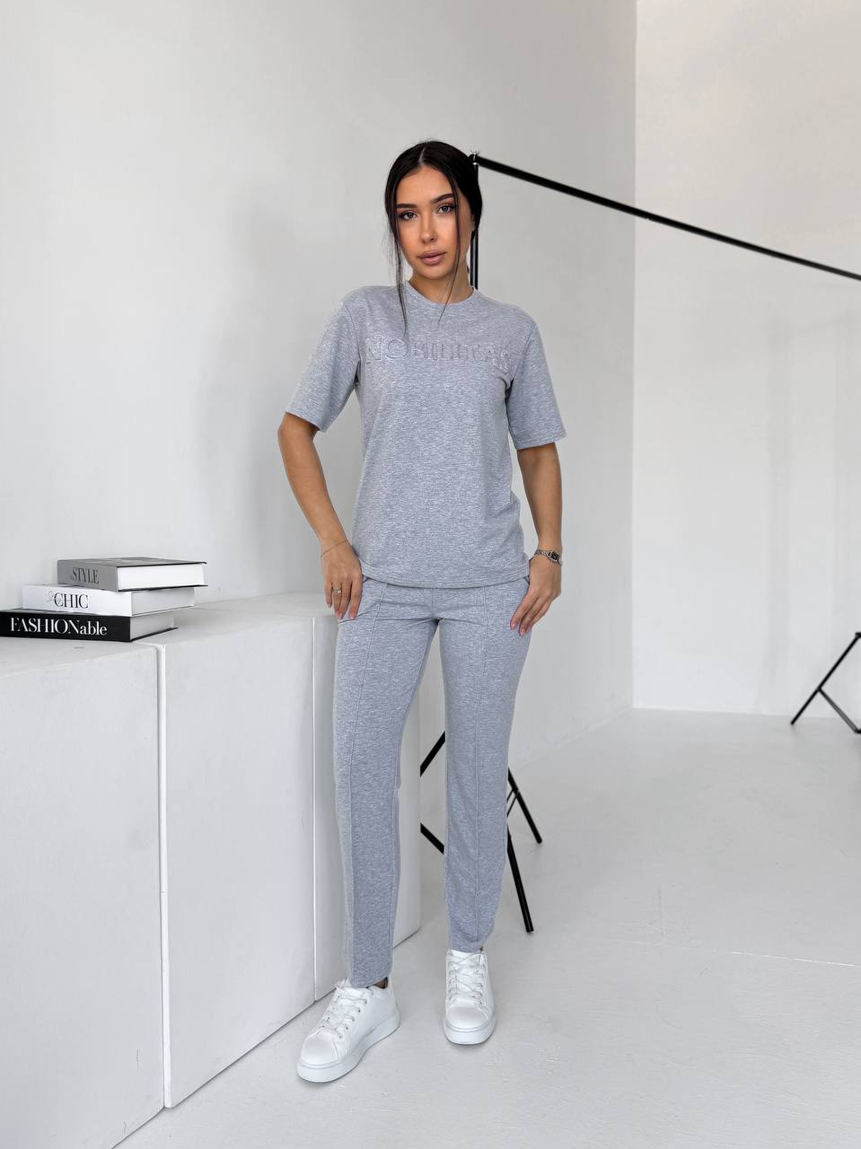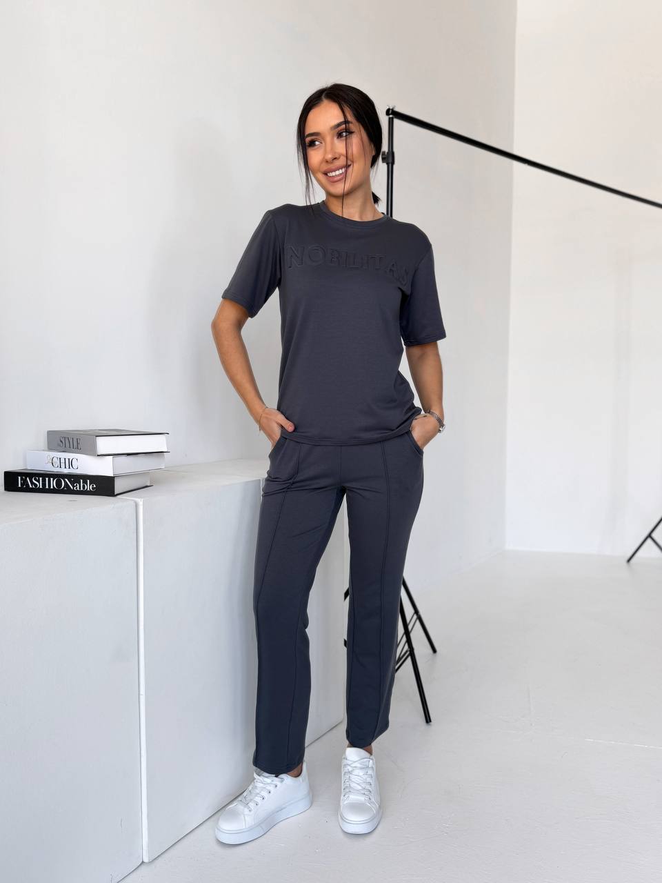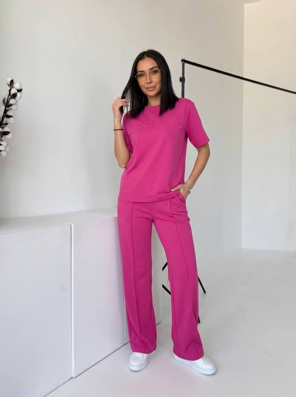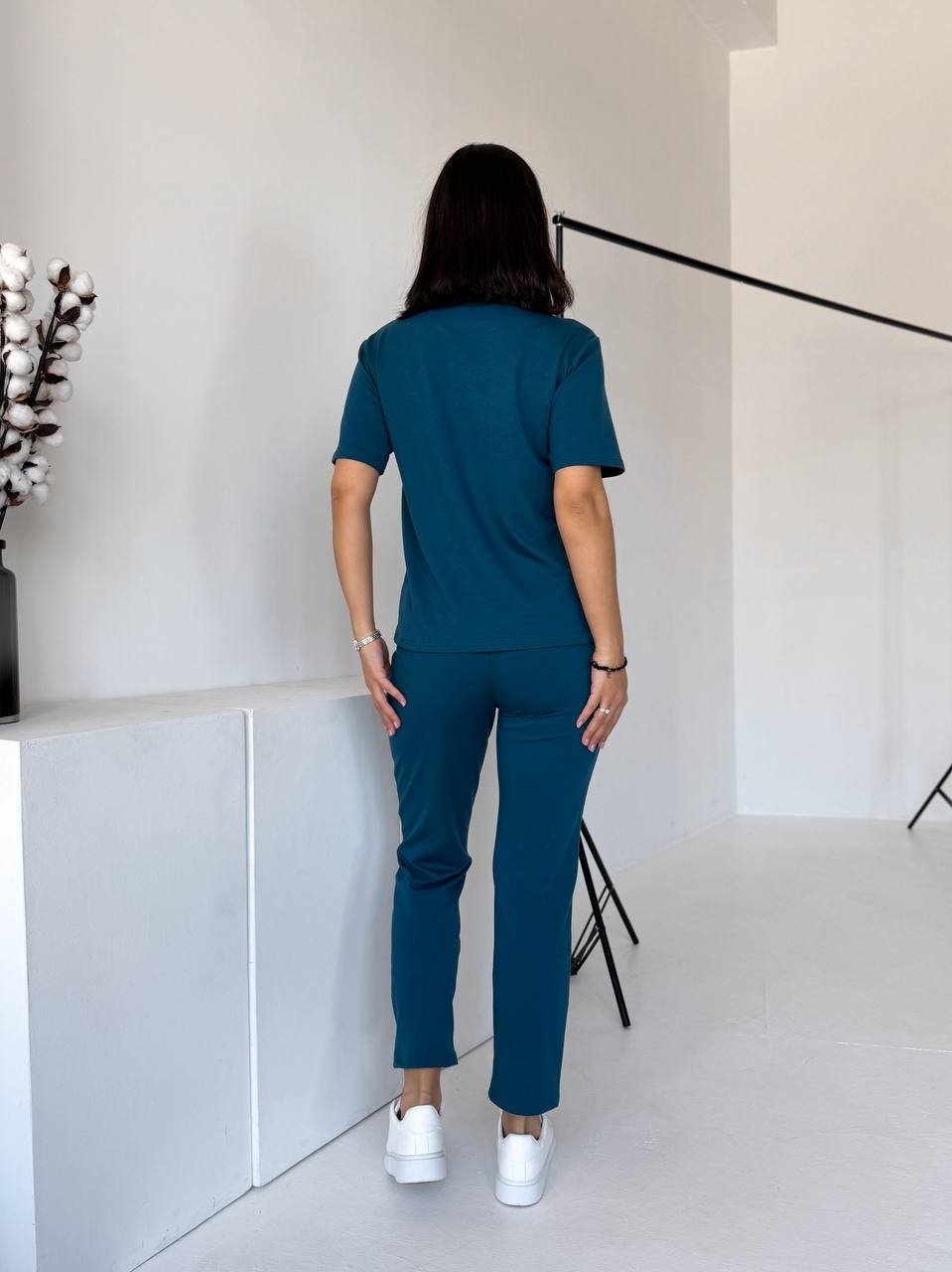Футболка прямого силуету м’яко сідає по фігурі. Брюки зручно лягають по стегнах, мають комфортну посадку та кишені. Двонитка щільна, еластична, не просвічується й добре тримає форму.