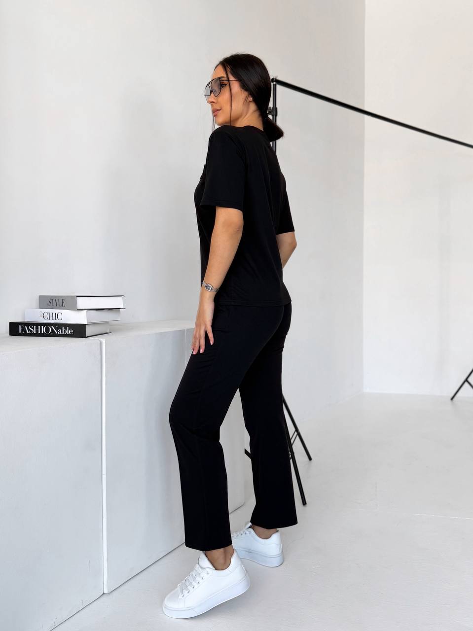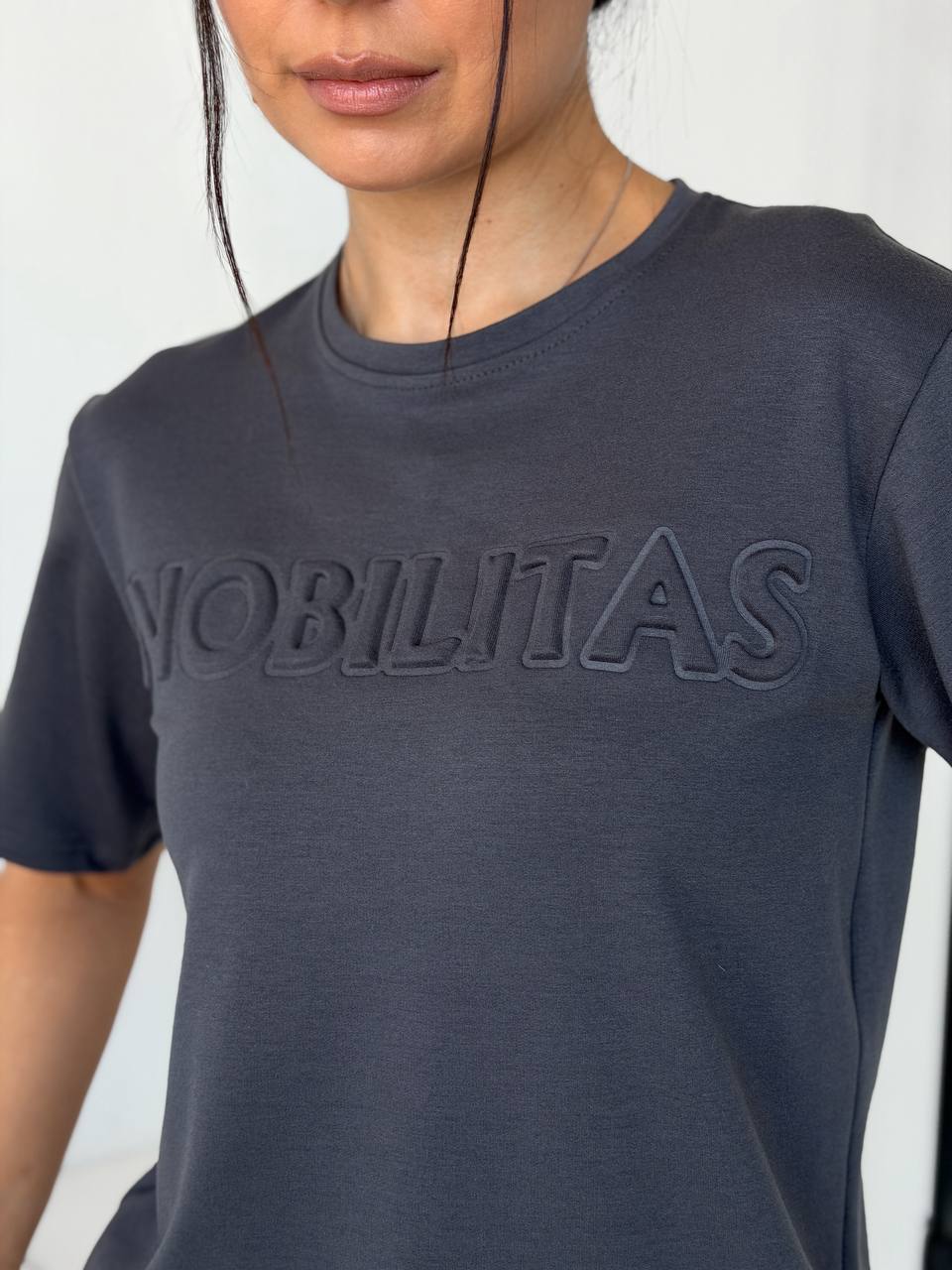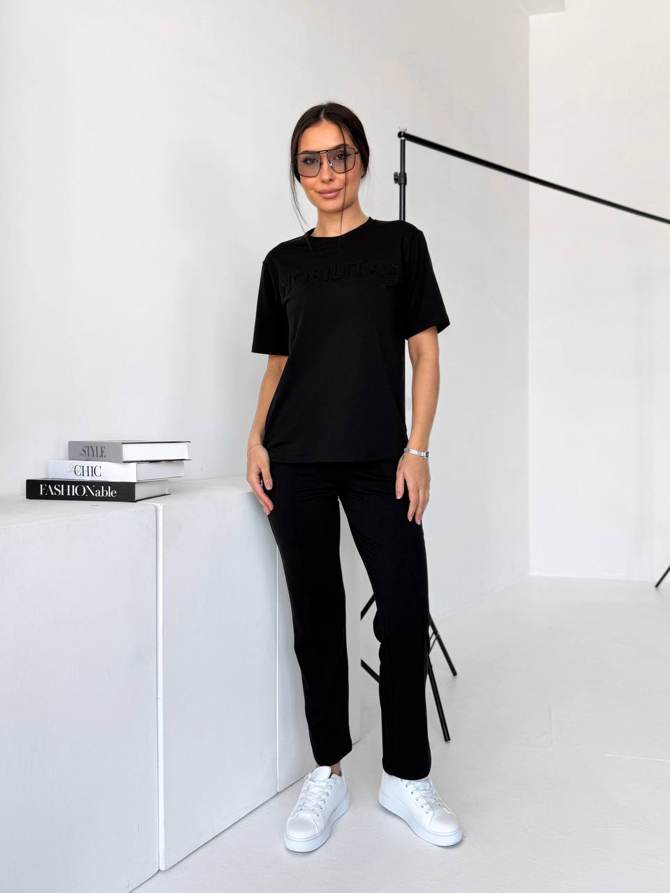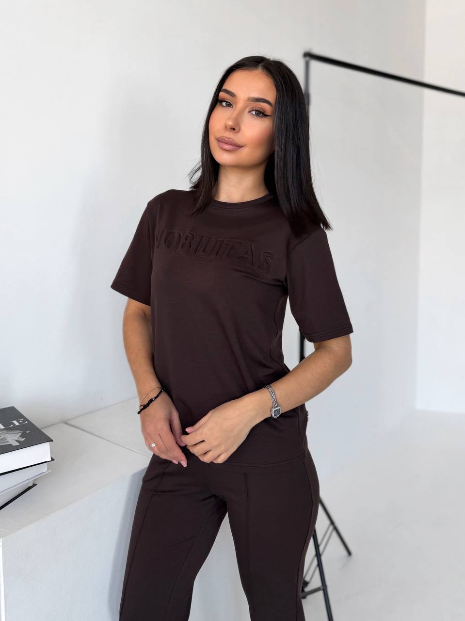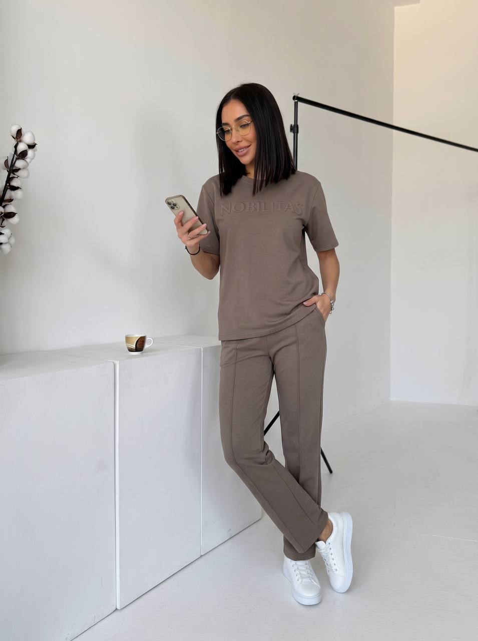Футболка прямого силуету м’яко сідає по фігурі. Брюки зручно лягають по стегнах, мають комфортну посадку та кишені. Двонитка щільна, еластична, не просвічується й добре тримає форму.