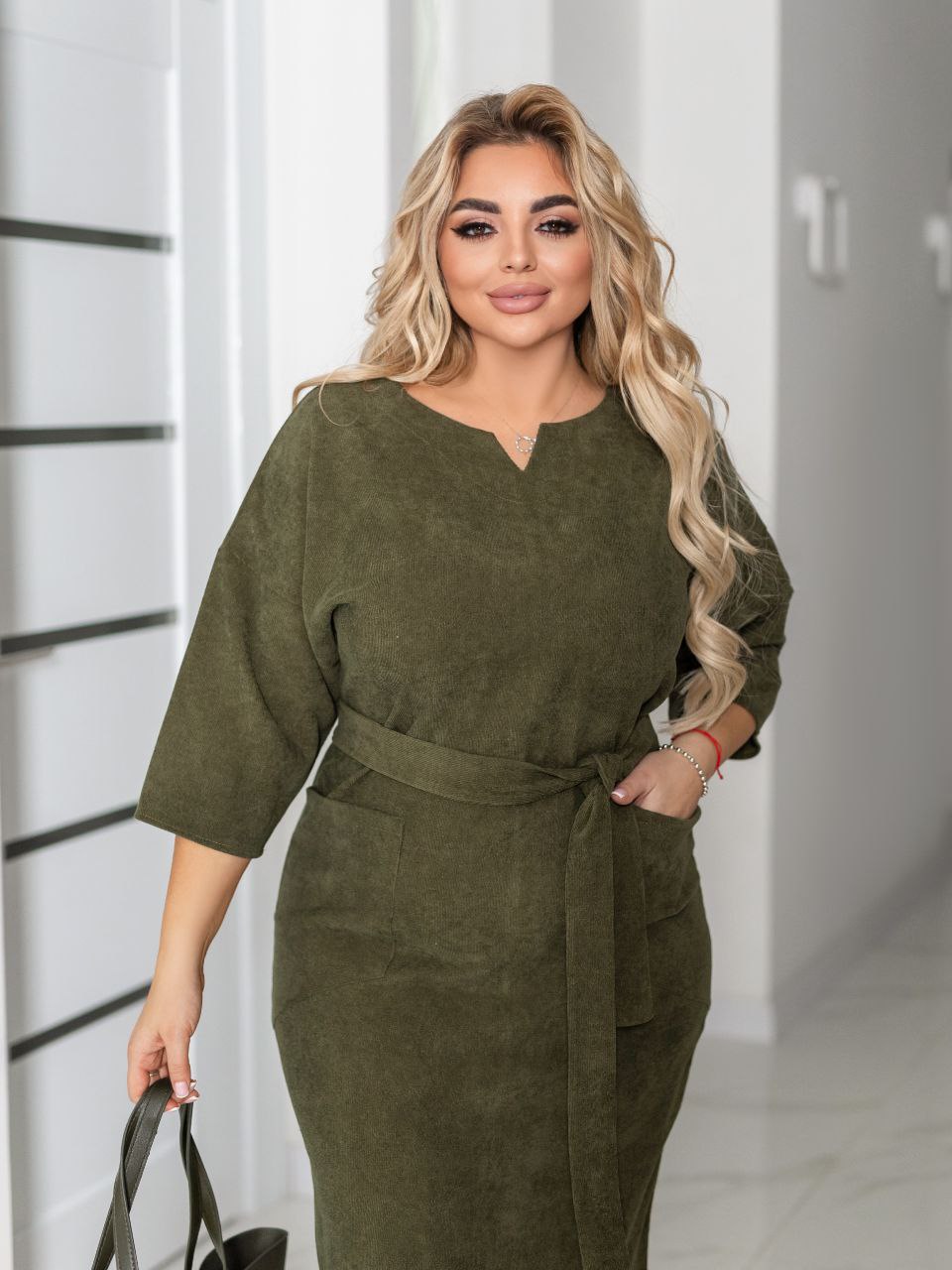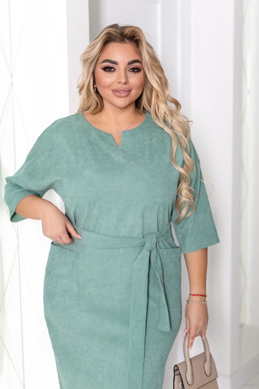 Сукня попереду має дві фігурні накладні кишені,позаду-розріз,фігурна горловина.(Без застібки).Рукав -три чверті.