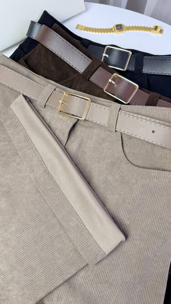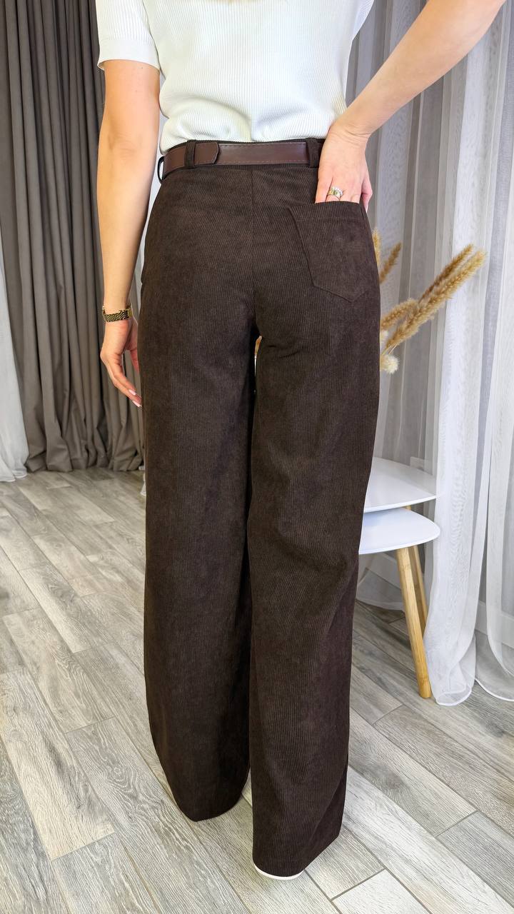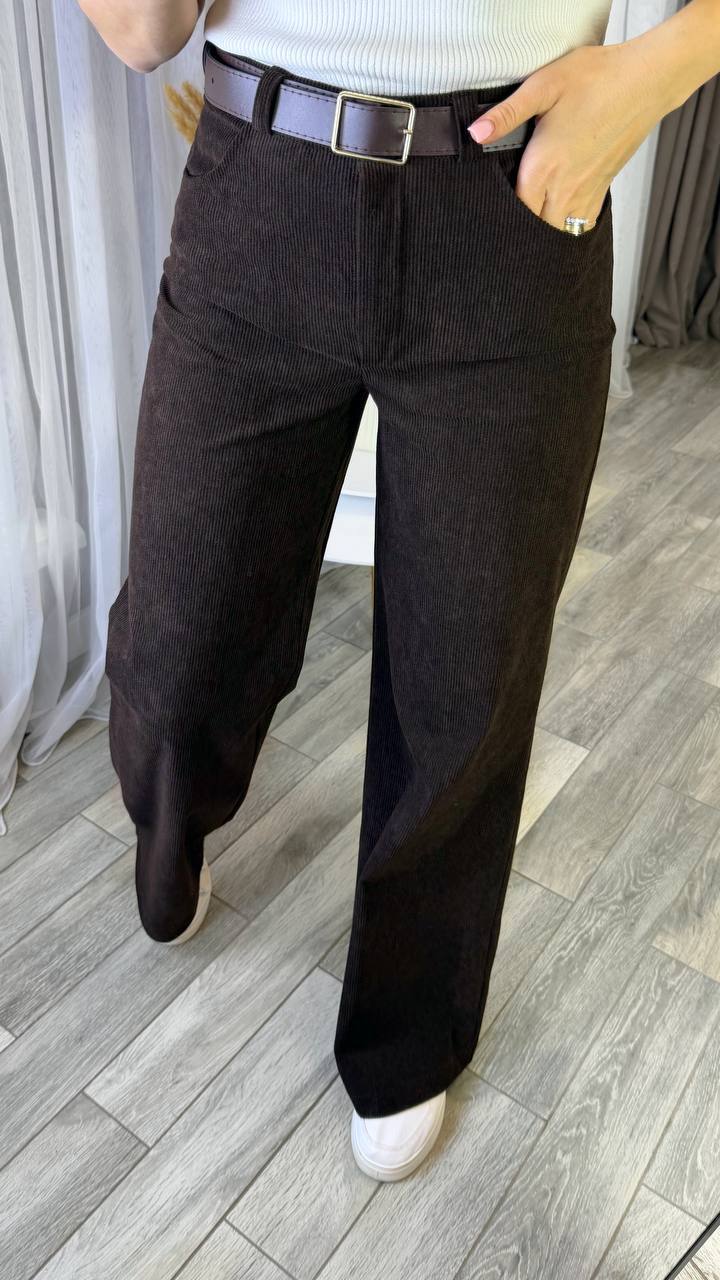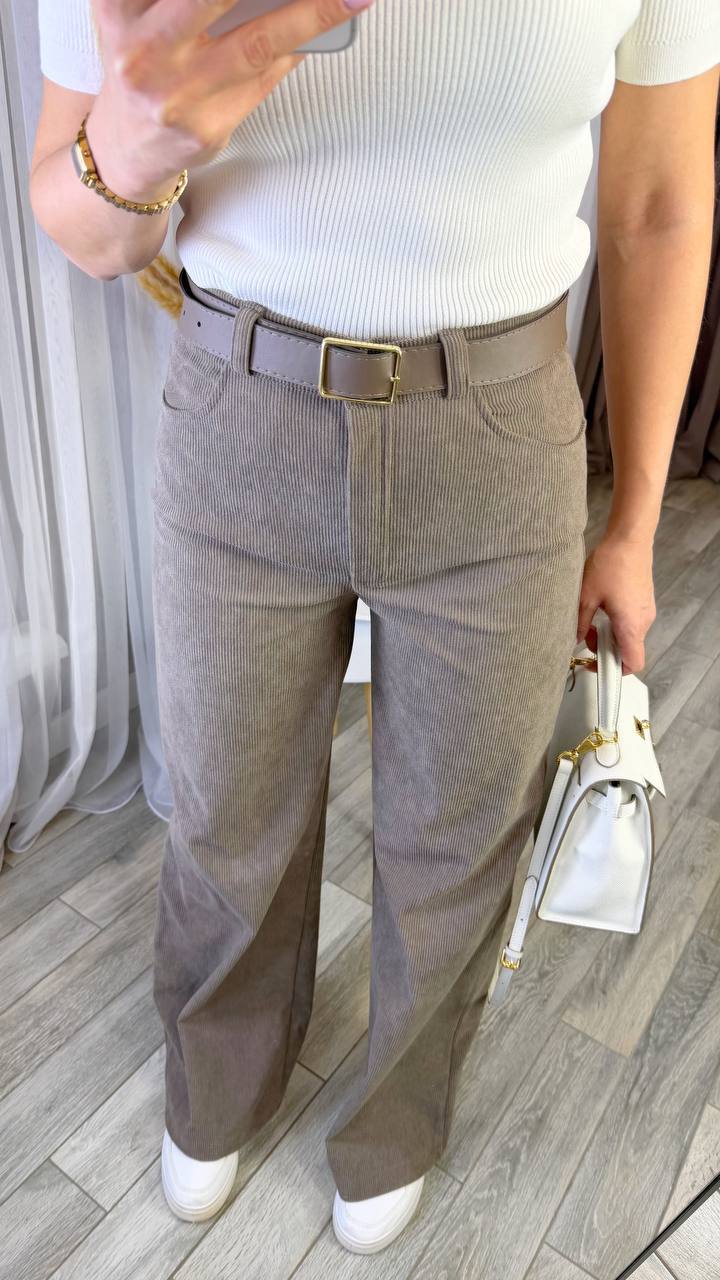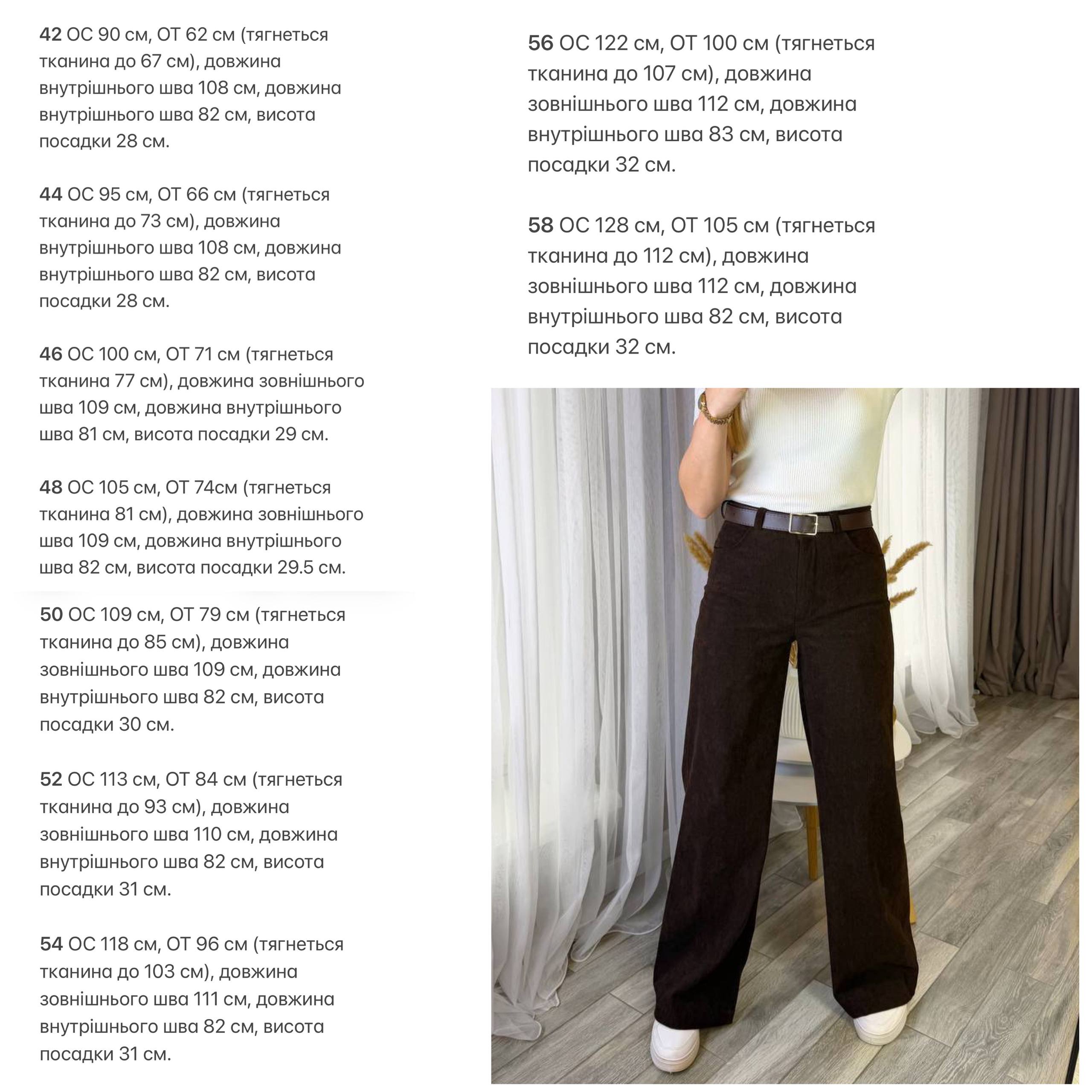 Штани з мʼякої еластичної тканини, тягнуться, з двома кишенями попереду, позаду 1 кишеня, застібаються на ґудзик та блискавку.