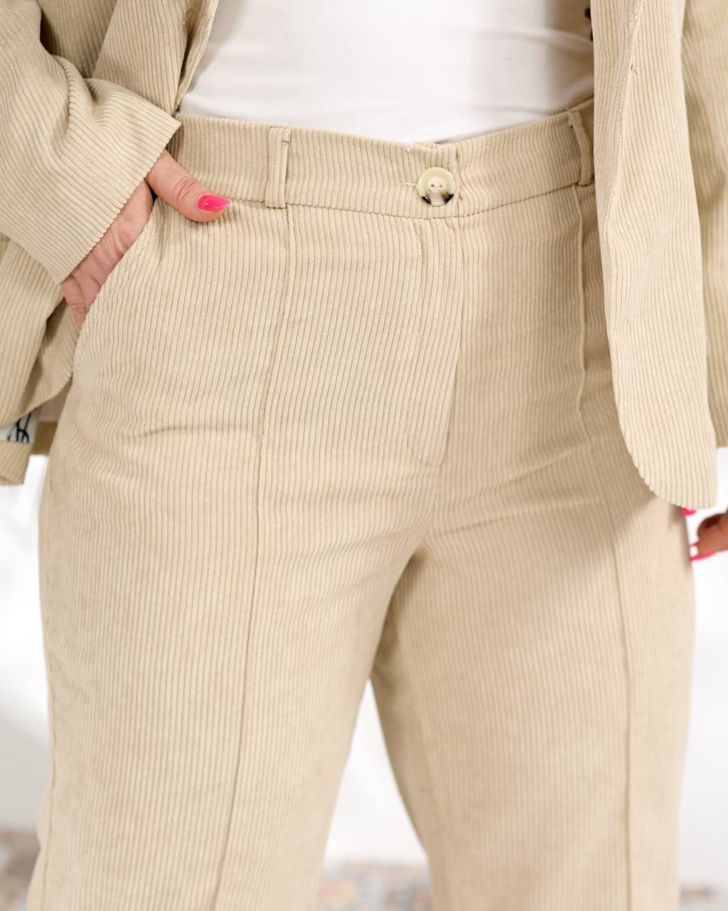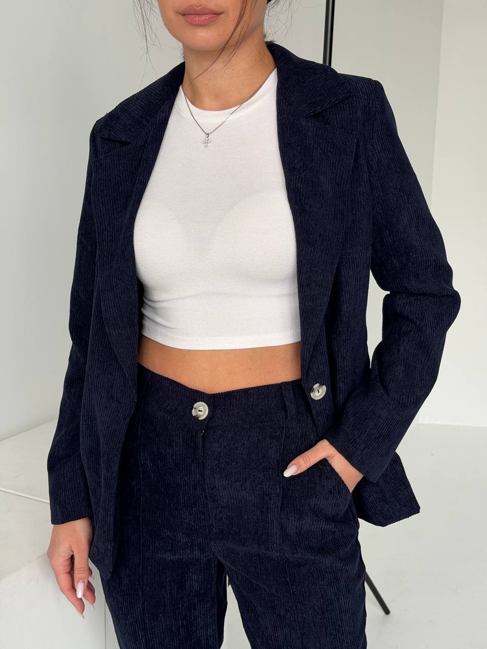 Піджак приталений на підкладці , з імітацією кишені, на ґудзику. Брюки прямі , з кишенями, позаду пояс на резинці.