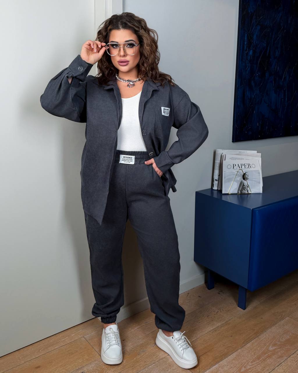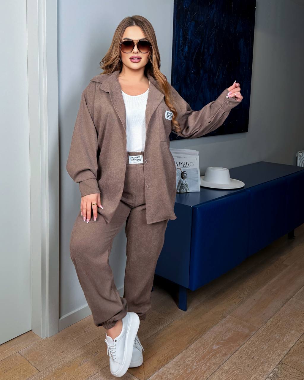 Стильний костюм з оверсайс сорочки на ґудзиках та джокерів на широкому поясі