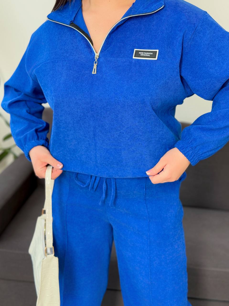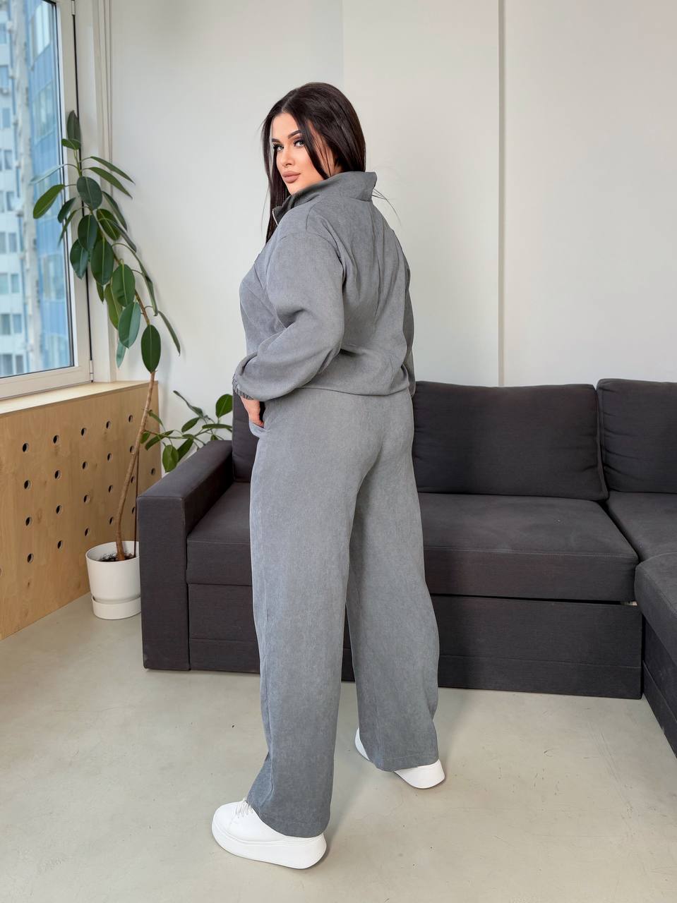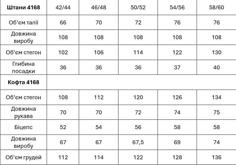 Кофтина зі спущеними рукавами, низ регулюється кулискою. Брюки універсальні, рівного крою з відстроченими стрілами, мають дві кишені, єластичний пояс теж регулюються кулискою. І як завжди з гарною посадкою. Пасує до будь якої сітуації, окрім того дуже комфортний