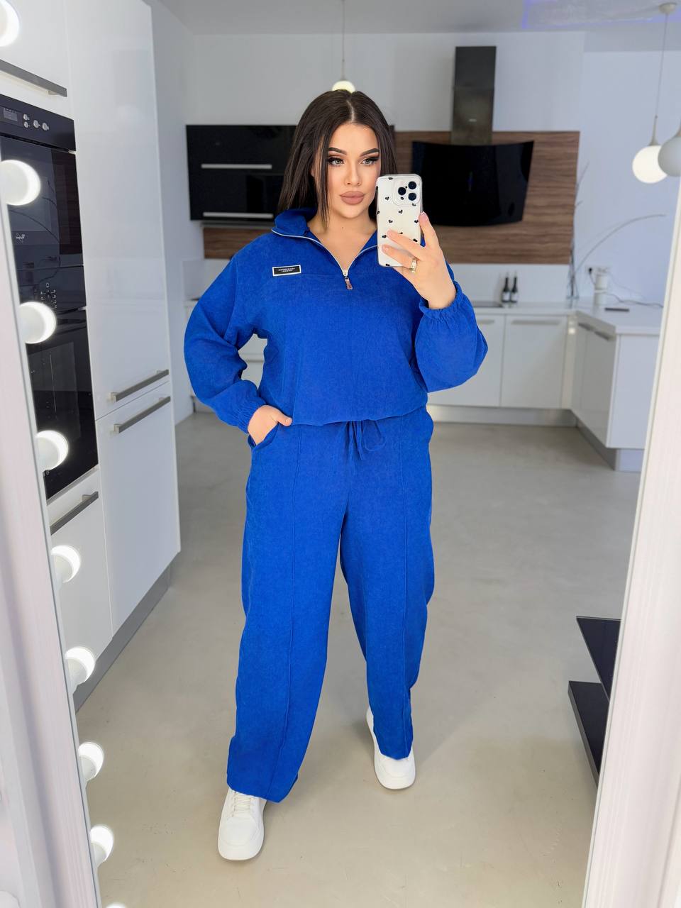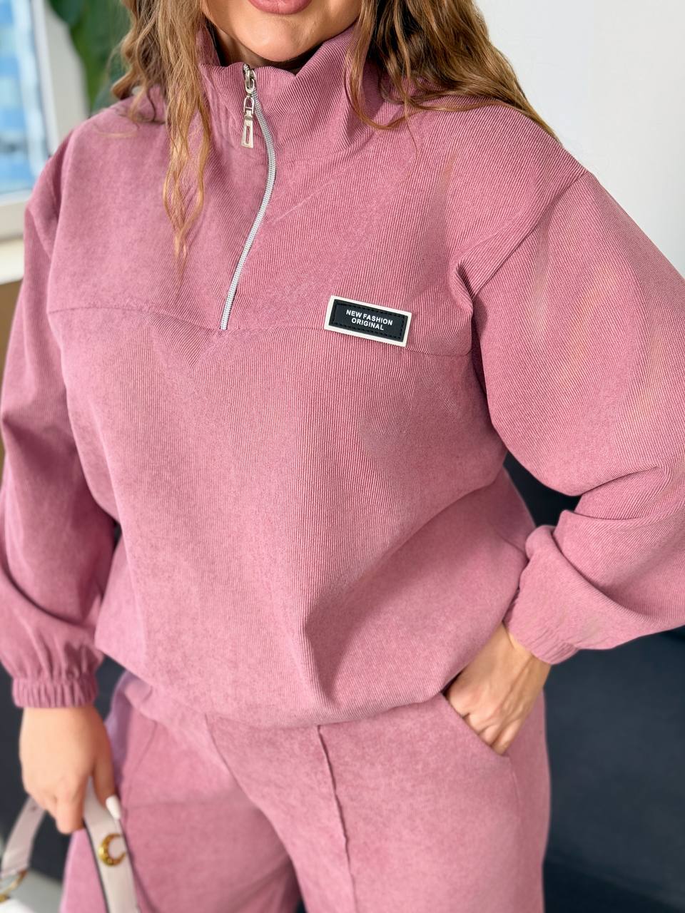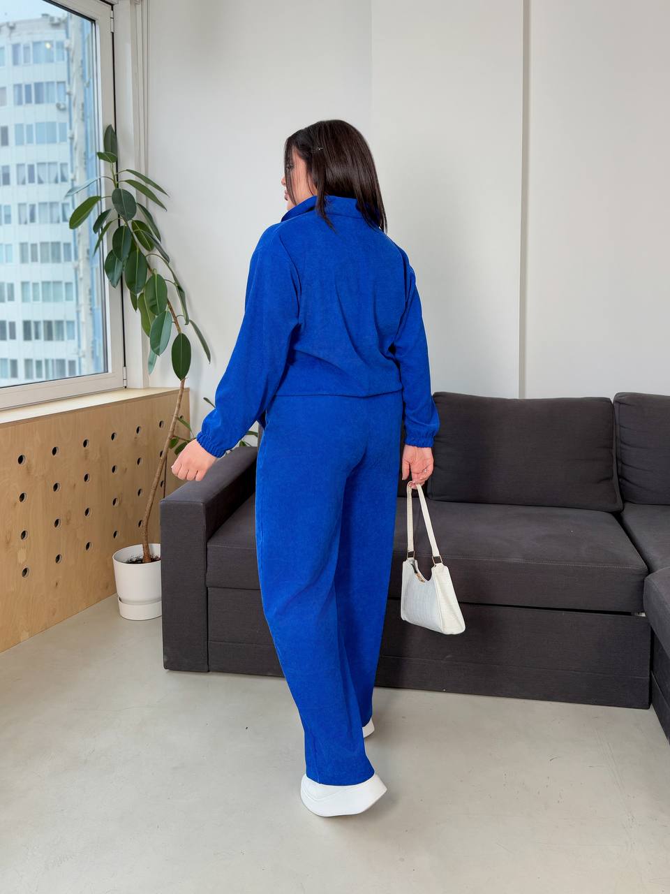 Кофтина зі спущеними рукавами, низ регулюється кулискою. Брюки універсальні, рівного крою з відстроченими стрілами, мають дві кишені, єластичний пояс теж регулюються кулискою. І як завжди з гарною посадкою. Пасує до будь якої сітуації, окрім того дуже комфортний
