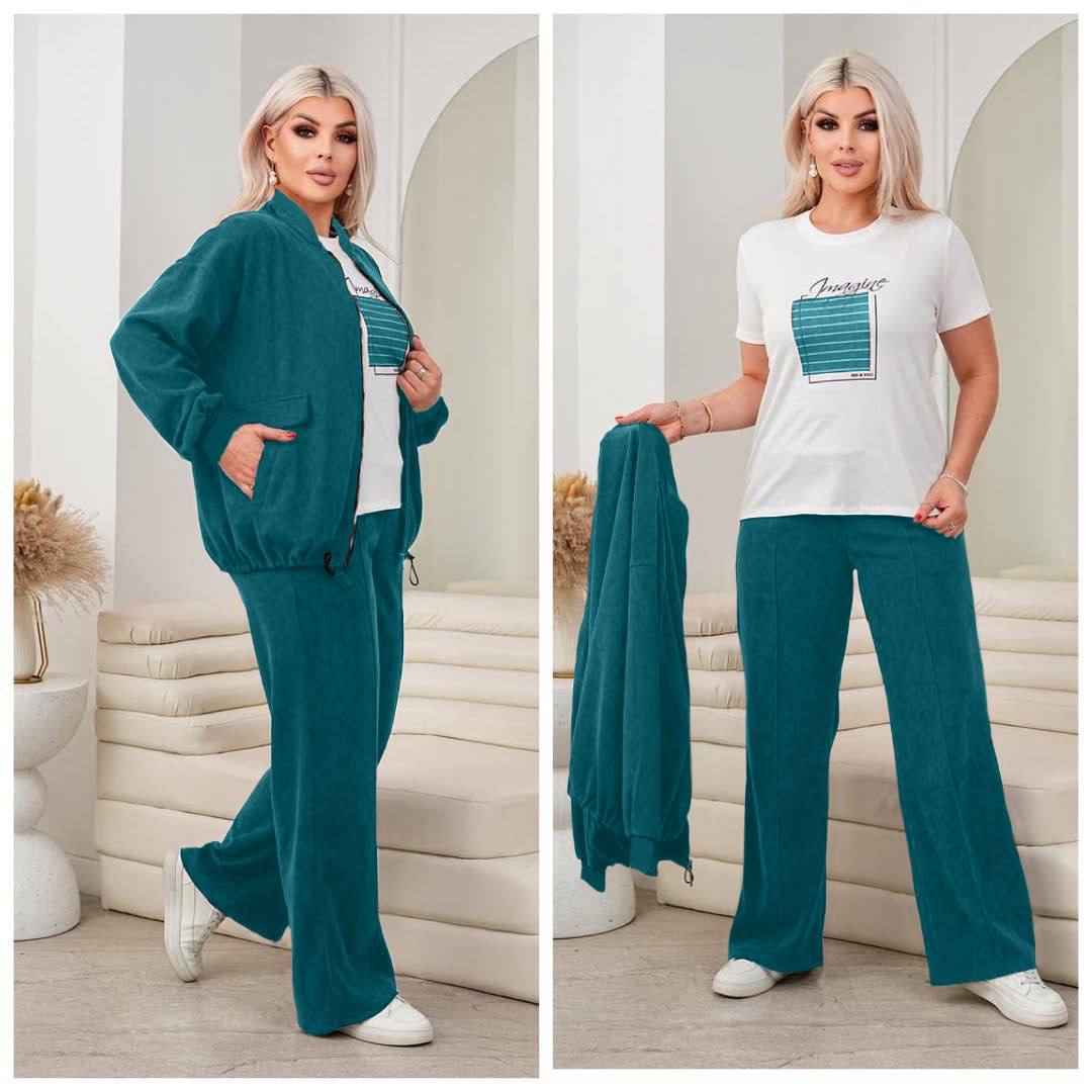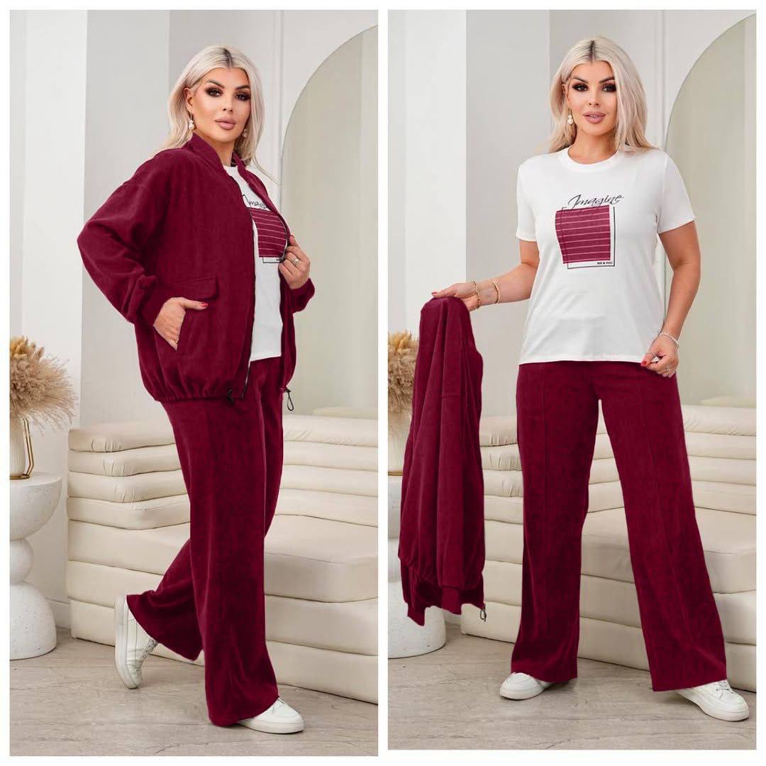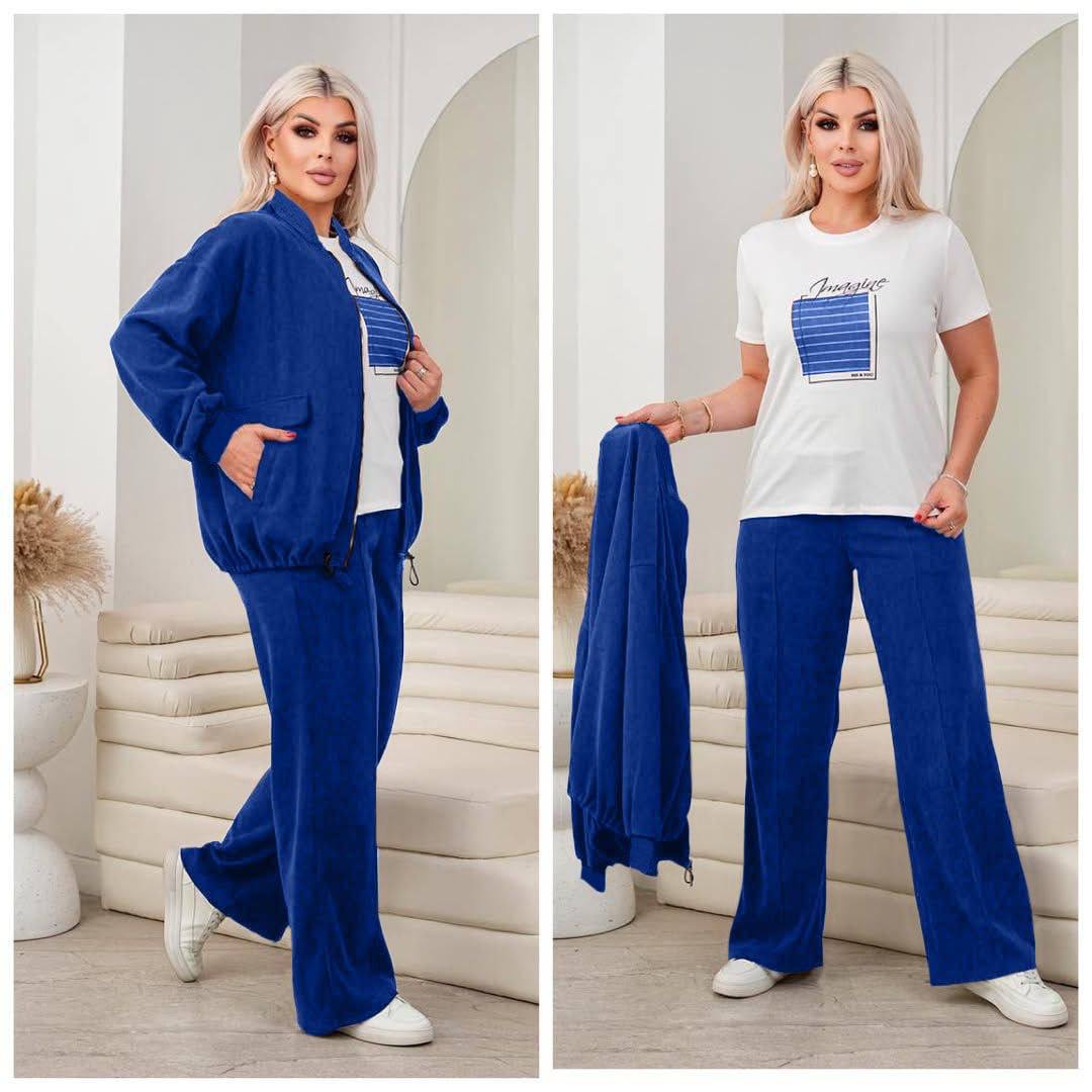 Стильний та комфортний костюм-трійка, який складається з кофти на блискавці, штанів та футболки. Легка, м’яка тканина приємна до тіла та не обмежує рухи — ідеальний варіант для щоденного носіння.