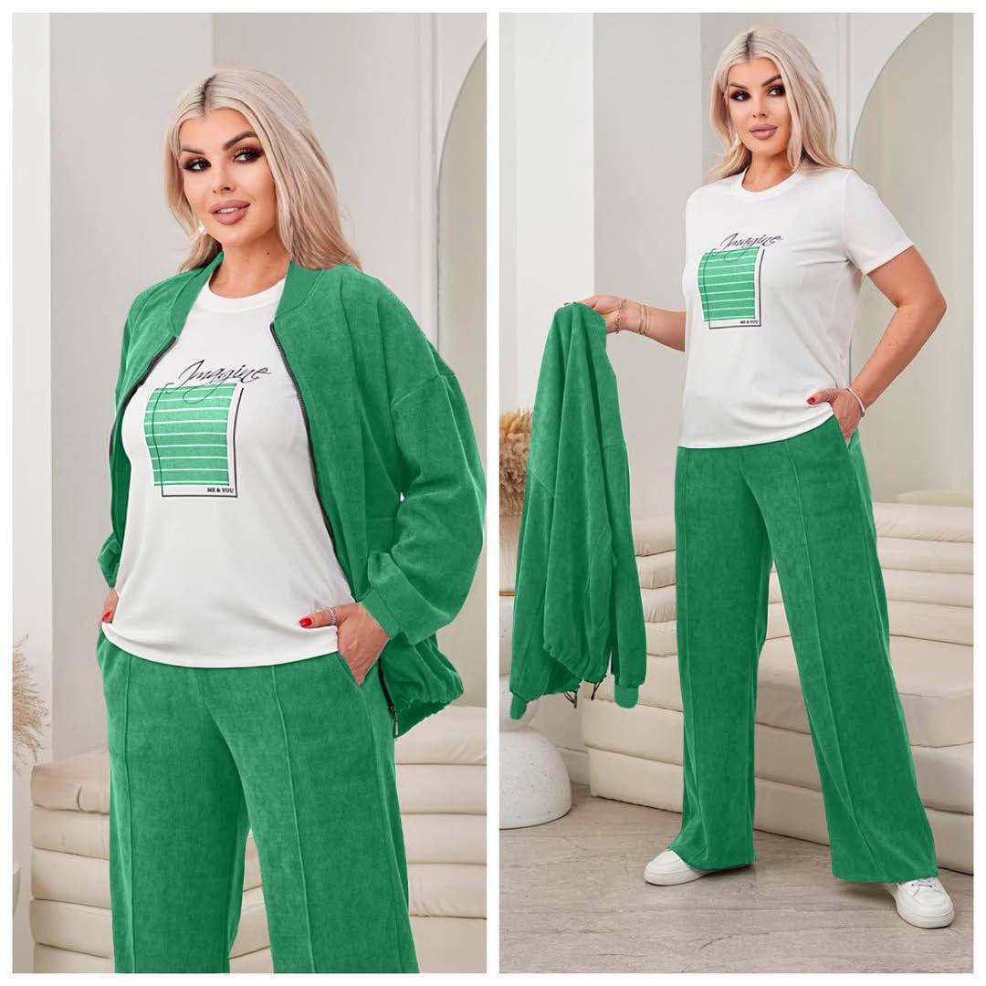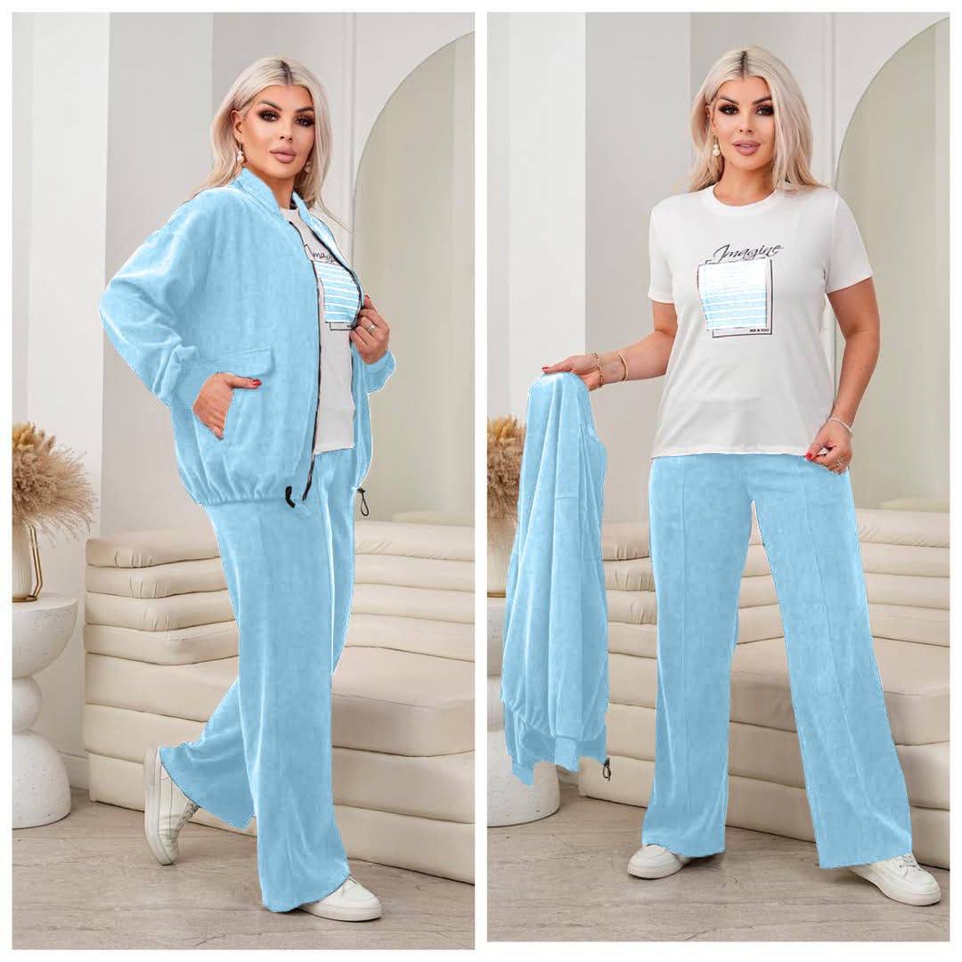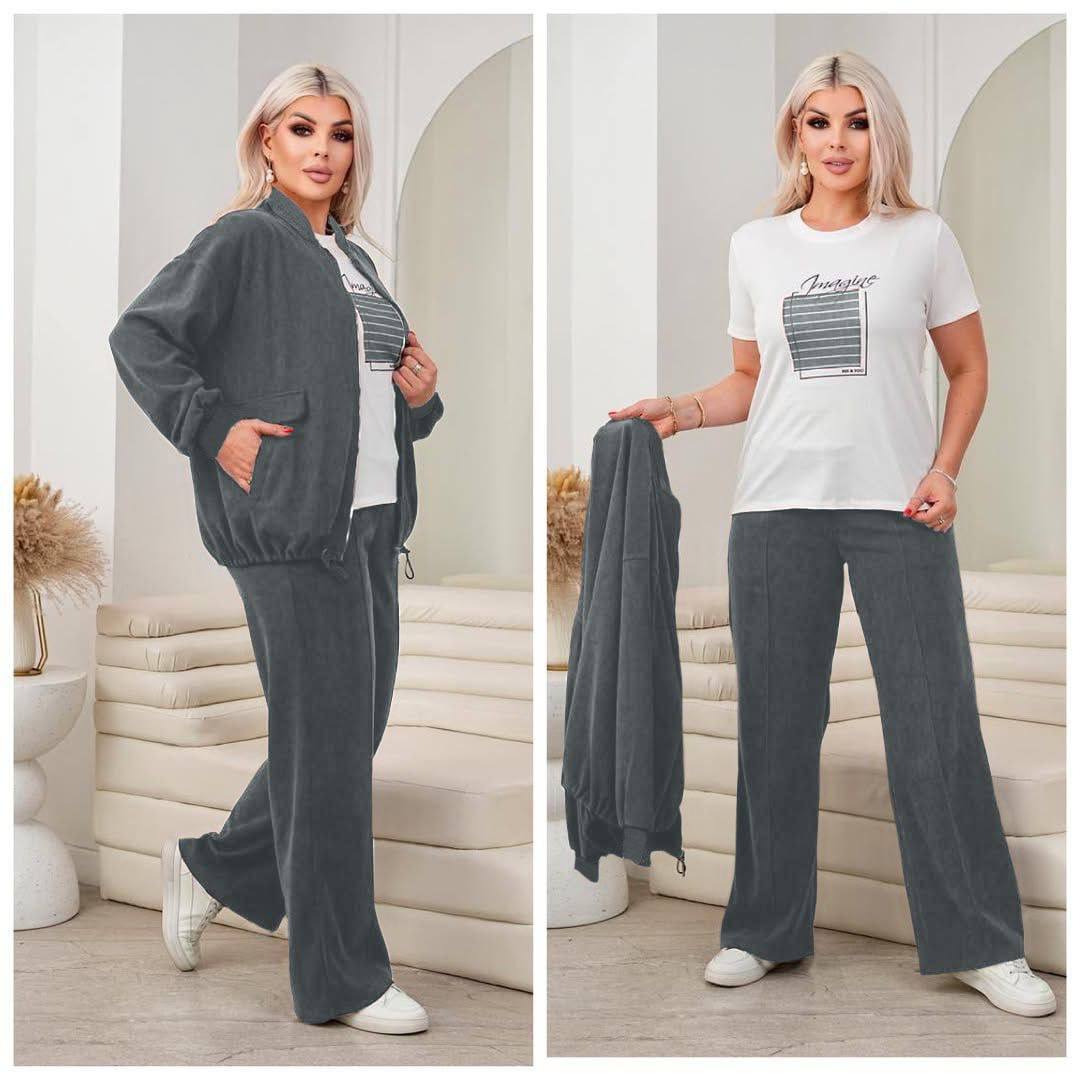 Стильний та комфортний костюм-трійка, який складається з кофти на блискавці, штанів та футболки. Легка, м’яка тканина приємна до тіла та не обмежує рухи — ідеальний варіант для щоденного носіння.