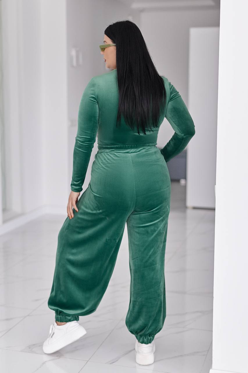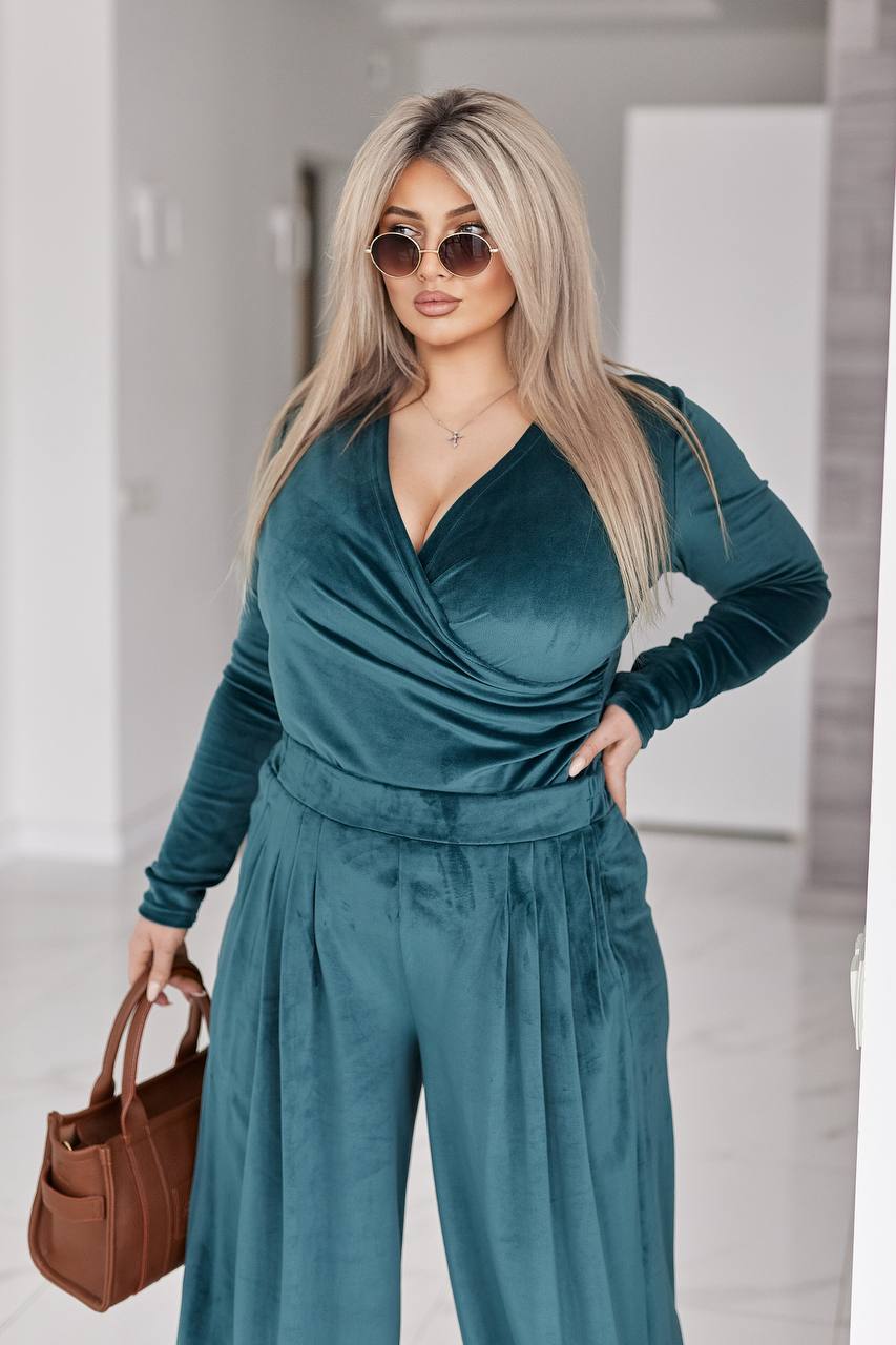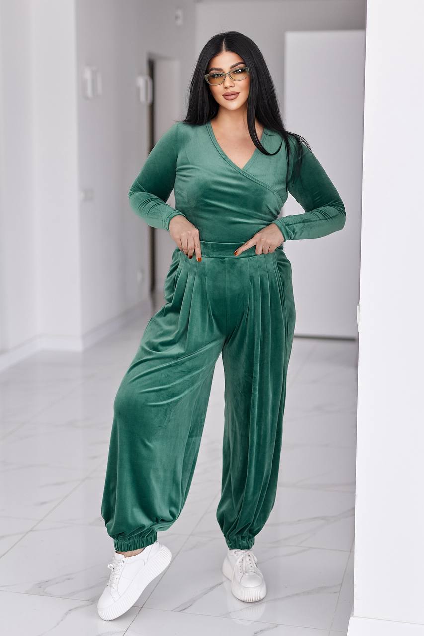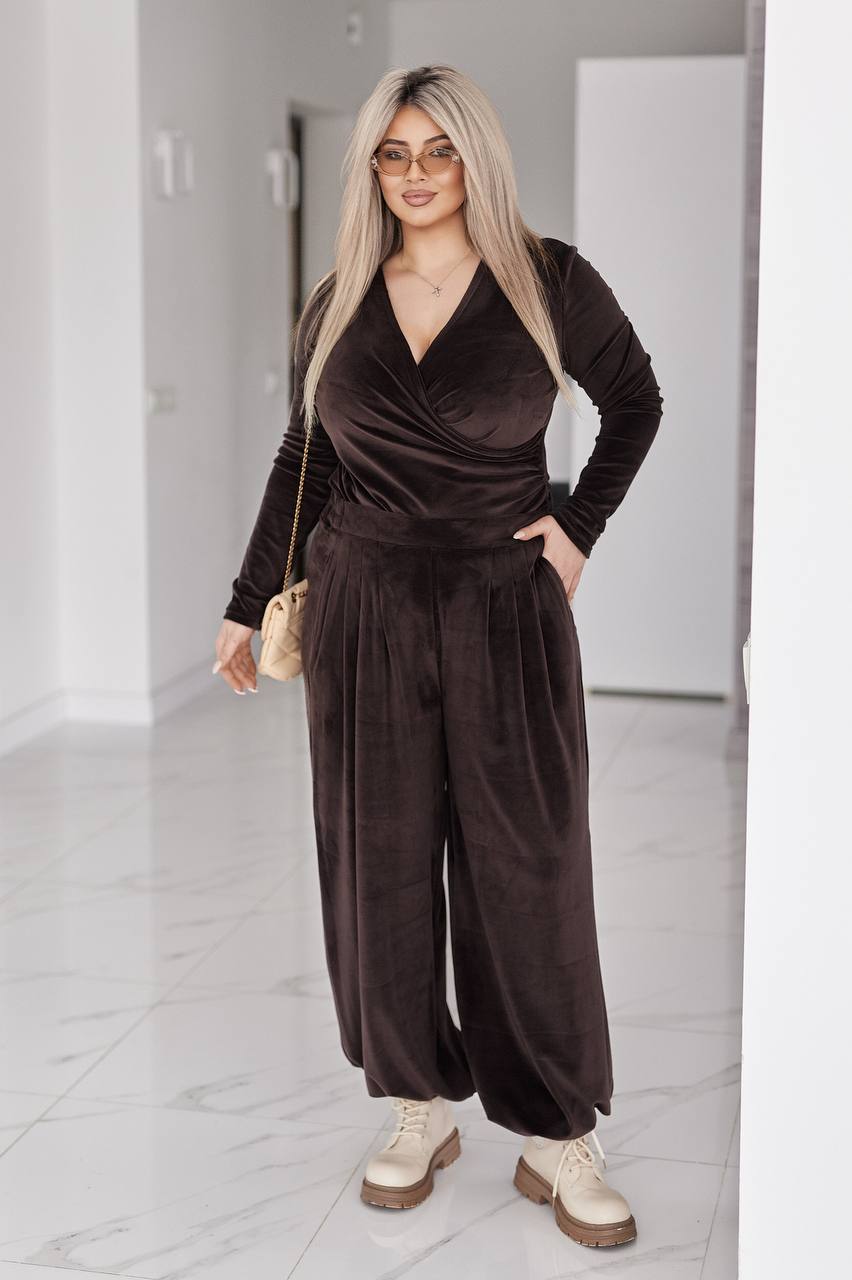 Стильний жіночий костюм у трендових відтінках, що поєднує комфорт і витончену жіночність. Виконаний з м’якого, приємного до тіла велюру з легким благородним блиском, який красиво переливається при русі.