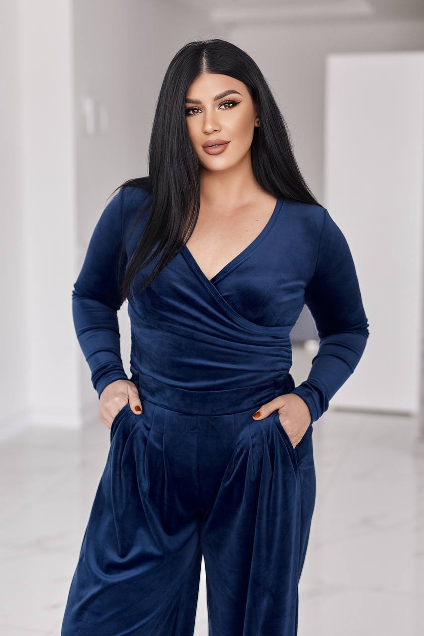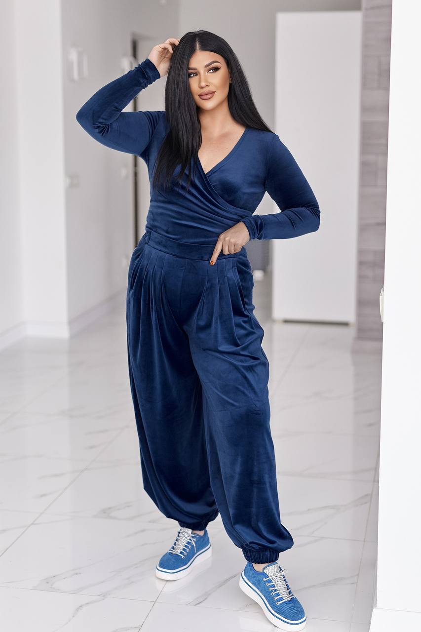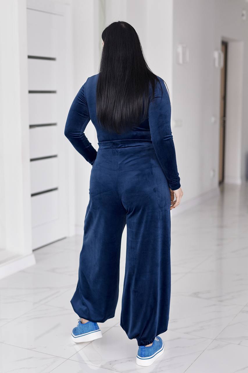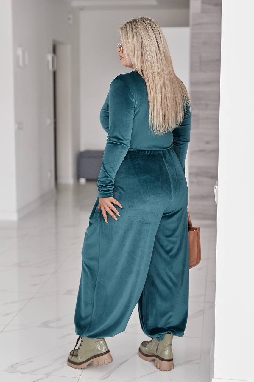 Стильний жіночий костюм у трендових відтінках, що поєднує комфорт і витончену жіночність. Виконаний з м’якого, приємного до тіла велюру з легким благородним блиском, який красиво переливається при русі.