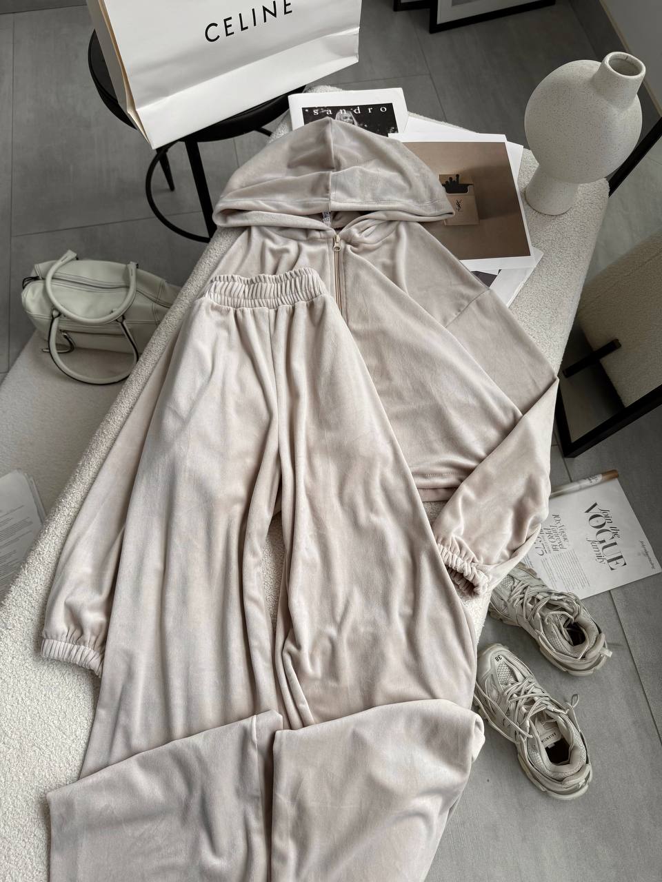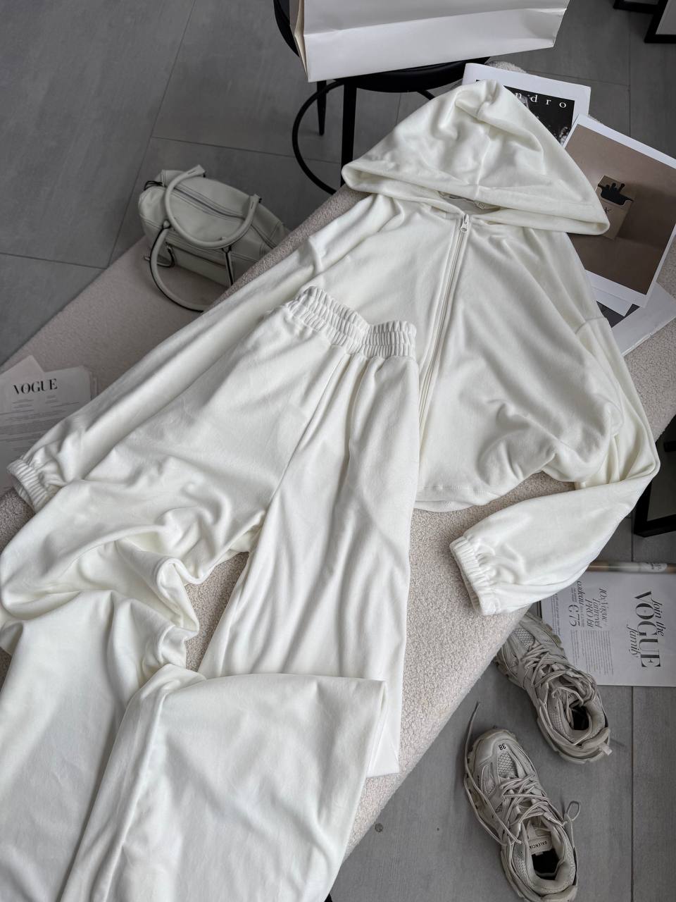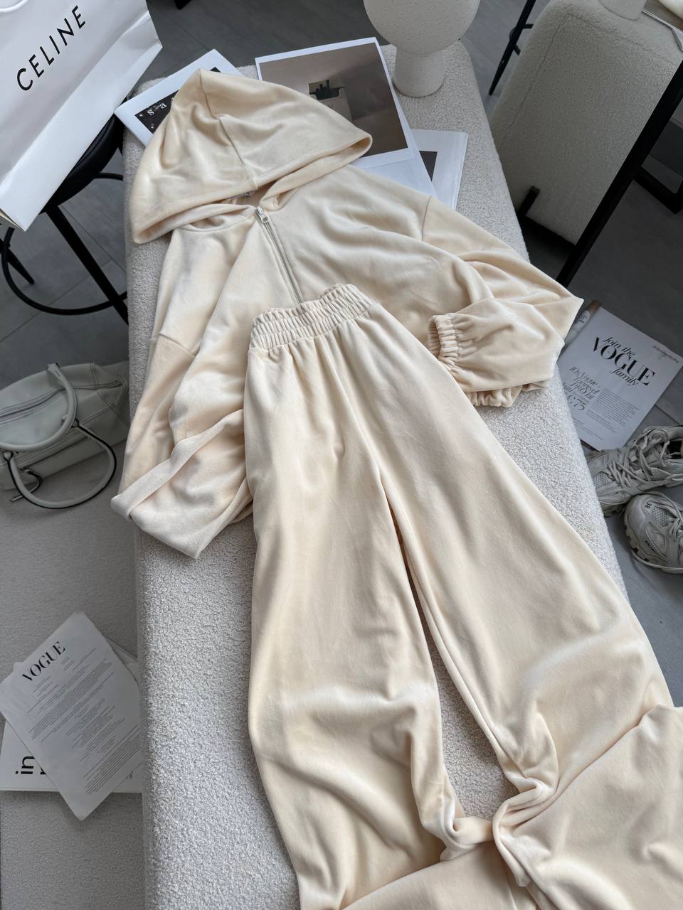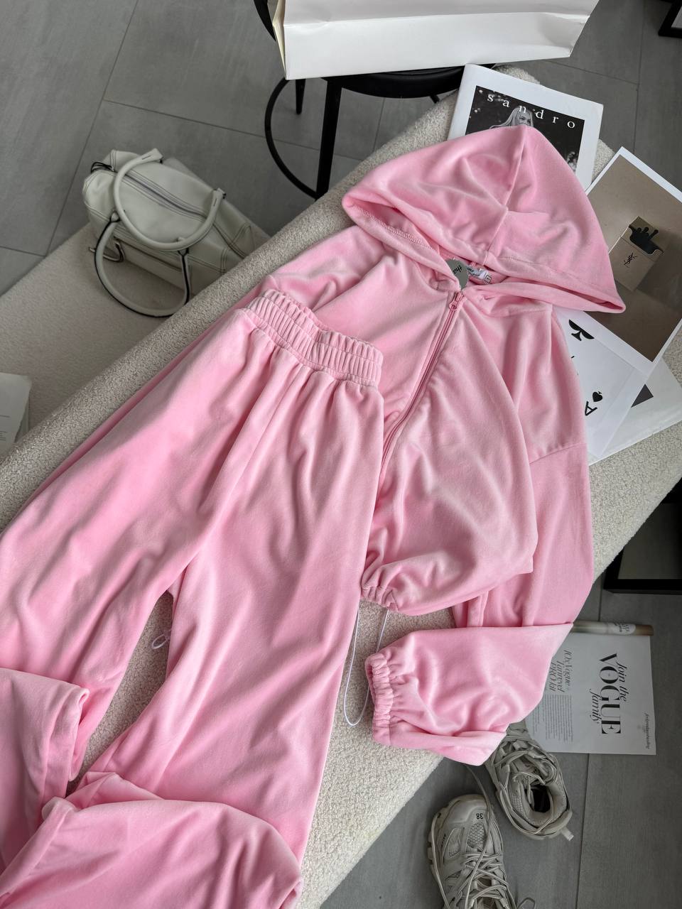 Ніжний та легкий як хмаринка велюровий костюм в актуальних відтінках. Складається з палаццо, які підійдуть для дівчат будь-якого зросту та вкороченого зіп-худі з регуляторами на талії, що дозволяють адаптувати виріб на свій смак.