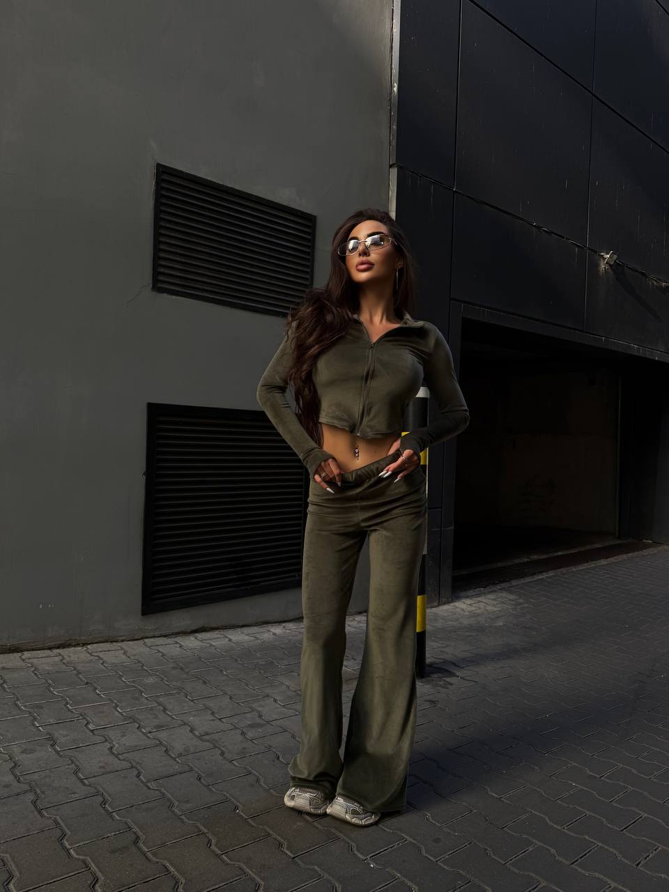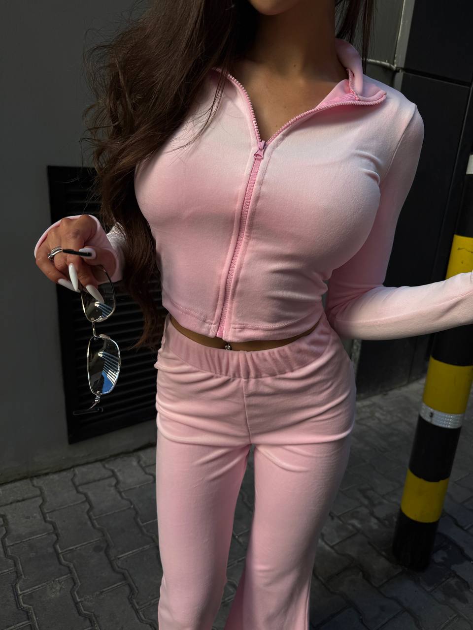 Штани кльош — подовжують силует та додають легкості образу Кофта на блискавці з отворами під пальчики — зручно та стильно Ідеально підкреслює фігуру, сидить як “друга шкіра”