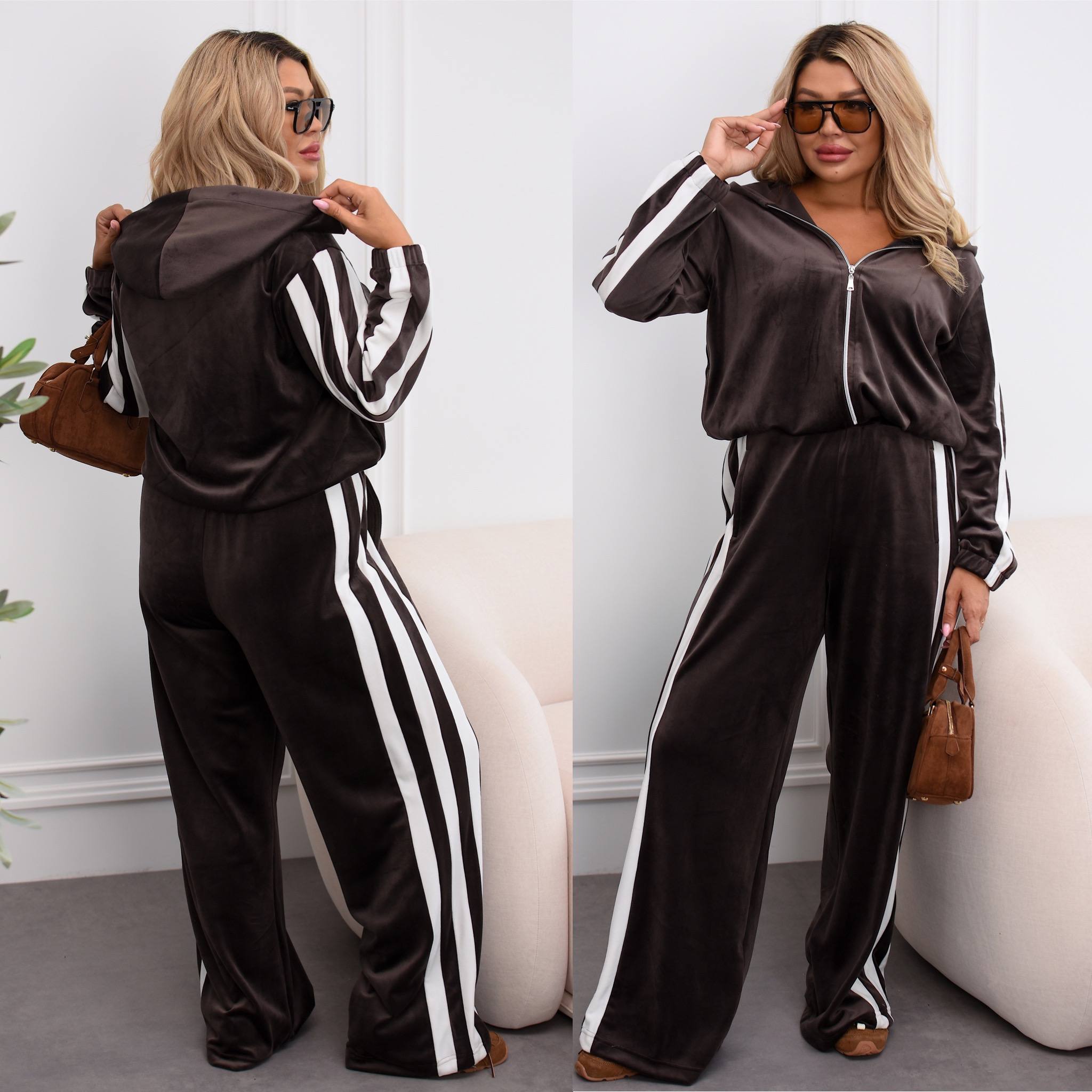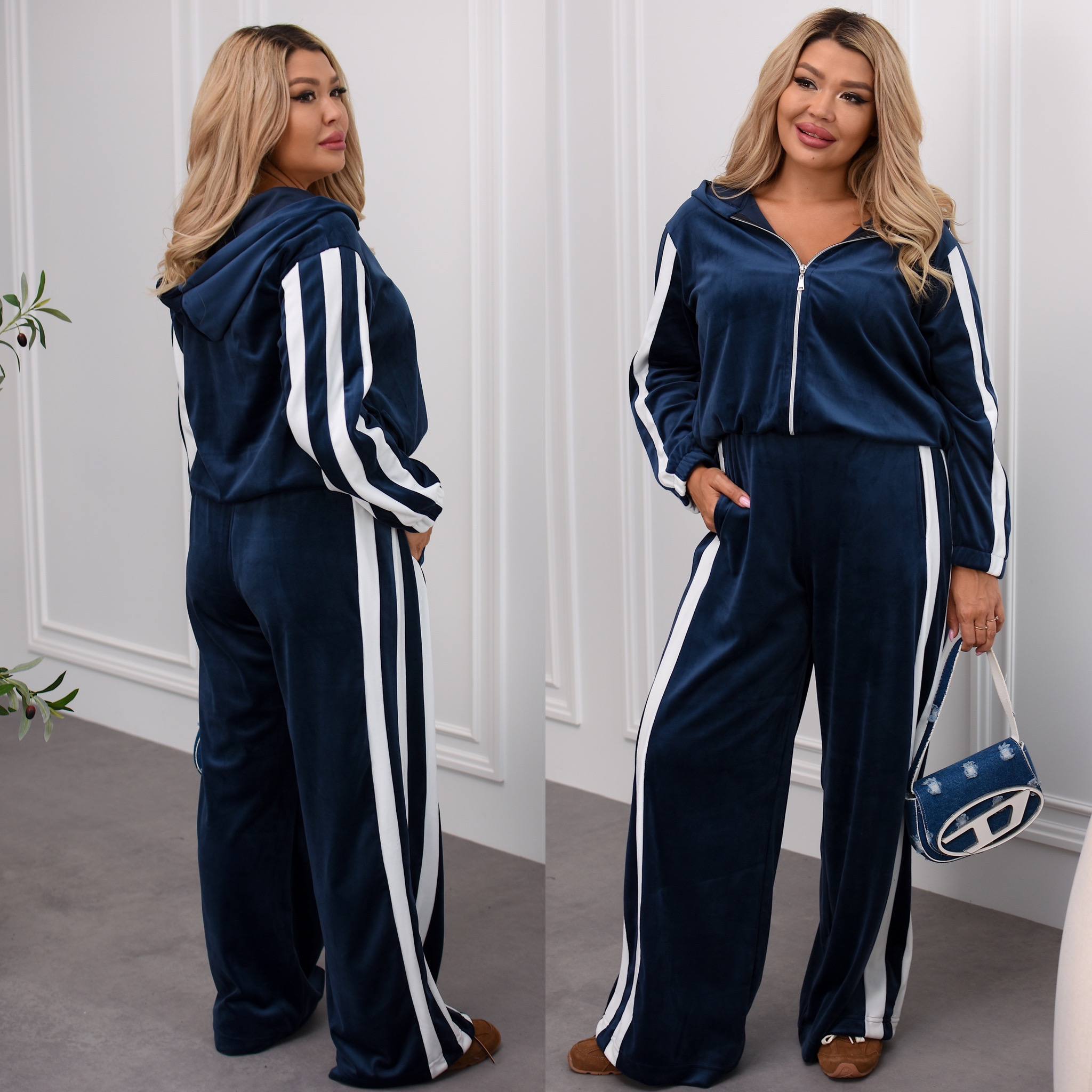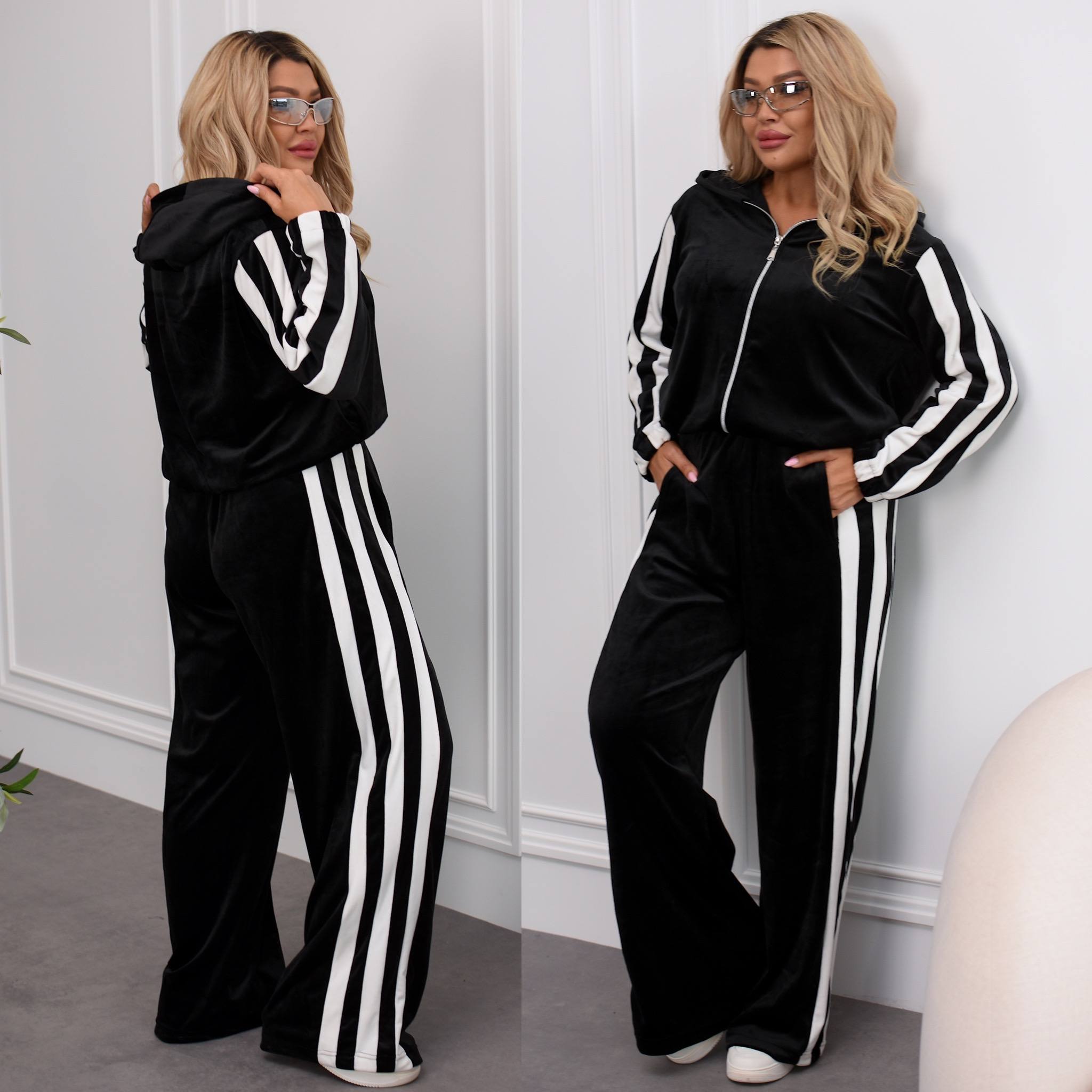 Модний та зручний комплект із м’якого велюру. Складається з кофти на блискавці з капюшоном та широких брюк палацо із високою талією . Є кишені для зручності і в кофті ,і в штанах.Костюм прикрашений контрастними білими смугами вздовж рукавів і штанів, що додає образу динамічності та візуально подовжує силует